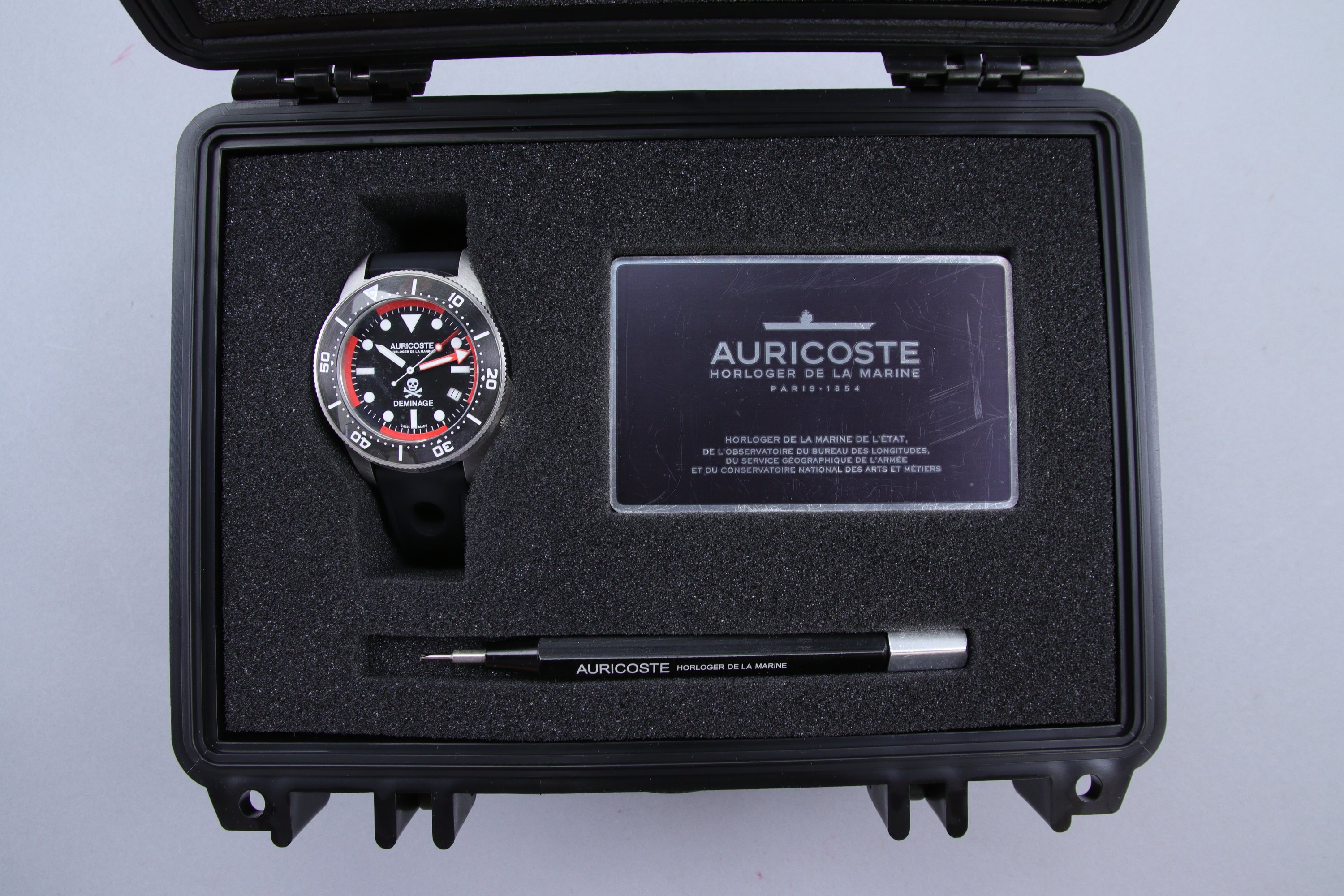 Boîtier en acier vissé, cadran circulaire à fond noir liseré rouge, signé et portant le logo de déminage. Chemin de fer pour les minutes. Lunette tournante unidirectionnelle.