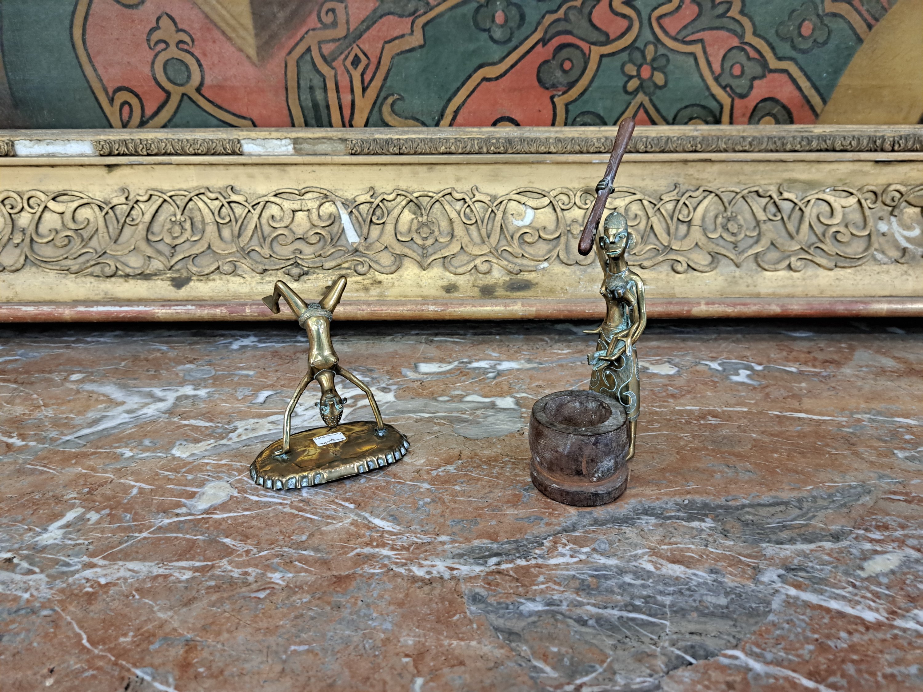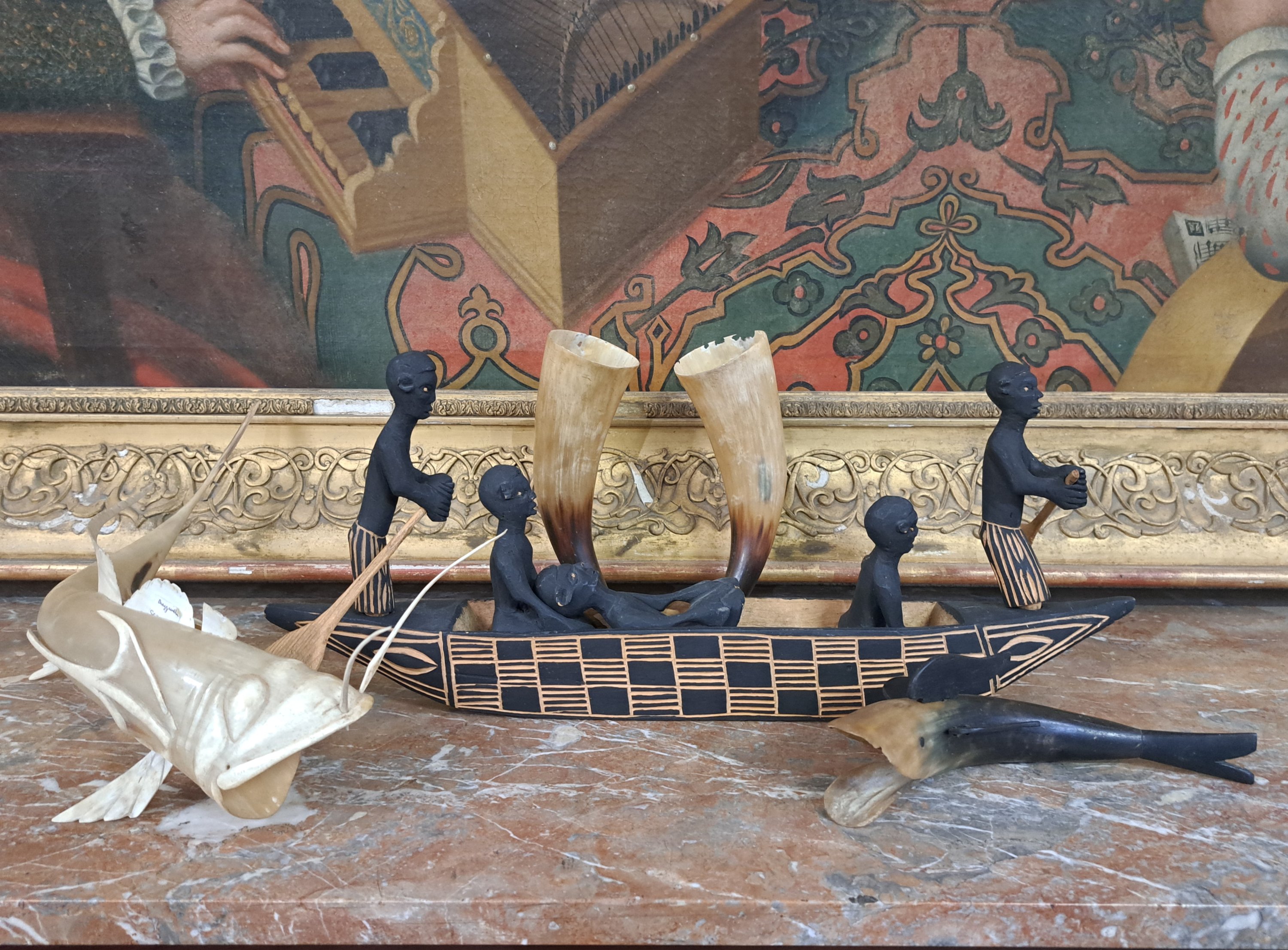 une partie bois comprenant une pirogue, un sage et une boîte anthropomorphe, l'autre en corne figurant des poissons, ainsi que deux en bronze doré.