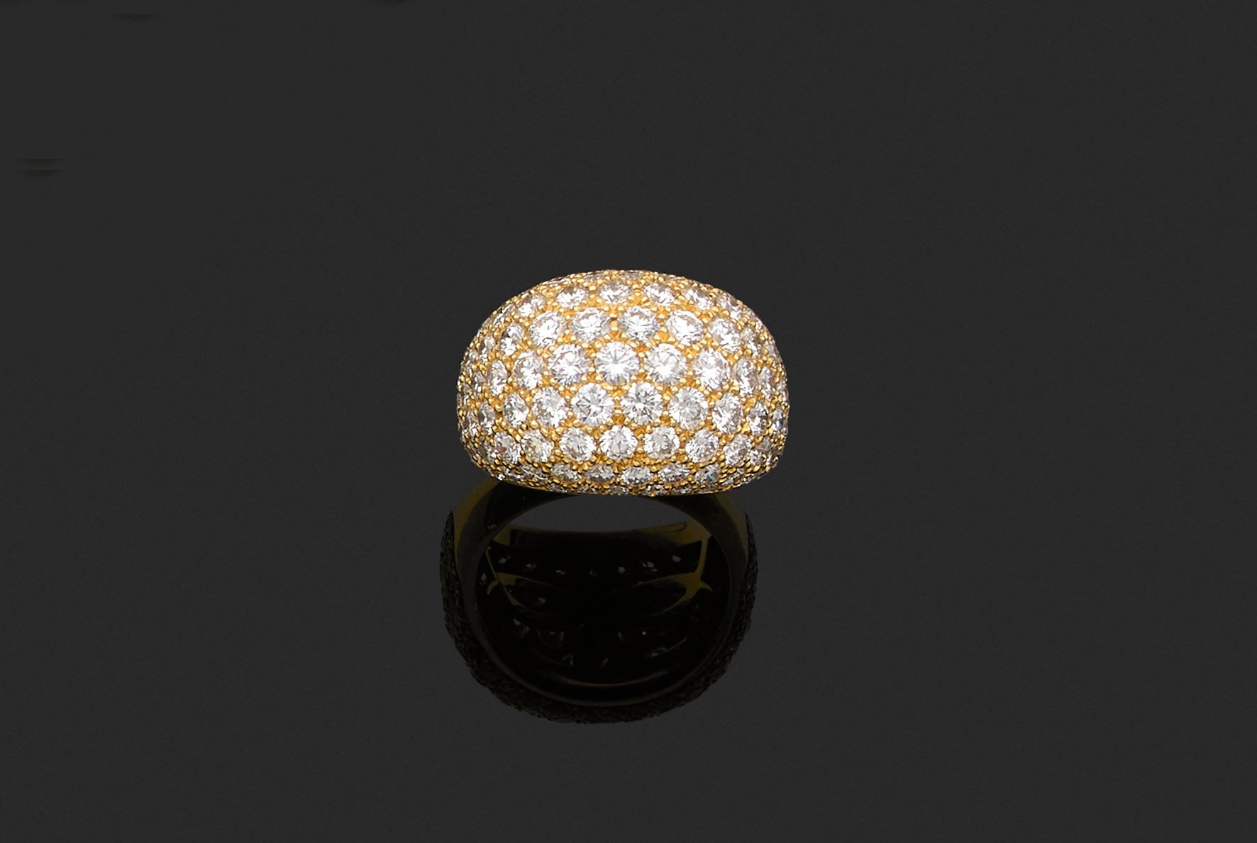 en or jaune 750 millièmes, le centre de forme bombée, pavée de diamants ronds de taille brillant.