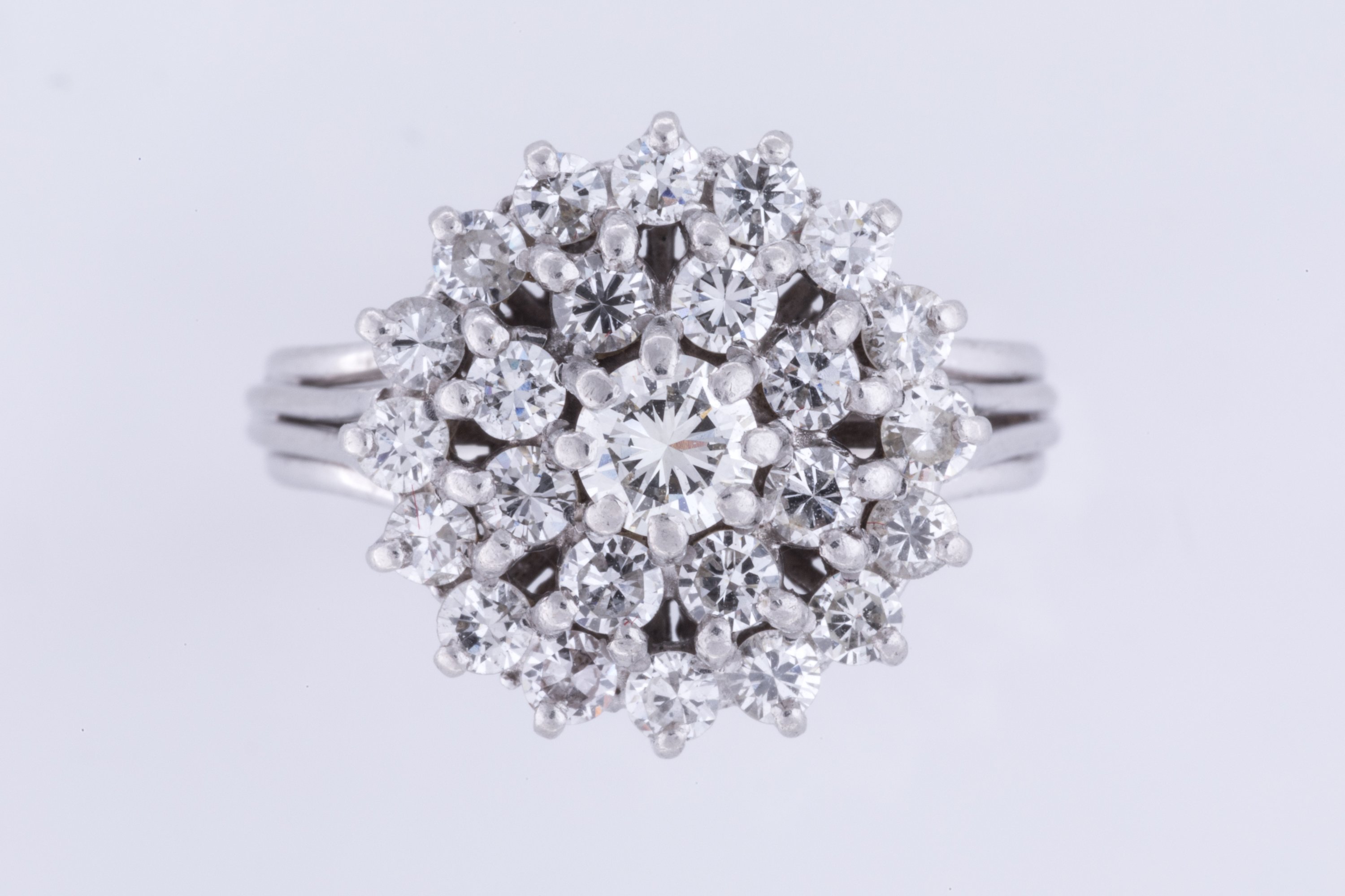 en or gris 750 millièmes, le centre à décor de fleurettes entièrement serti de diamants ronds de taille brillant, un plus important d'environ 0,20/0,30 ct.