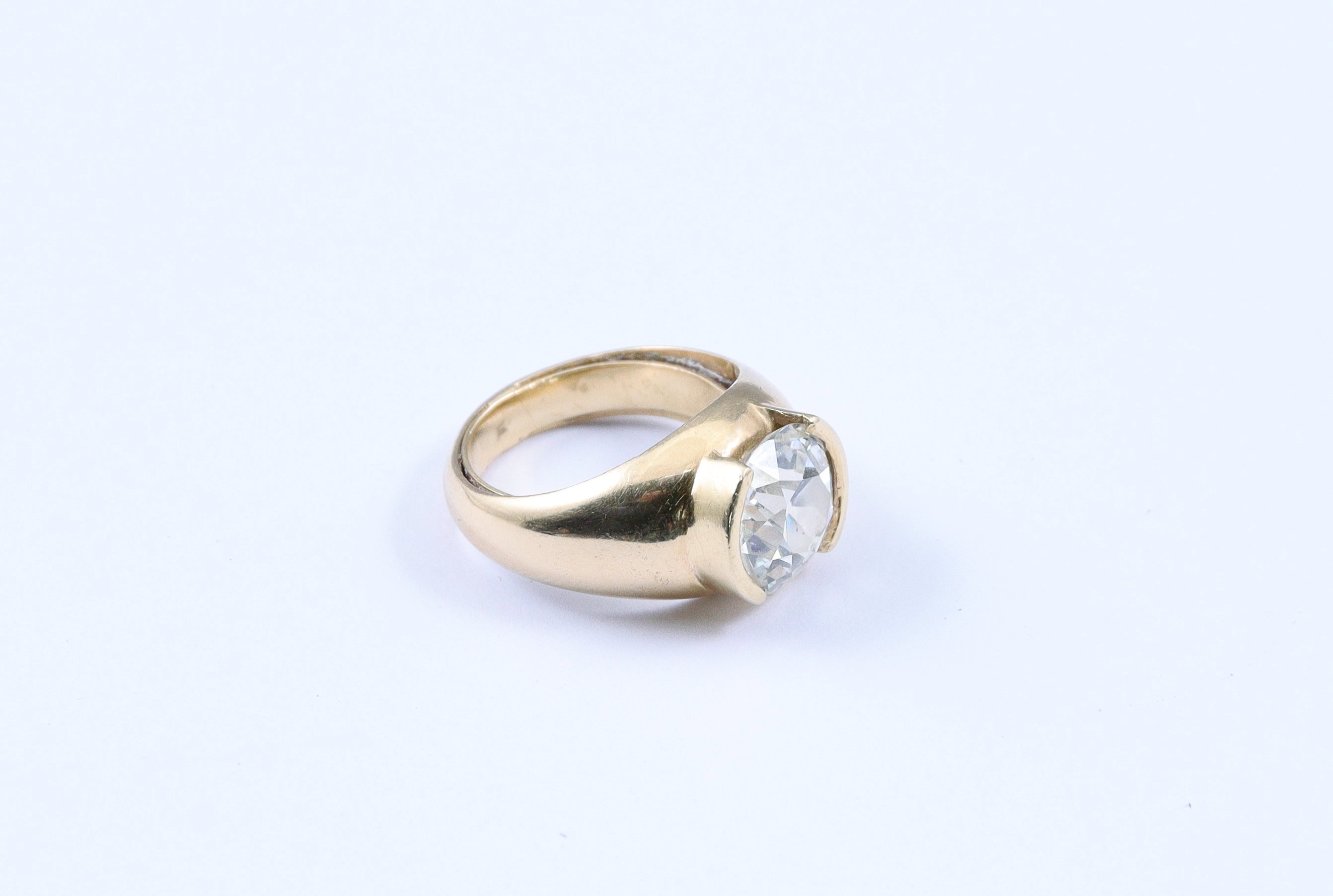 en or jaune 750 millièmes ornée au centre d'un diamant rond de taille ancienne demi serti-clos, d'environ 3,00/3.30 ct.