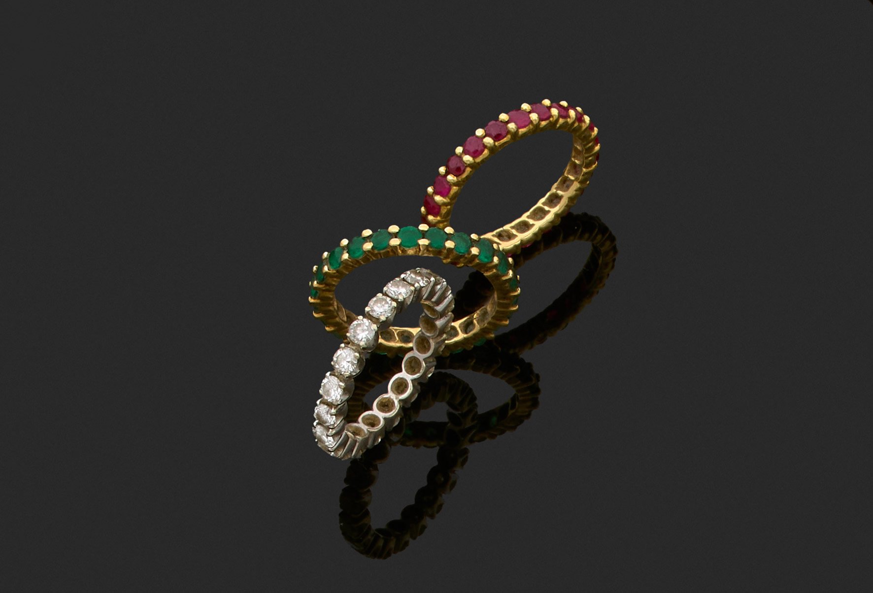 en or 750 millièmes, chacune entièrement sertie d'émeraudes, rubis ou diamants ronds de taille brillant : 20 diamants pour un total d'environ 1 ct.