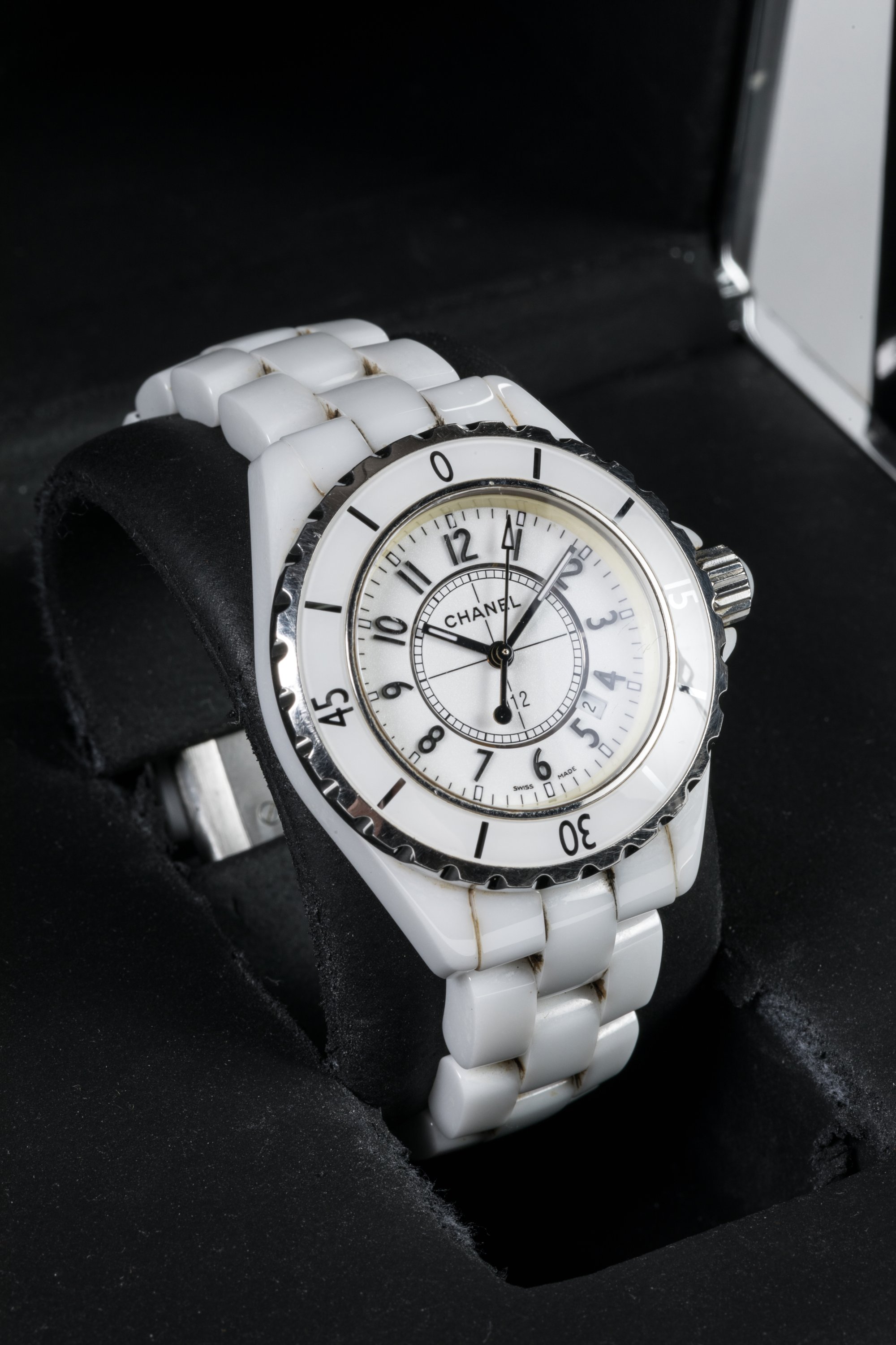 en céramique blanche et acier. Boîtier rond. Cadran blanc, chiffres arabes en applique, guichet dateur à 4h30, trotteuse centrale. Mouvement à quartz. Fond à vis.
