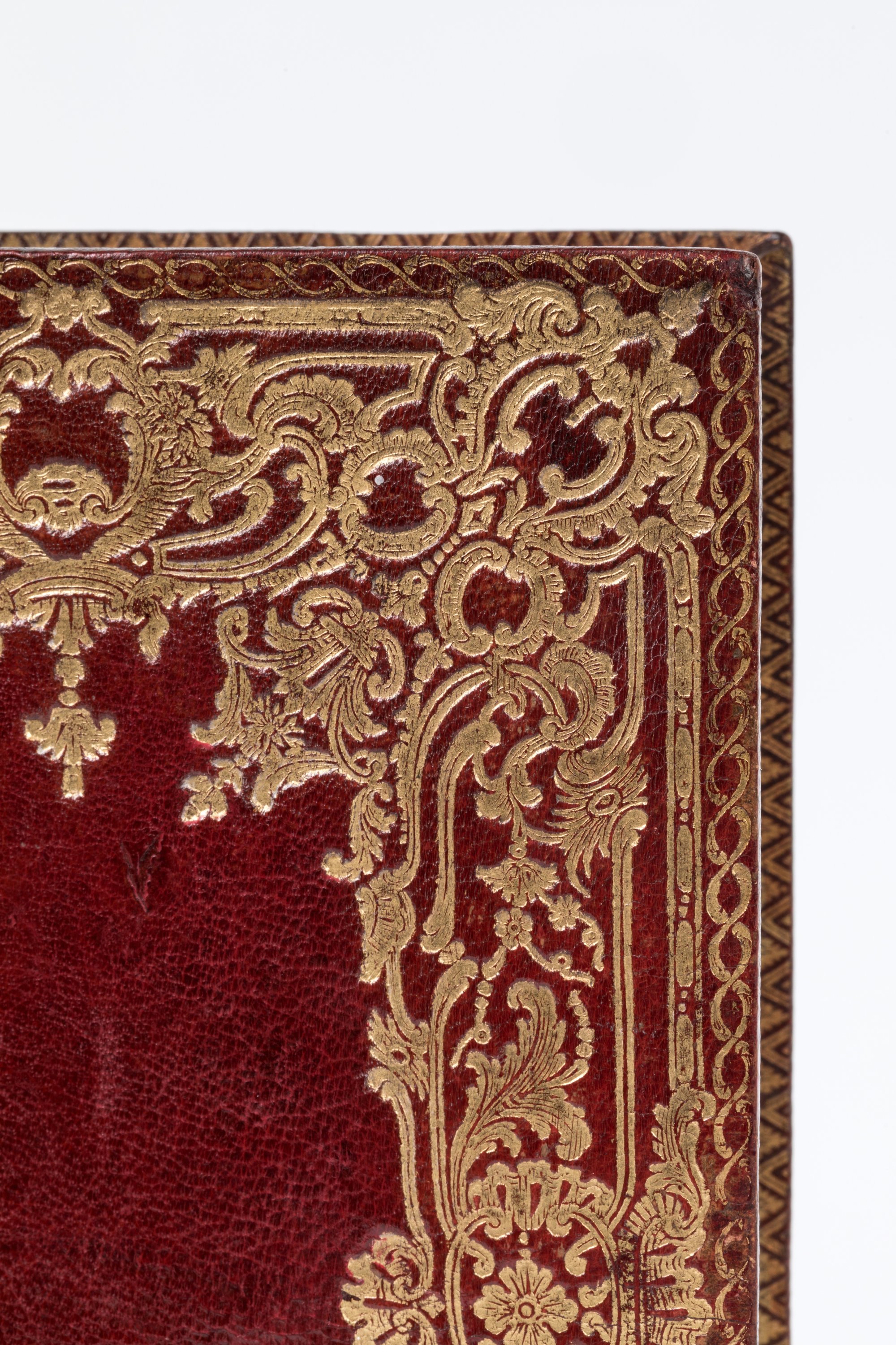 In-8, 542 pages. Plein maroquin rouge, orné d'une riche plaque de Pierre-Paul Dubuisson. Dos à 5 nerfs, orné de fleurs-de-lys, roulette sur les coupes ; superbes gardes en papier d'Augsburg à ramages vert céladon sur fond d'or. Toutes tranches dorées.