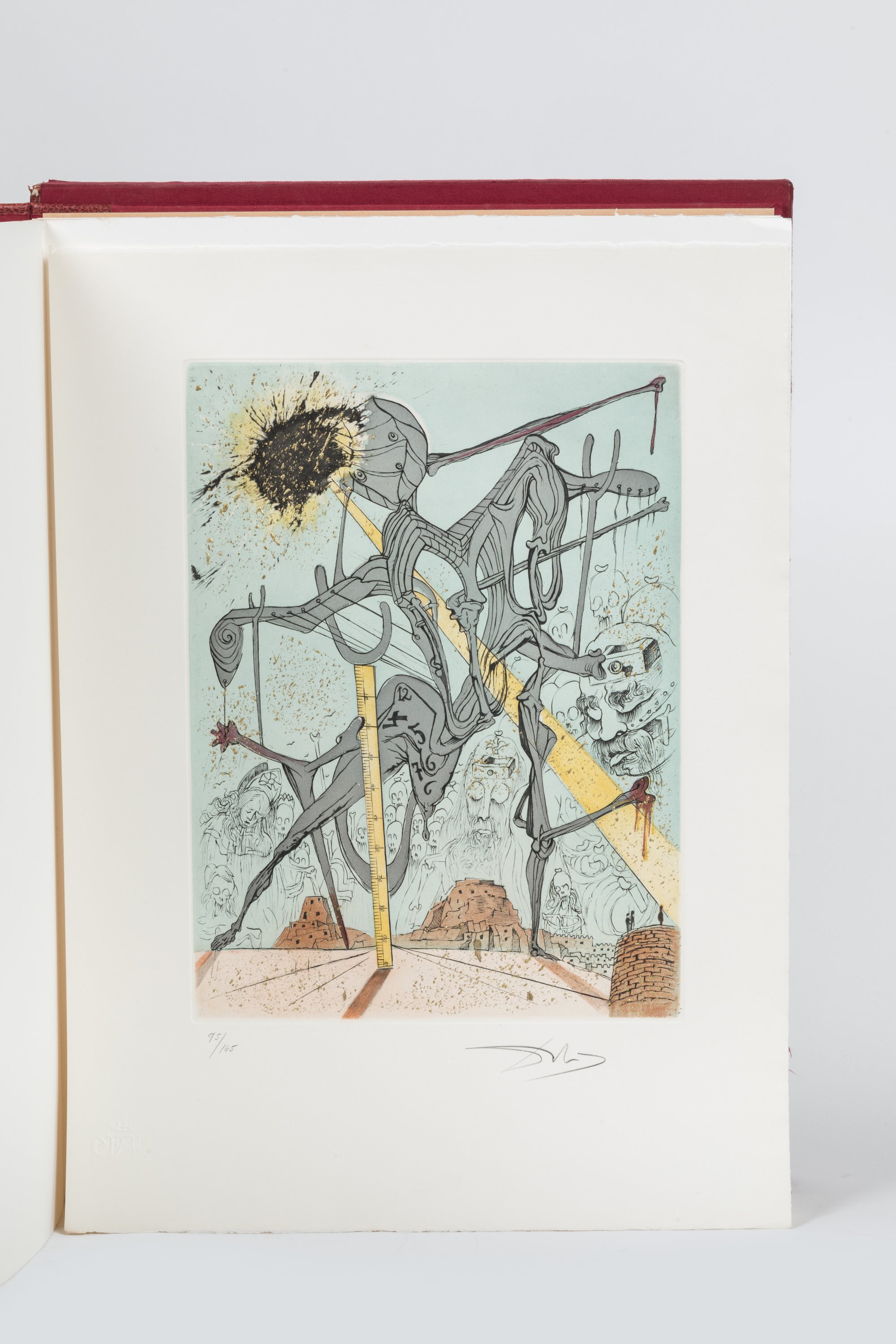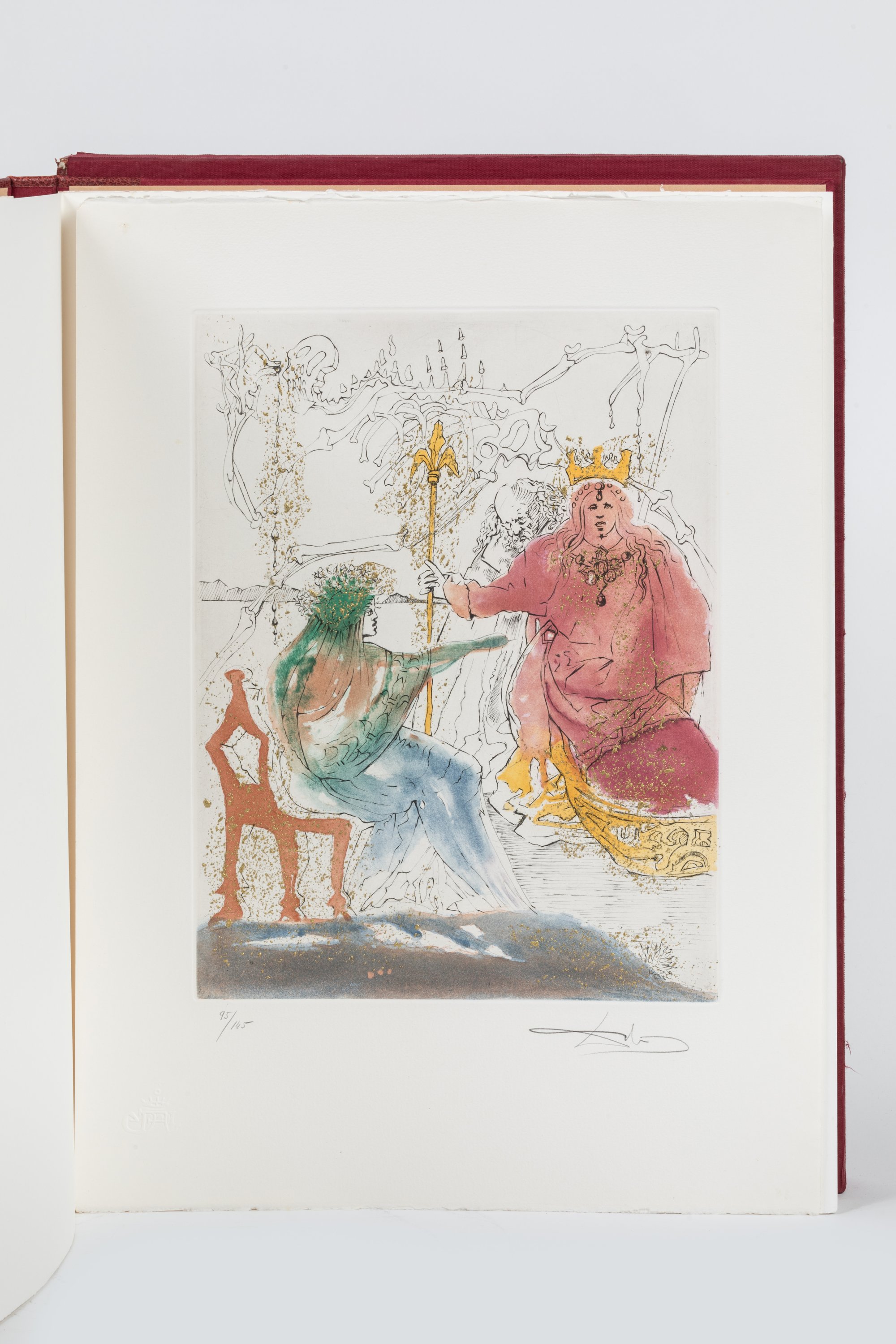 Suite complète des dix eaux-fortes en couleurs de Salvador Dali, précédées de six pages en anglais et en français pour le titre, la liste des eaux-fortes et la date d'impression. Les eaux-fortes sont rehaussées d'applications de poudre d'or, frappées du timbre sec de l'artiste et signées par lui au crayon. Elles sont présentées dans des feuilles in-plano pliées portant le titre de la planche en anglais et en français.