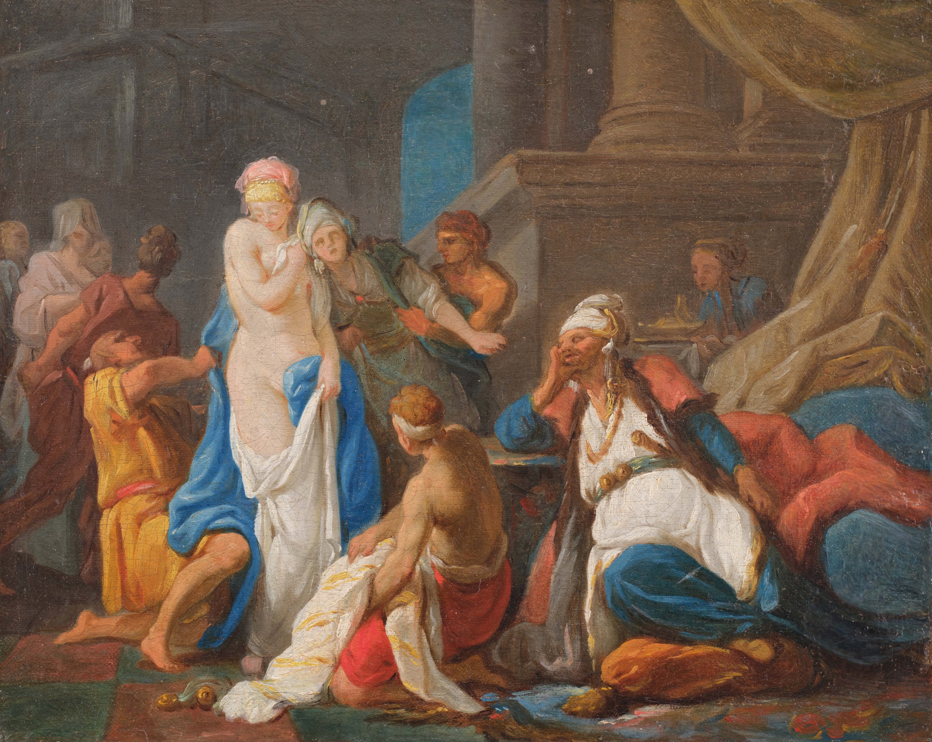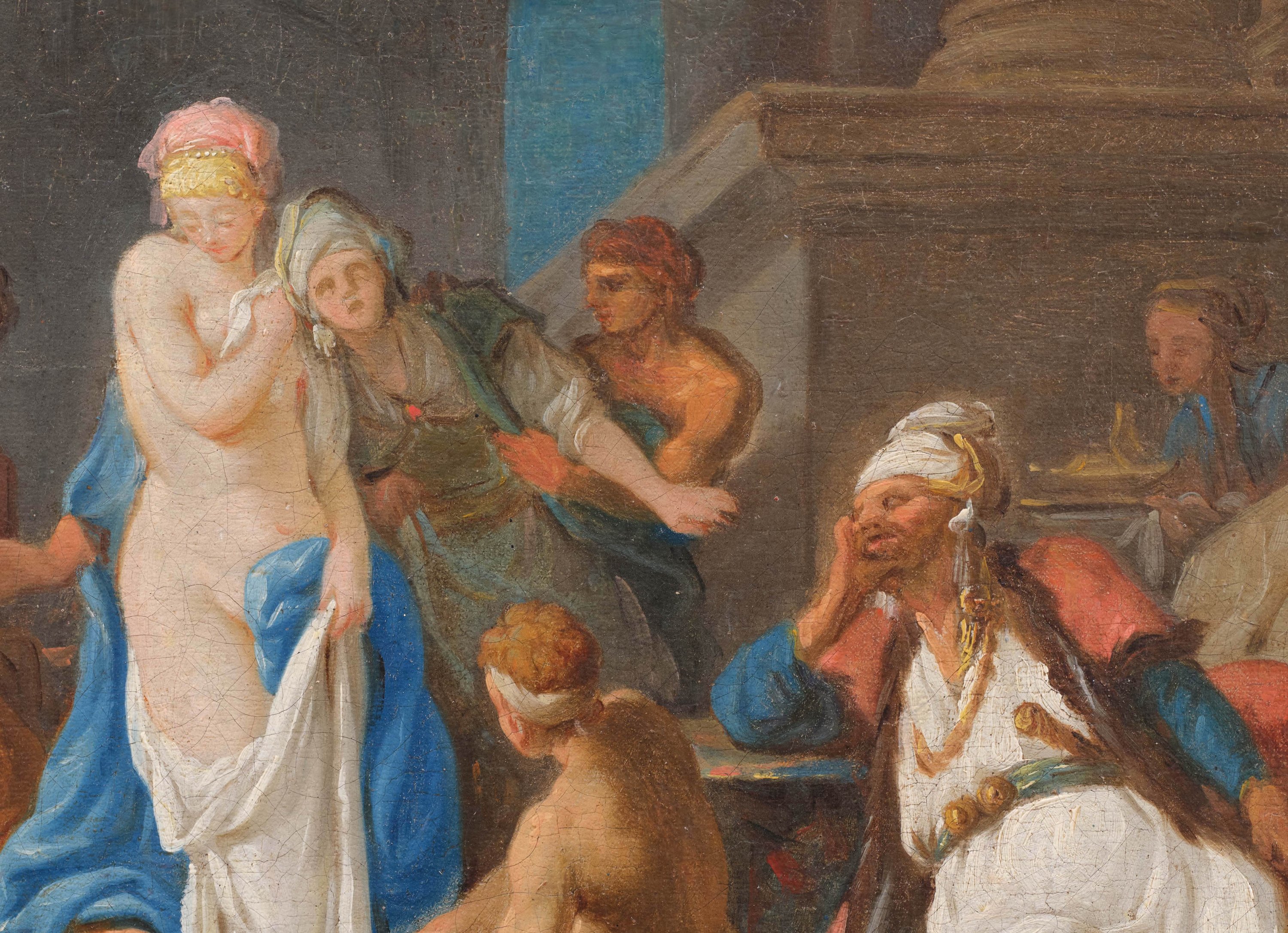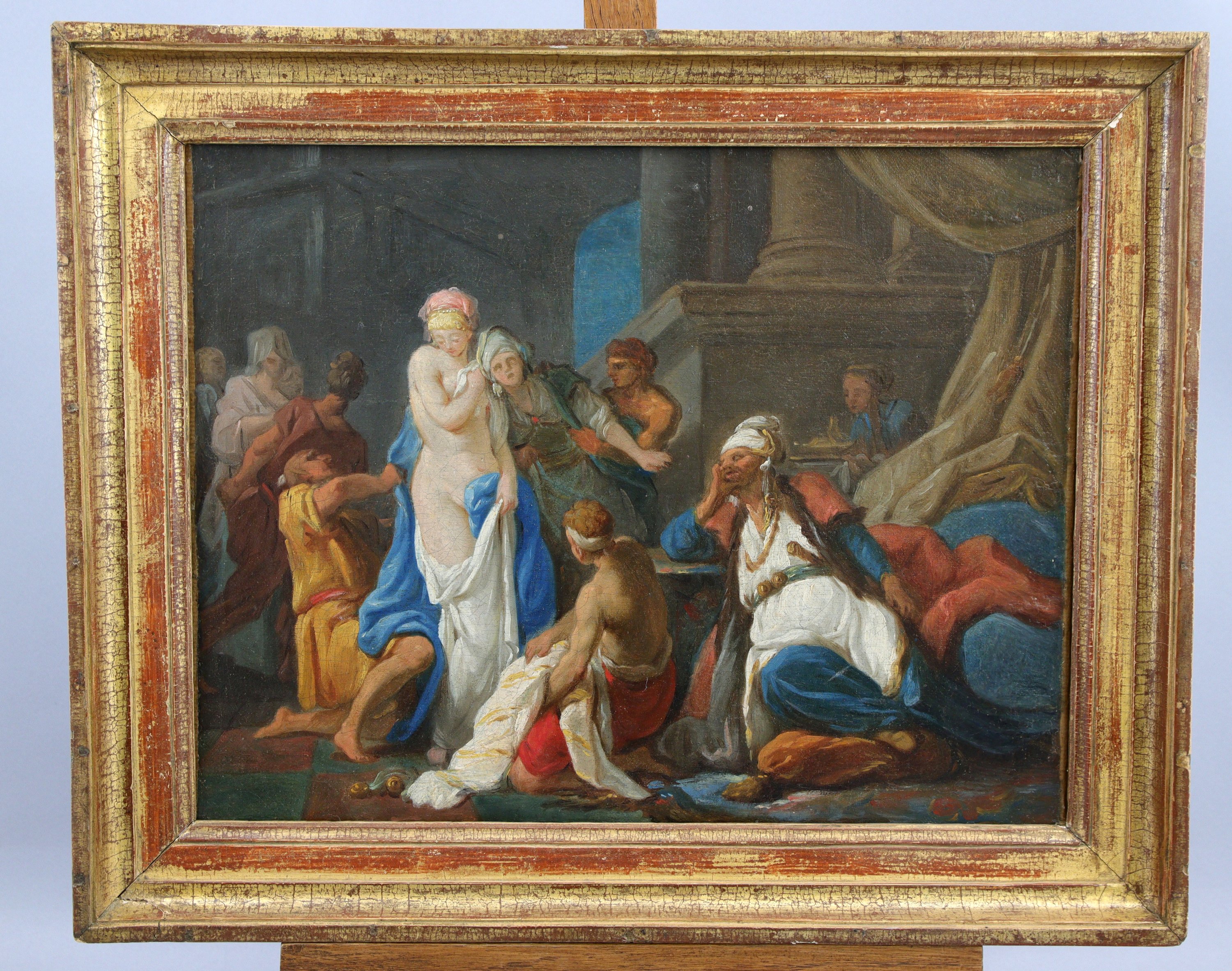 Attributed to Blaise Nicolas Lesueur. A painting of a sultan in his harem. In a giltwood frame.