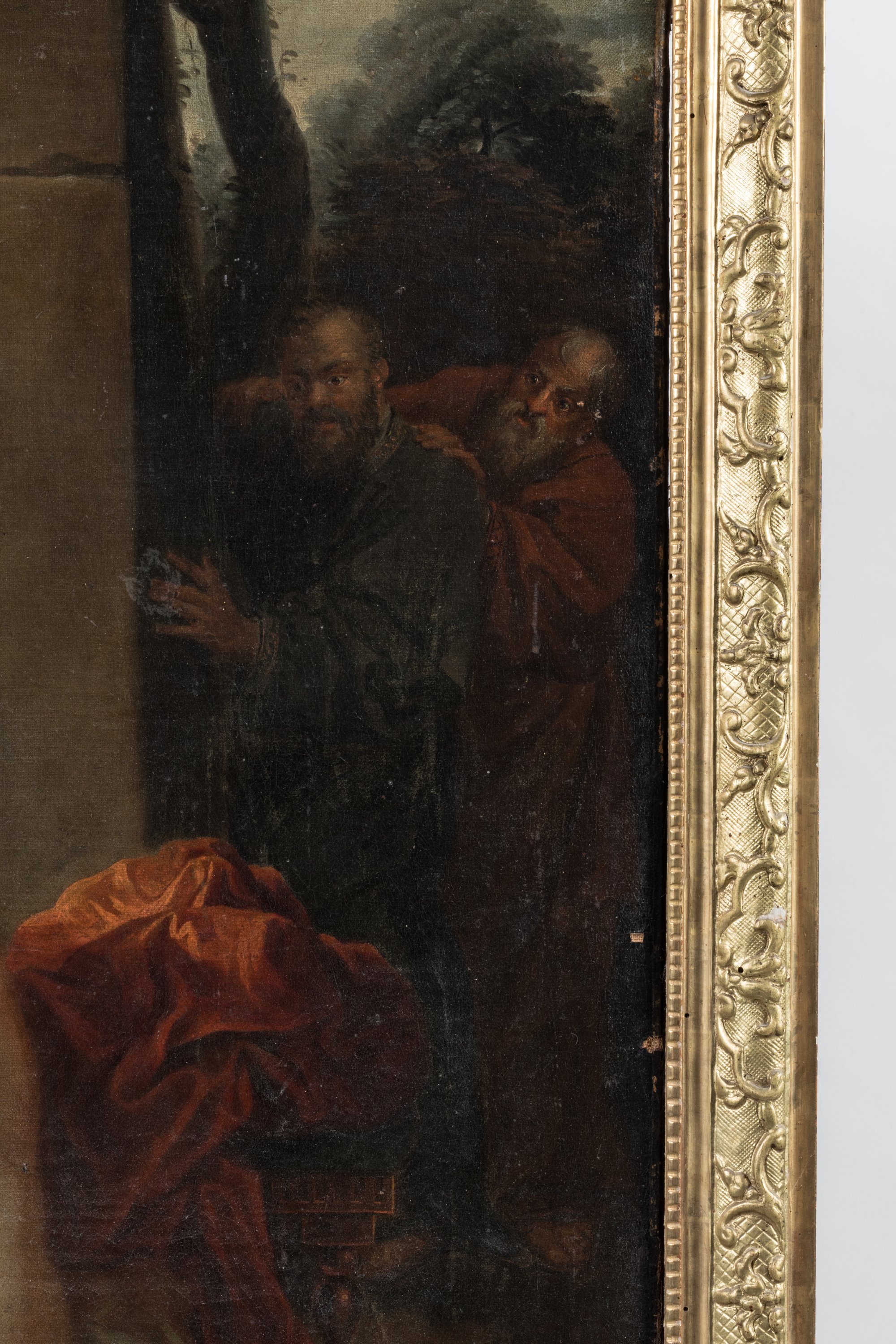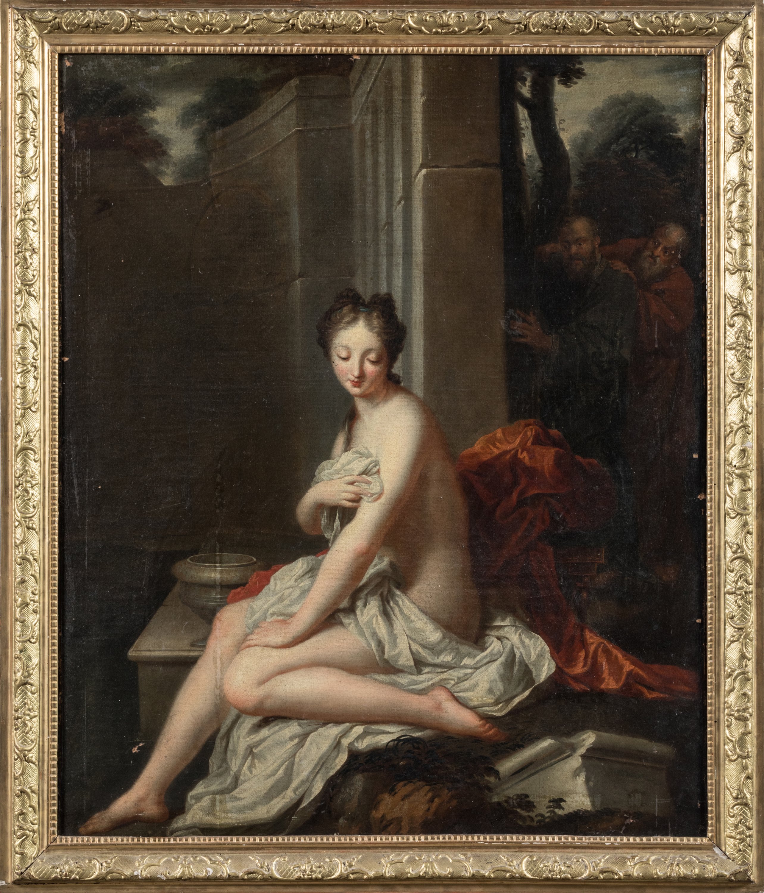 Entourage of Jean-Baptiste Santerre. A painting depicting "Suzanne and the Old Men". In a carved gilded wood and stucco frame.