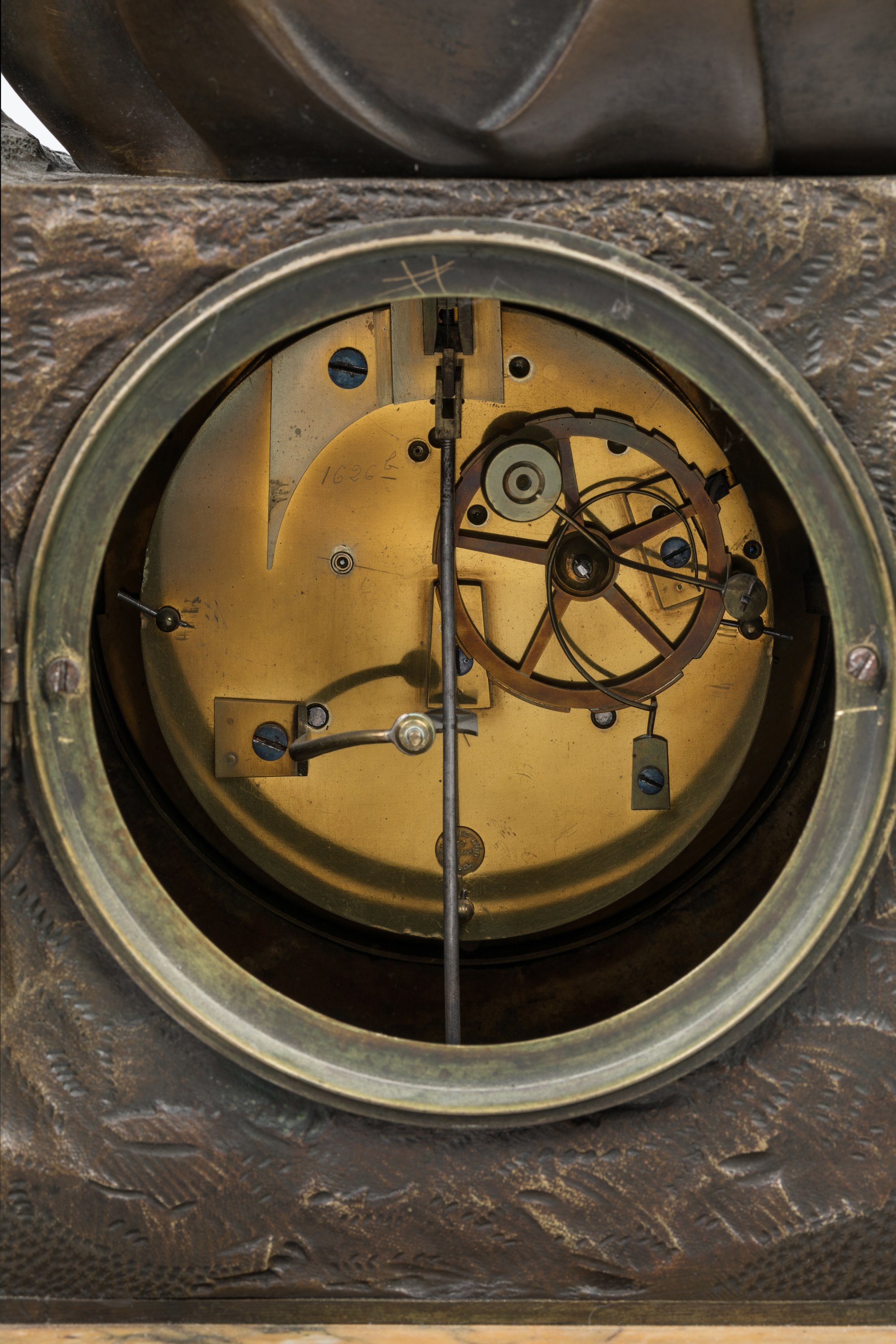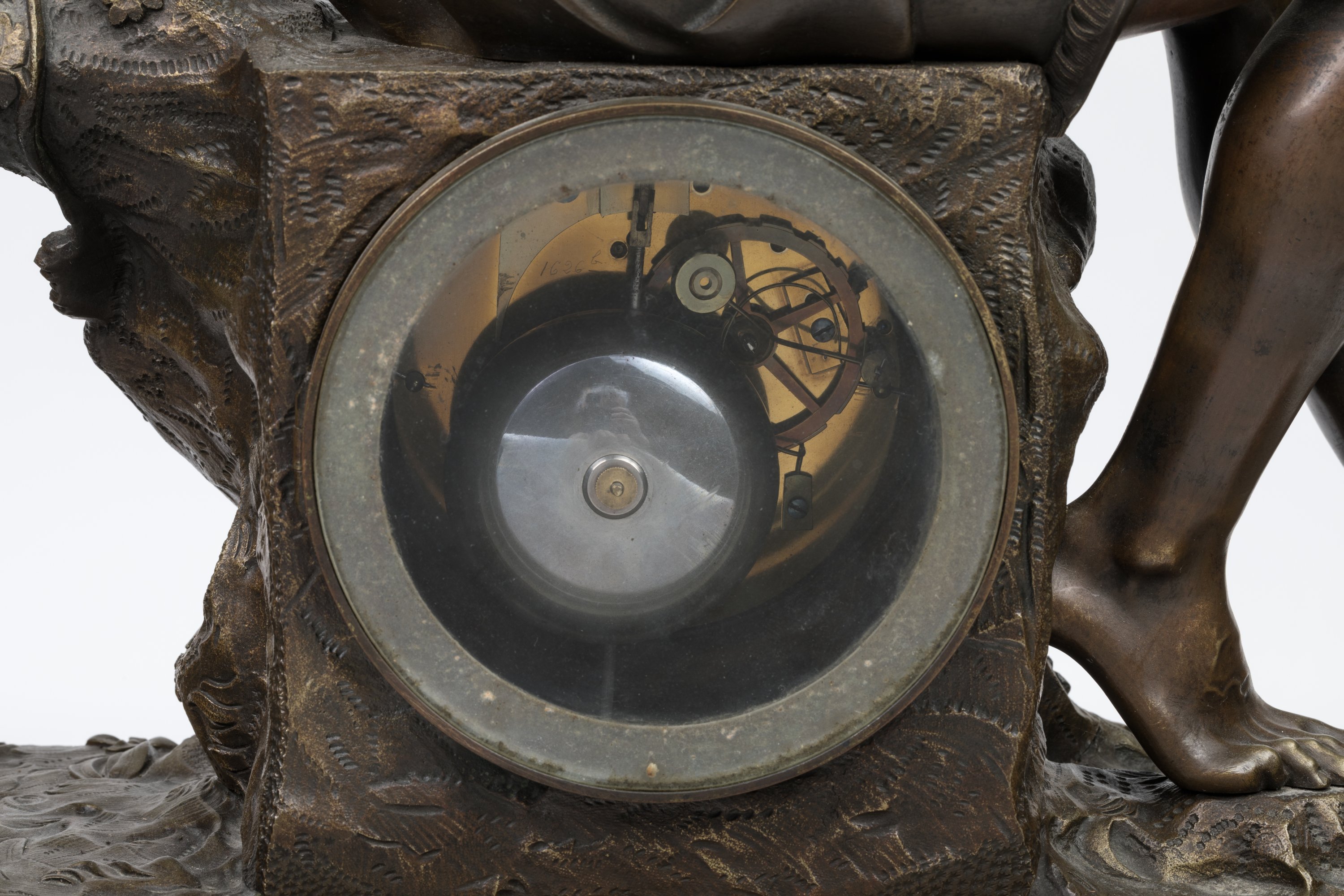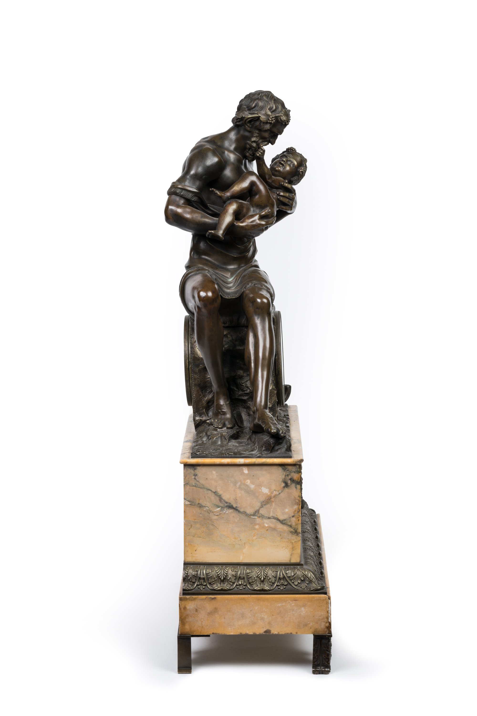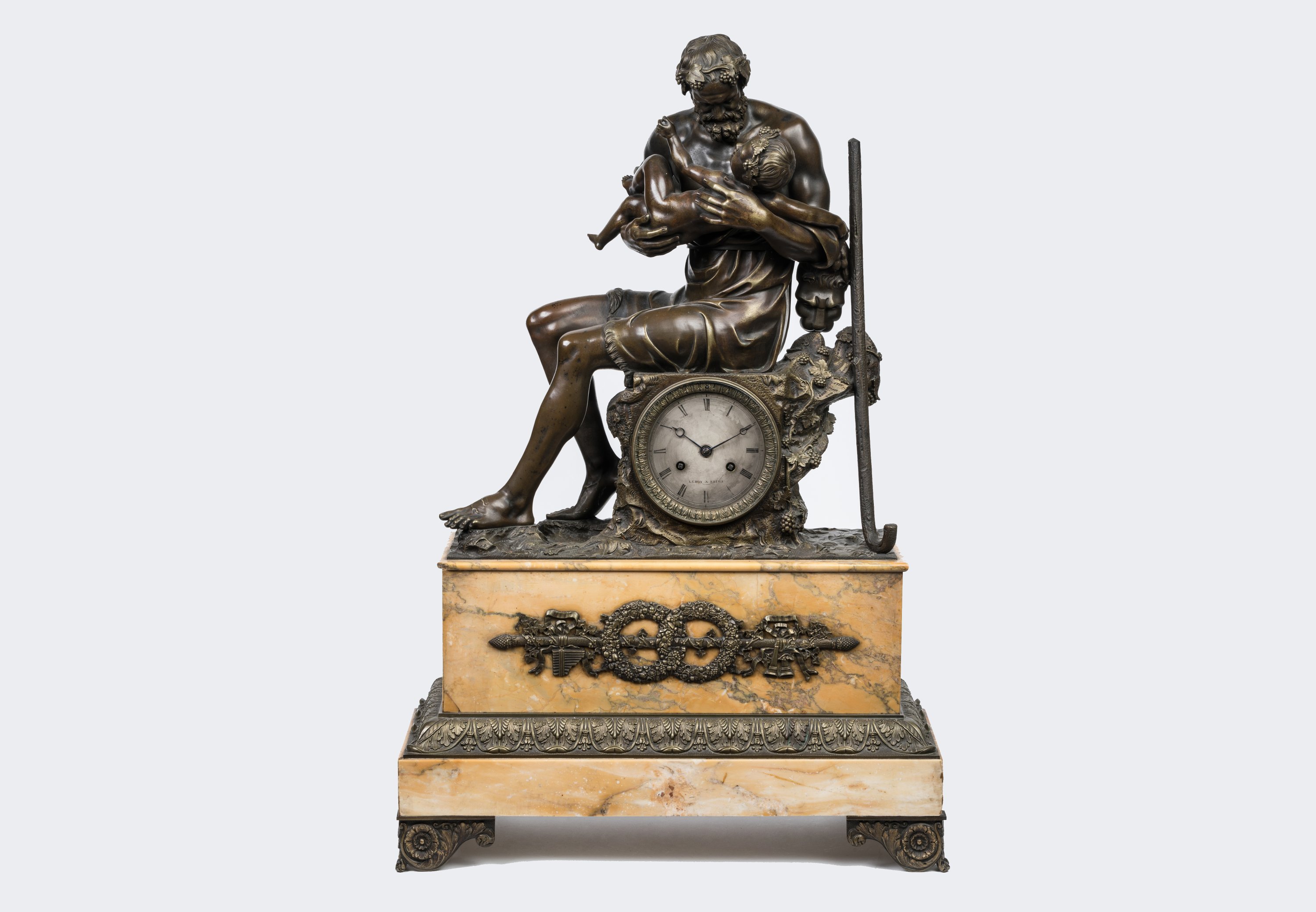en bronze patiné, figurant Silène s'occupant du jeune Bacchus dans un riche décor naturaliste de végétaux et pampres de vignes. Le cadran, signé "Leroy à Reims", indique les heures en chiffres romains et les minutes en chemin de fer, clé de remontage et de sonnerie à quatre et huit heures. Mouvement numéroté portant un cachet " Pons Médaille d'Or Paris 1827".