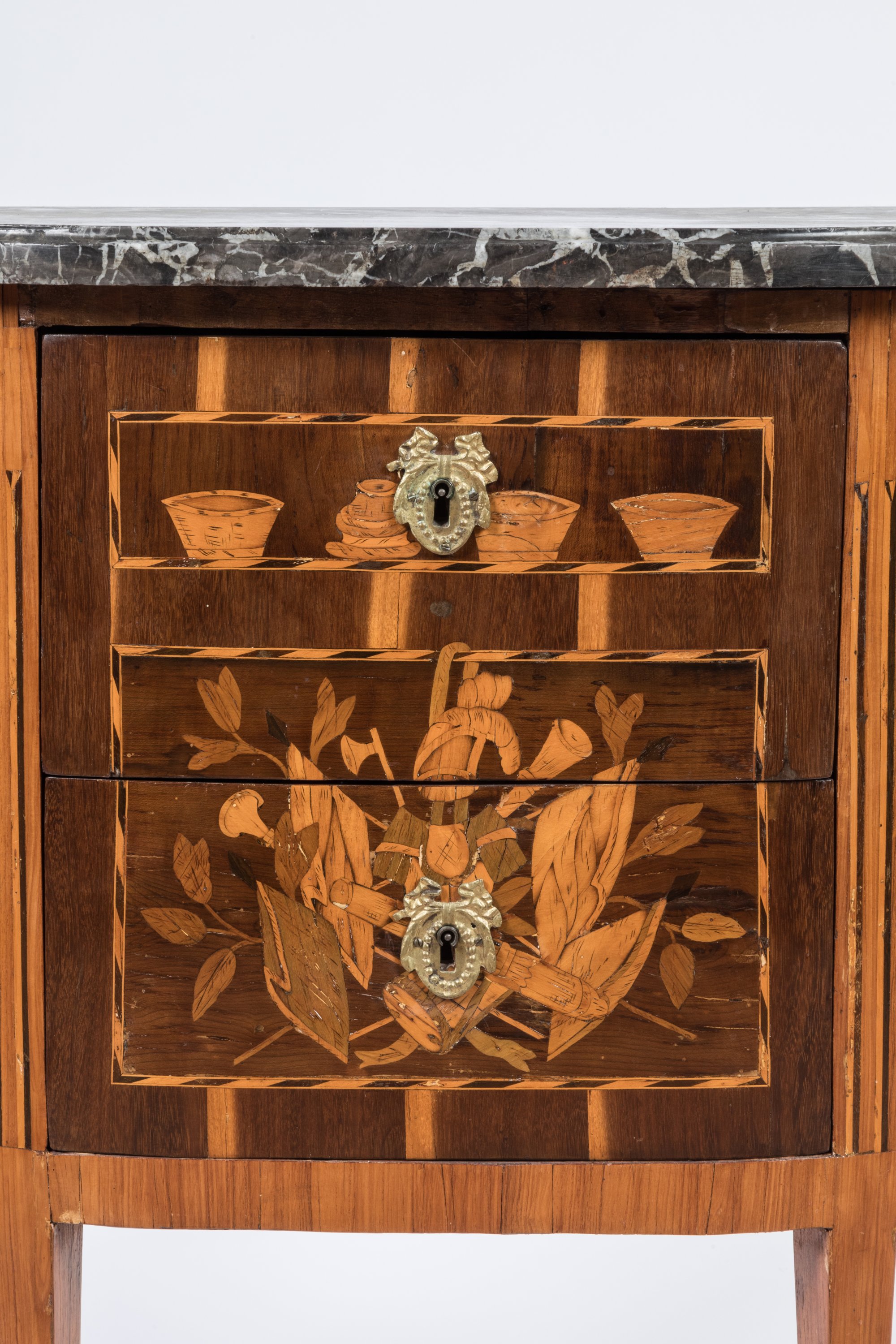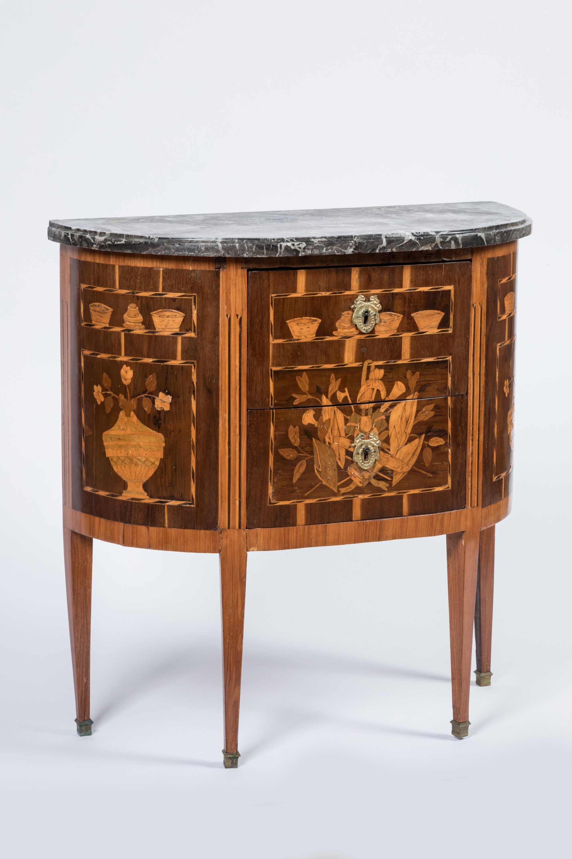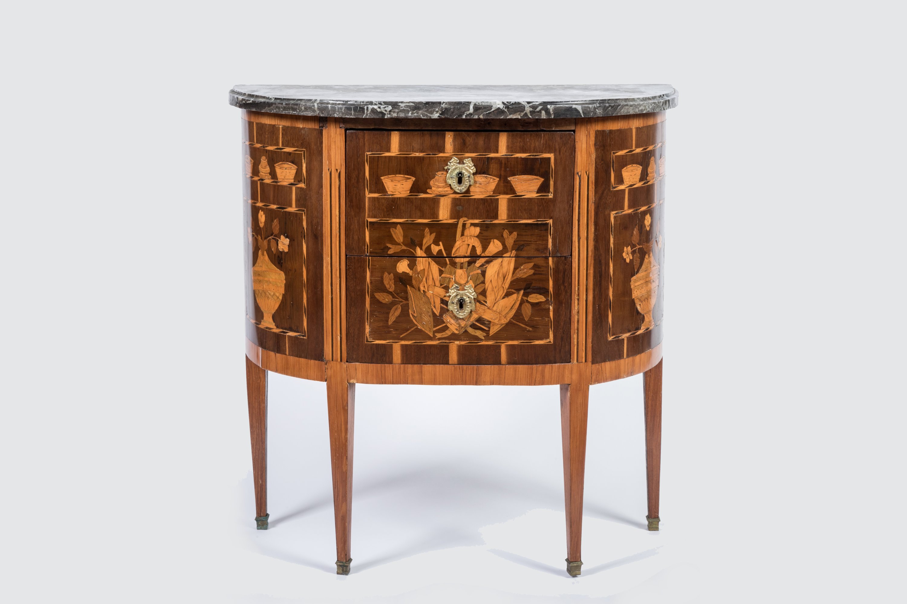Attributed to Fidelys Schey. A half-moon rosewood, amaranth, boxwood and sycamore veneer chest of drawers. Brass mounts. Grey marble top.