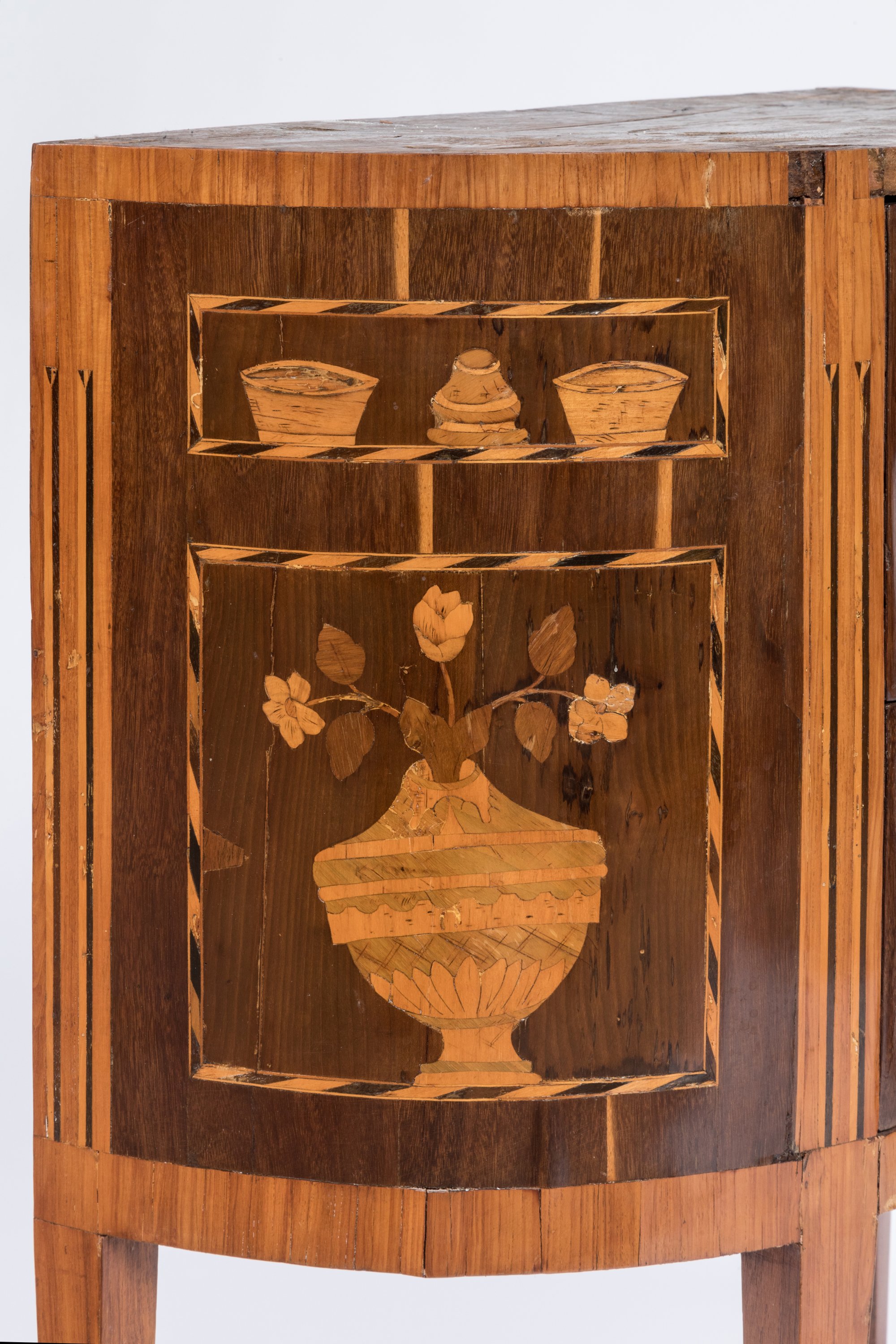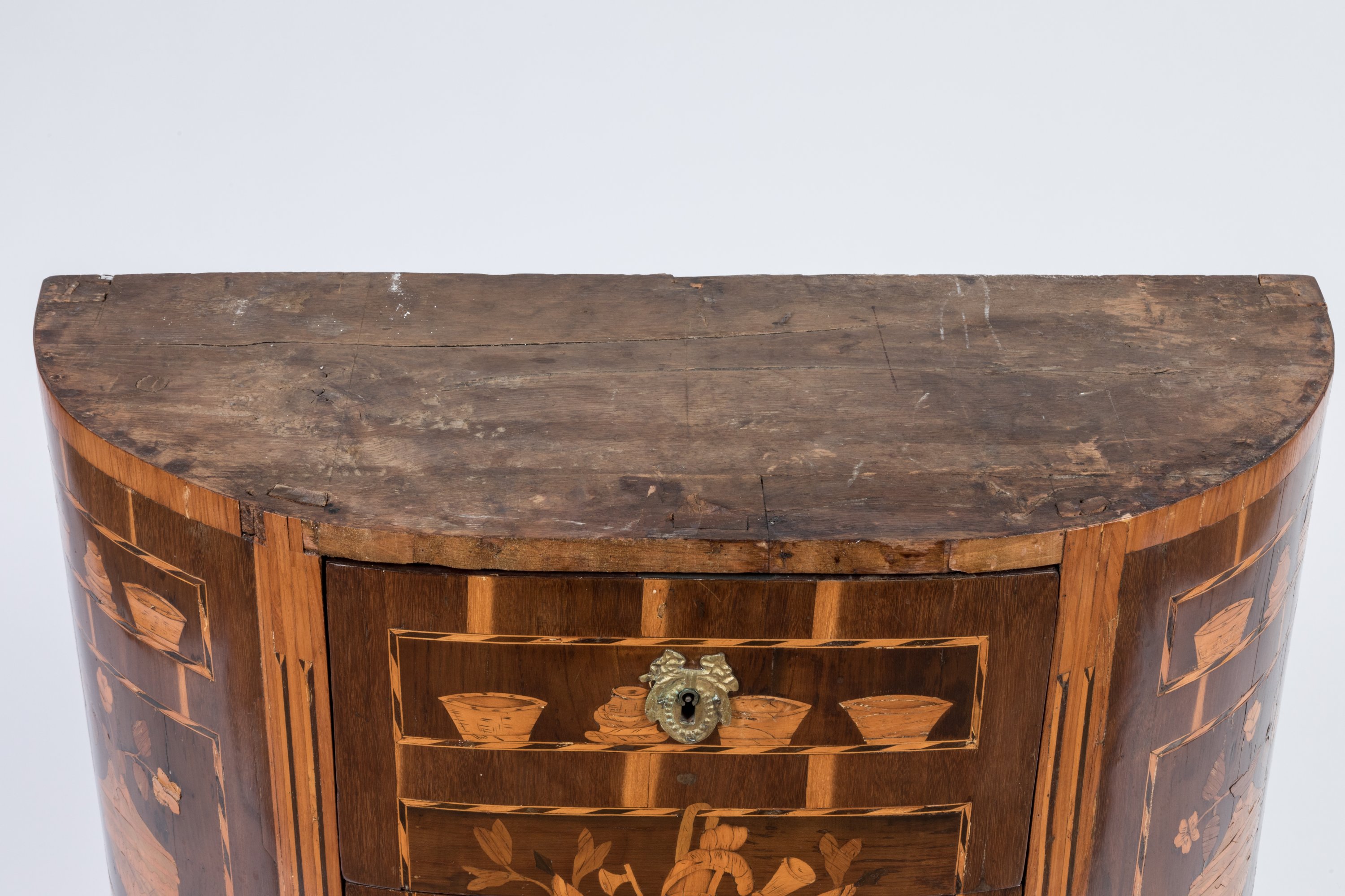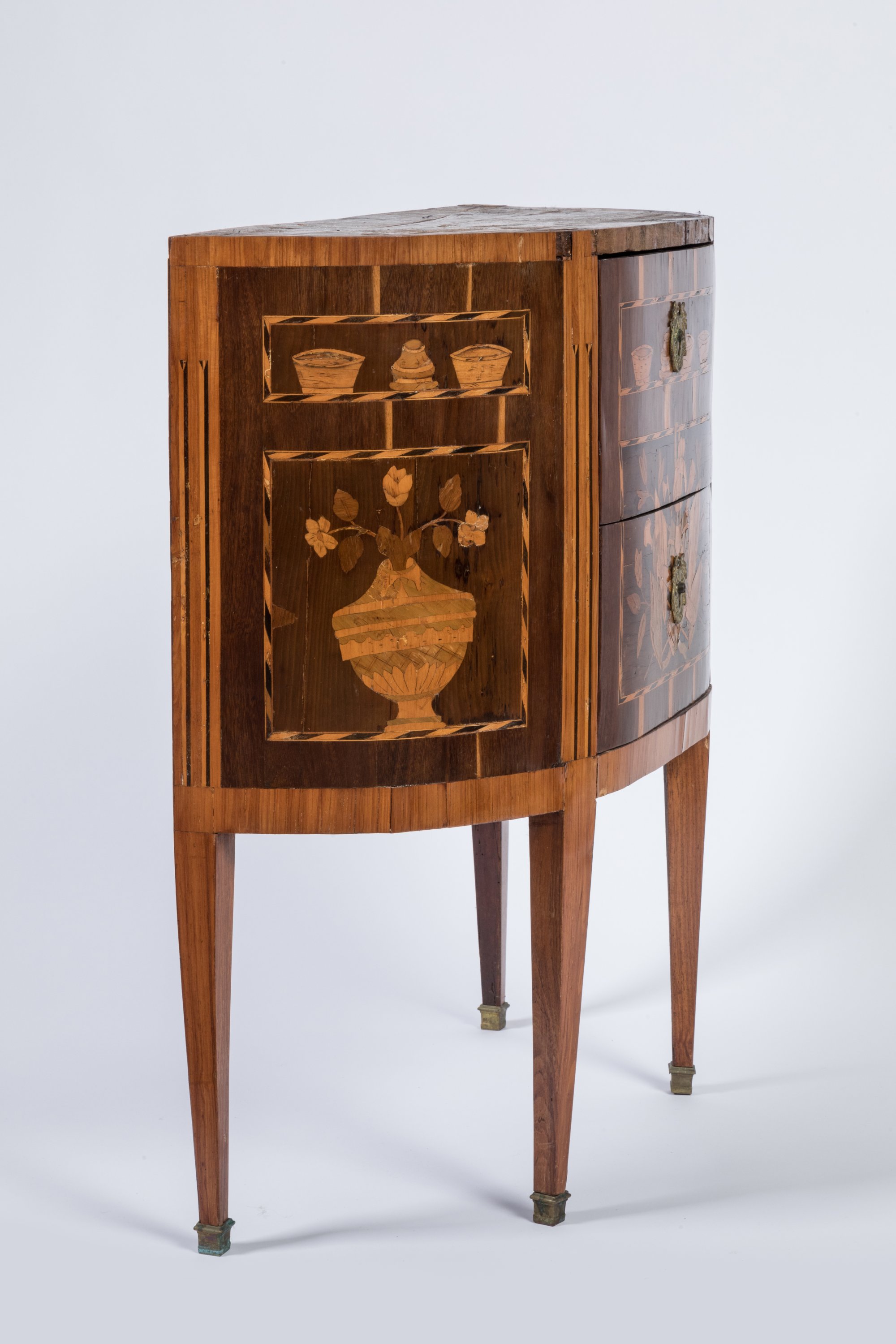 Attributed to Fidelys Schey. A half-moon rosewood, amaranth, boxwood and sycamore veneer chest of drawers. Brass mounts. Grey marble top.