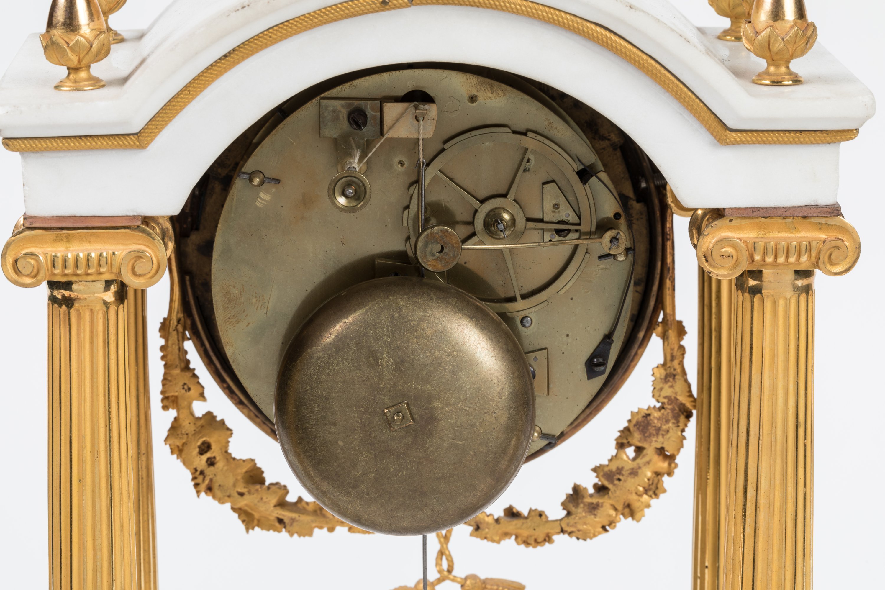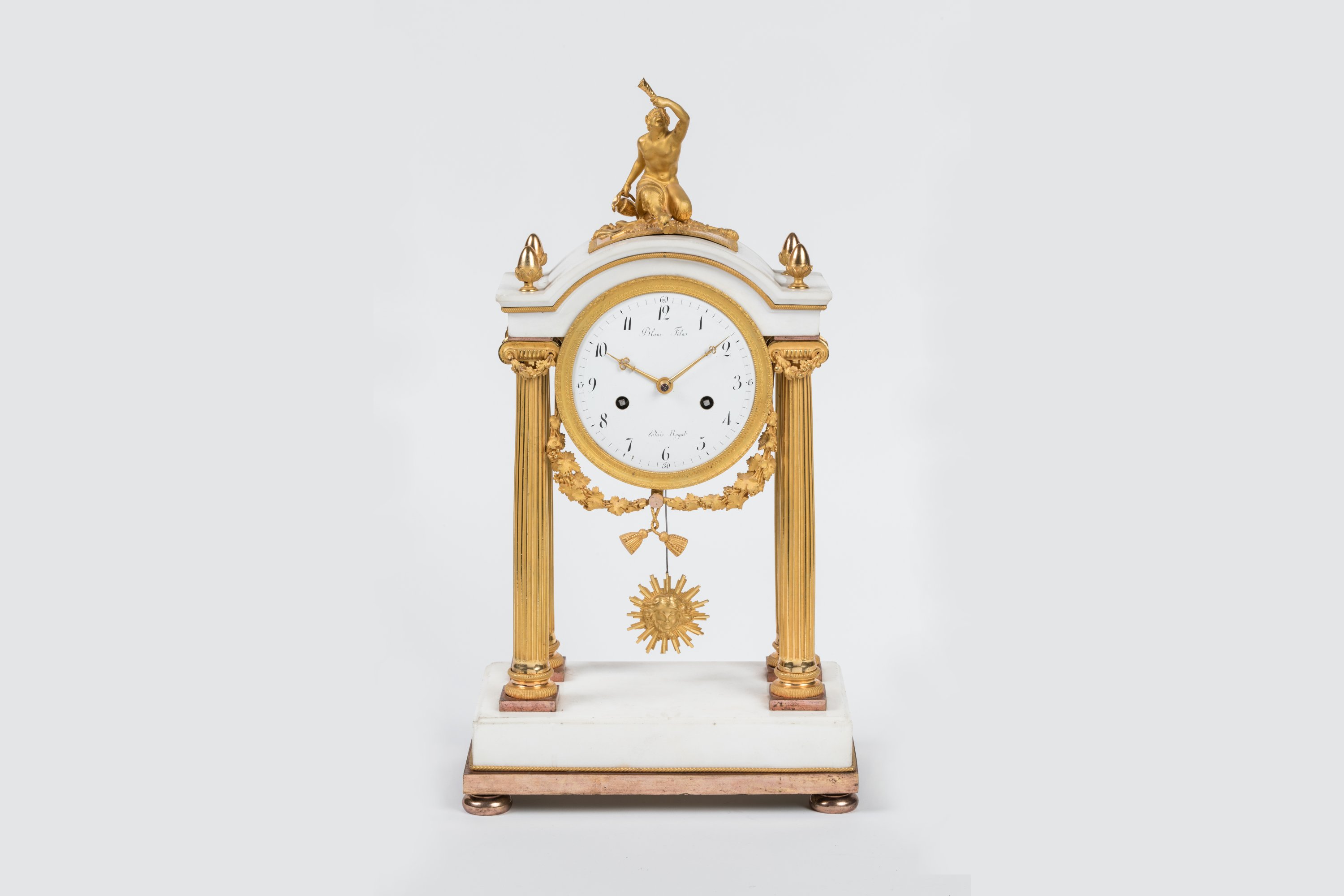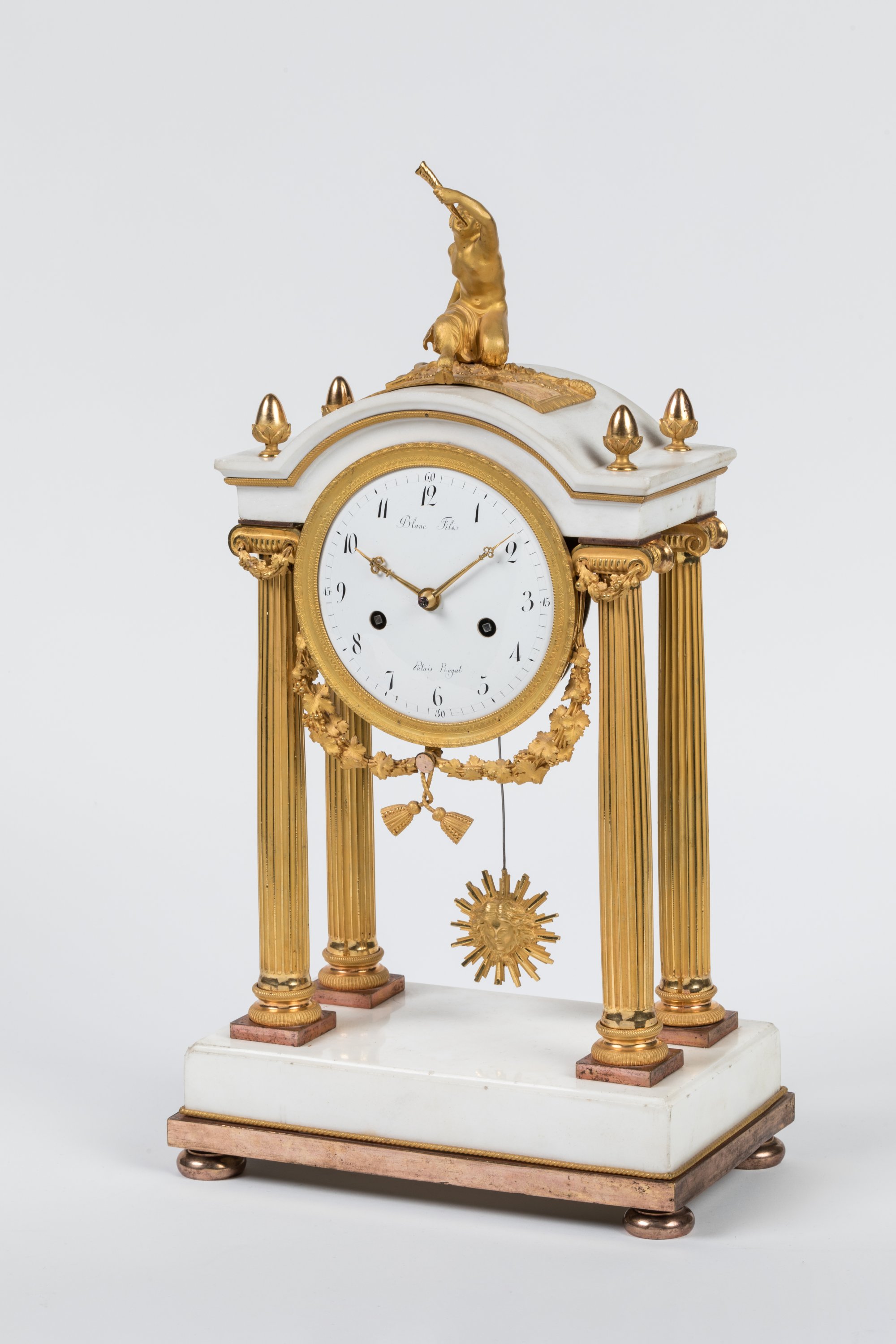 en marbre blanc et bronze doré. Le cadran émaillé, avec les heures en chiffres arabes, signé Blanc Fils et situé au Palais Royal, retenant une guirlande de feuilles de chêne, est encadré par quatre colonnes cannelées à chapiteaux corinthiens en bronze doré soutenant une toiture en chapeau de gendarme, ornée de glands de chêne, sur laquelle un faune trinque, une conque à la main. Socle en marbre blanc ceinturé d'un cordage torsadé reposant sur quatre pieds en boule aplatie. Balancier au soleil rayonnant.