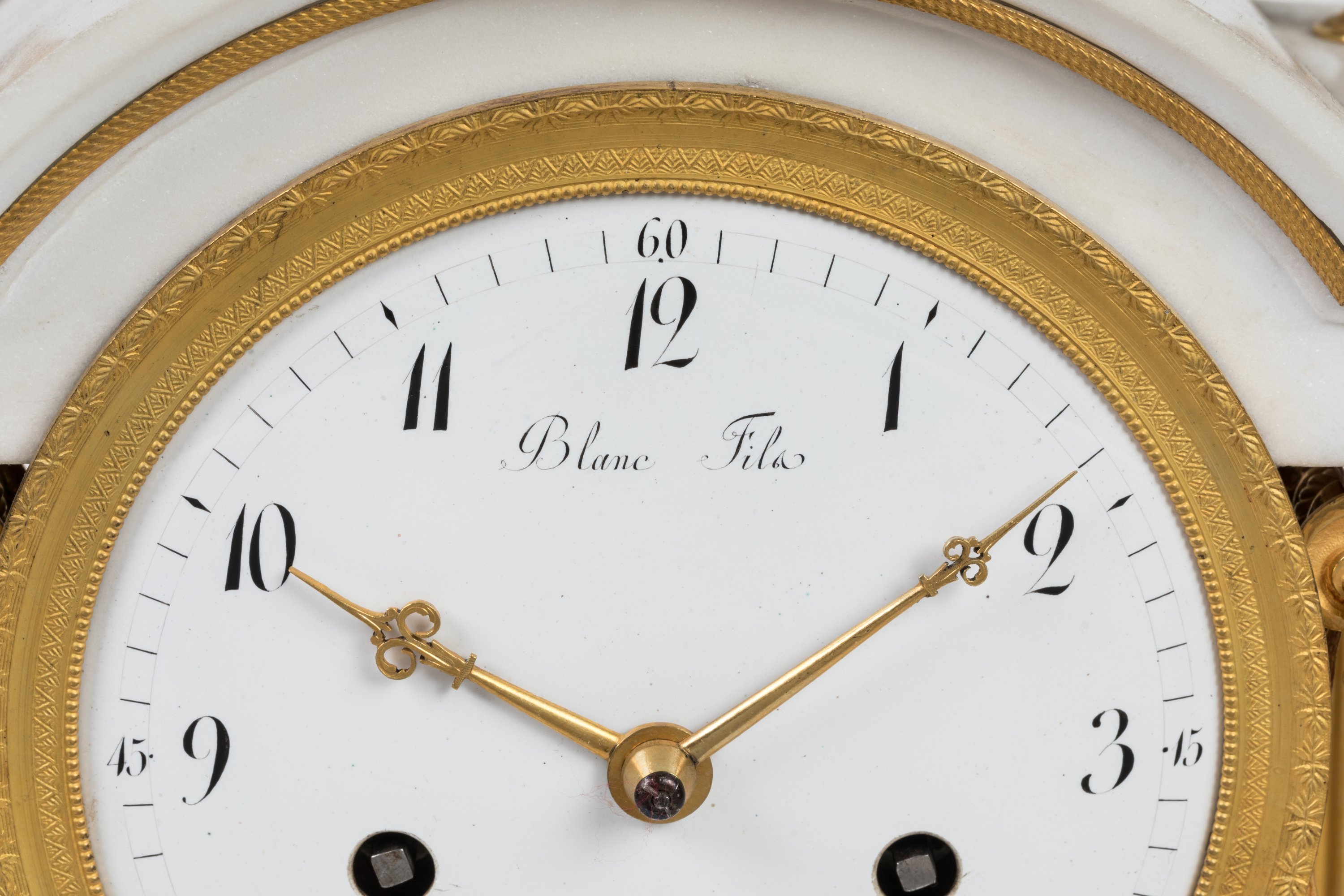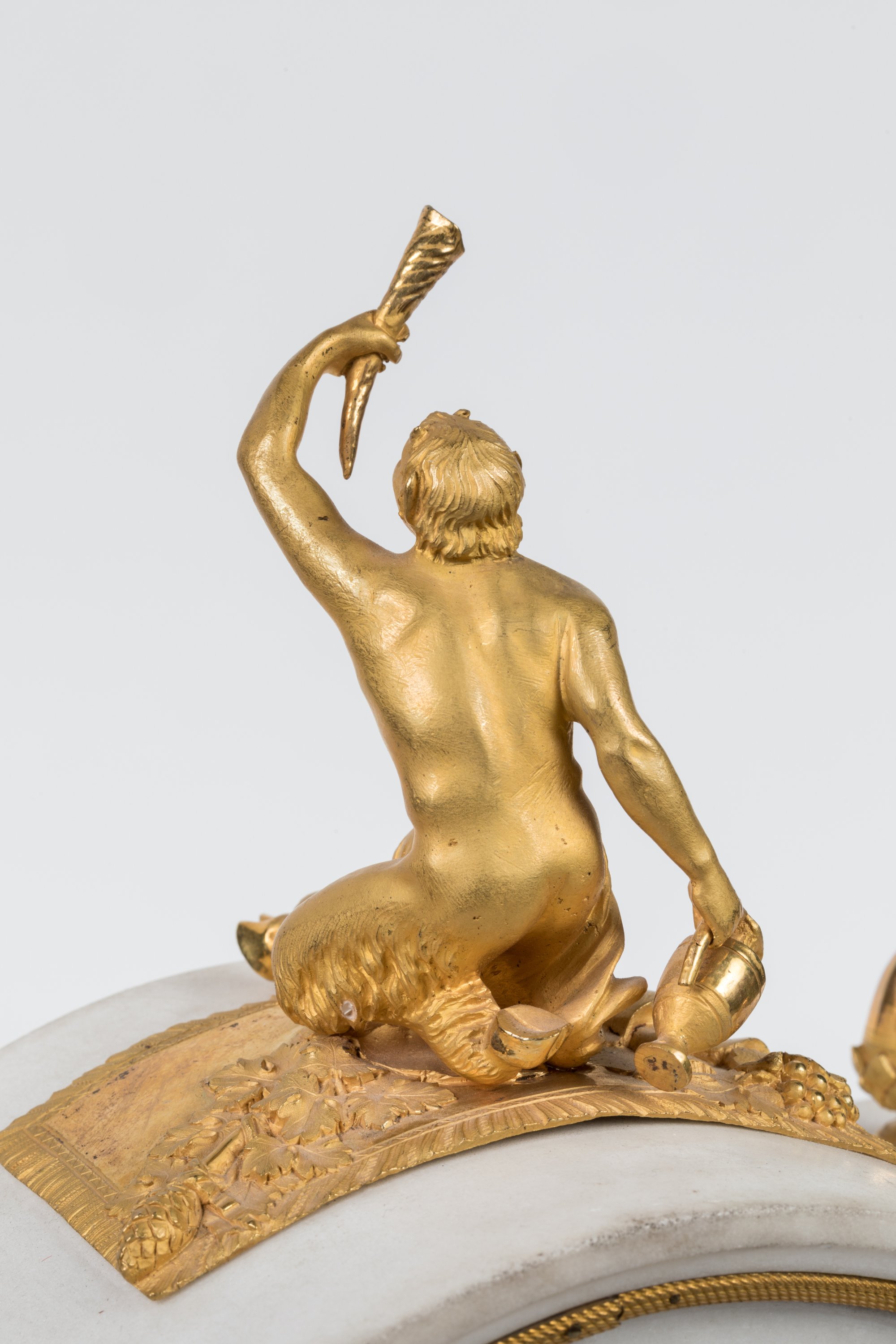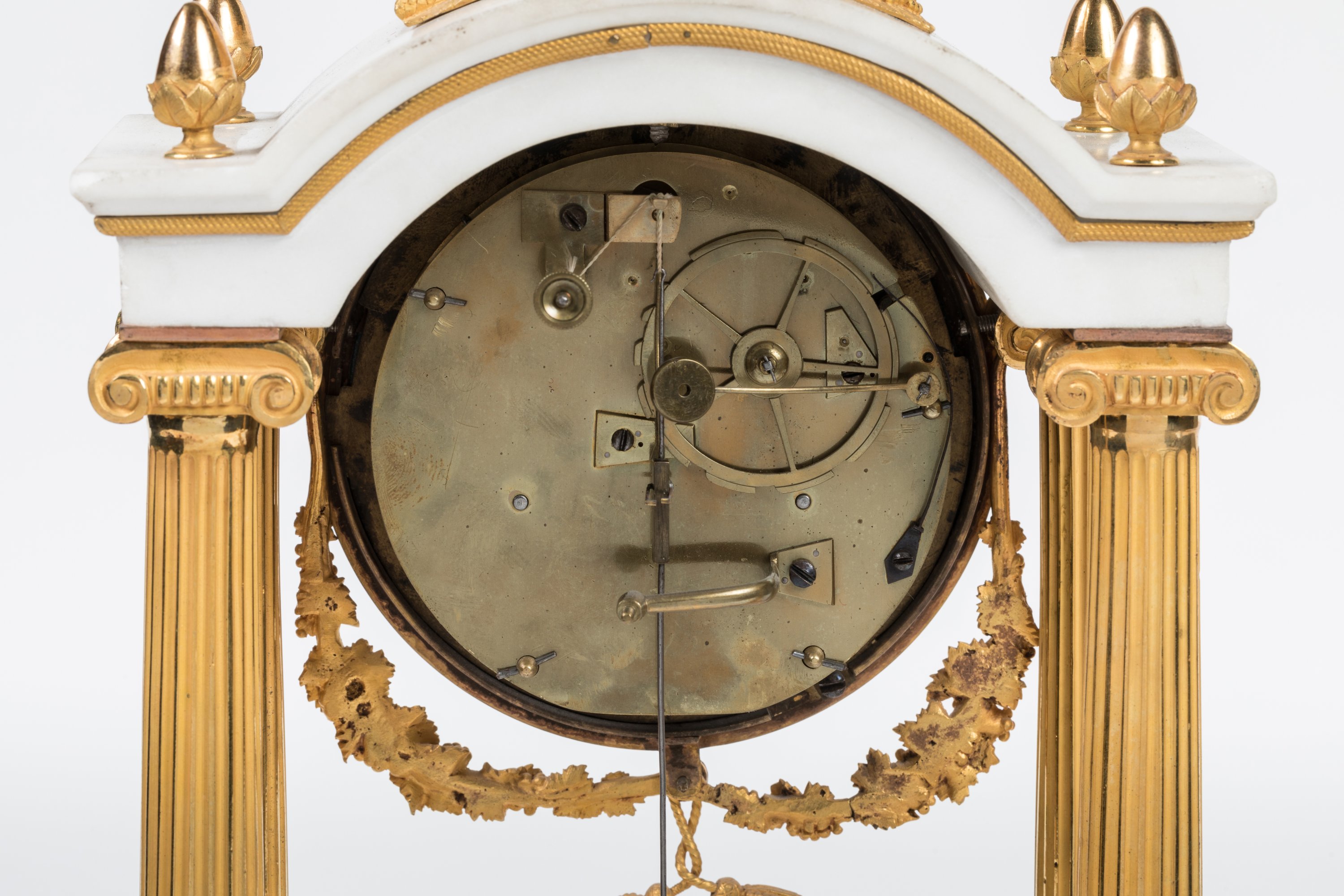 en marbre blanc et bronze doré. Le cadran émaillé, avec les heures en chiffres arabes, signé Blanc Fils et situé au Palais Royal, retenant une guirlande de feuilles de chêne, est encadré par quatre colonnes cannelées à chapiteaux corinthiens en bronze doré soutenant une toiture en chapeau de gendarme, ornée de glands de chêne, sur laquelle un faune trinque, une conque à la main. Socle en marbre blanc ceinturé d'un cordage torsadé reposant sur quatre pieds en boule aplatie. Balancier au soleil rayonnant.