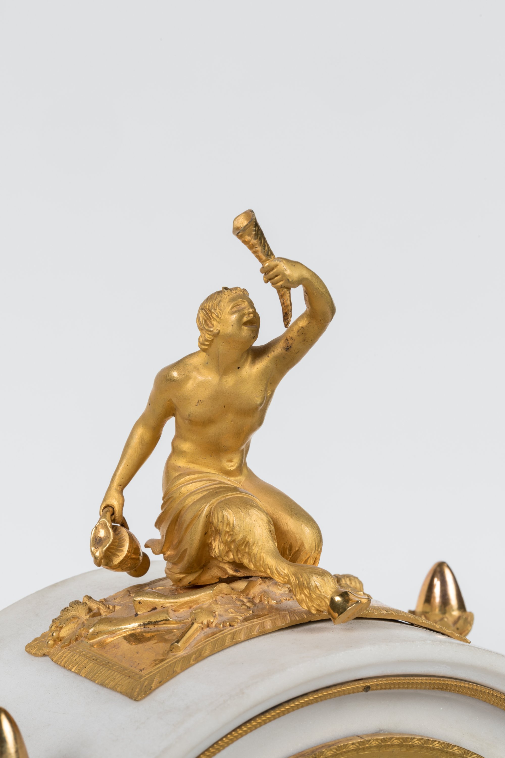 Blanc, First Restauration Period, c. 1816-1823. A white marble and ormolu clock adorned with a faun. On a white marble stand.