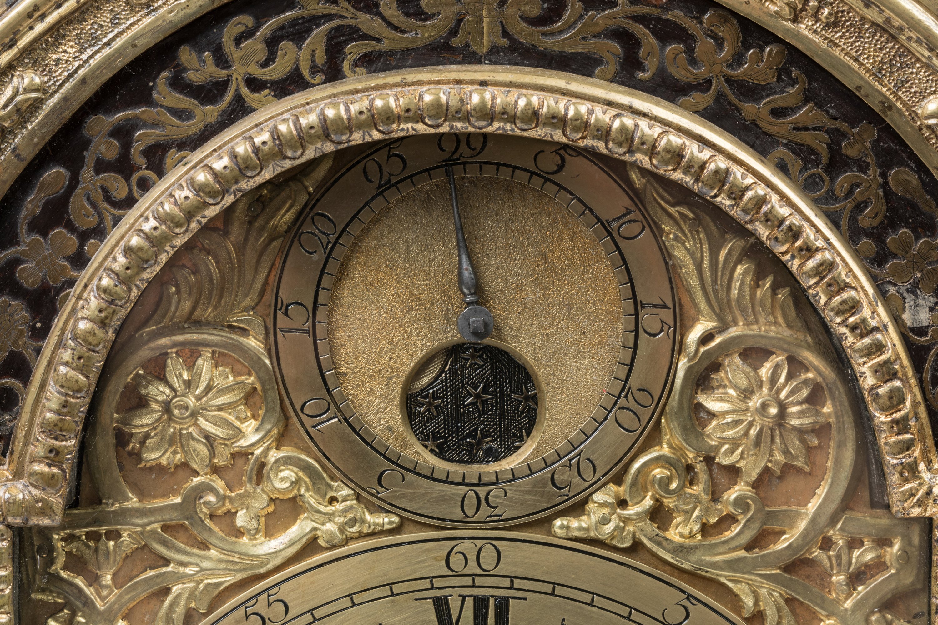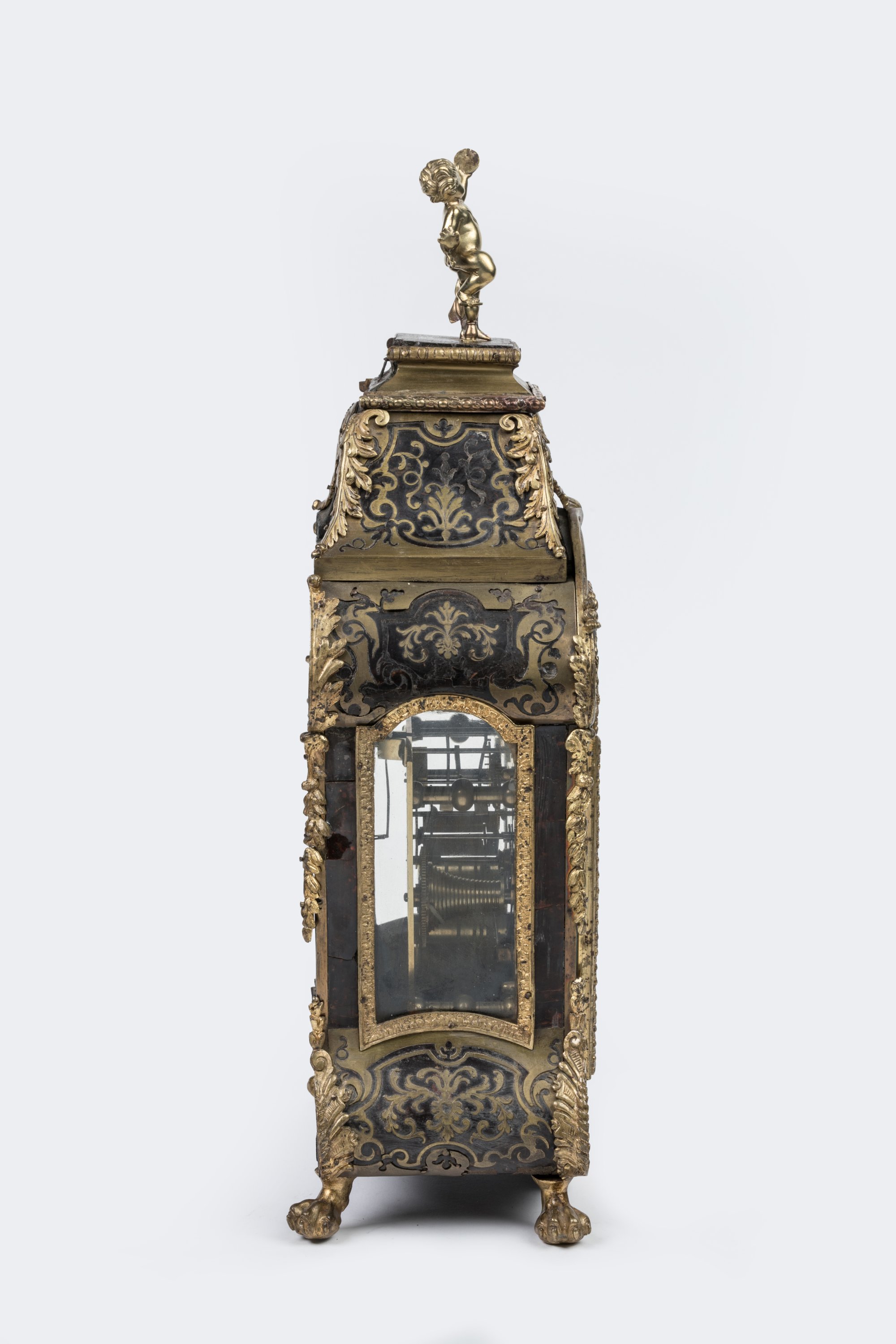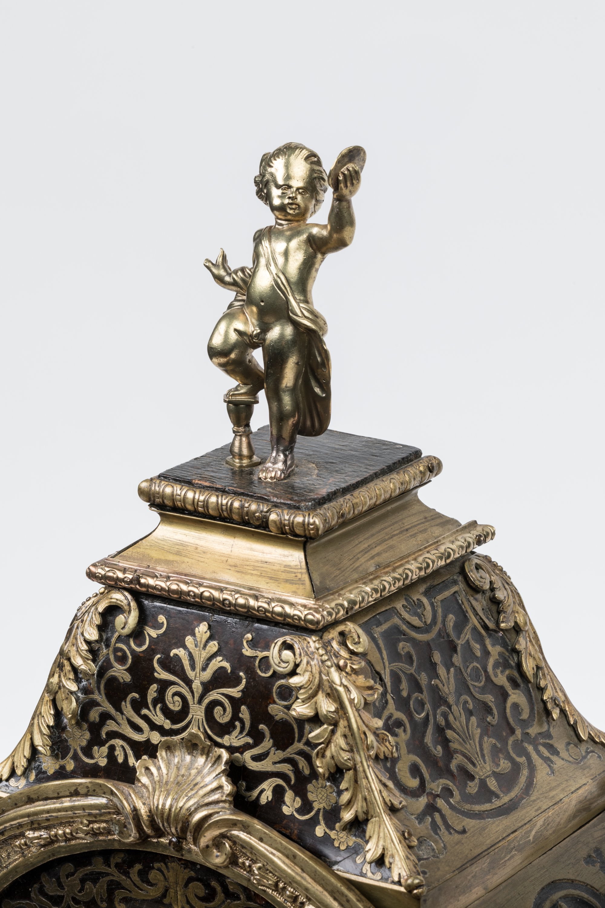 en marqueterie dite Boulle, en première partie de laiton et contre partie d'écaille. De forme violonnée, le sommet est surmonté d'un putto brandissant un cadran solaire. Le boîtier de forme rectangulaire et cintré en partie supérieure arbore un décor de rinceaux feuillagés. Les arêtes sont soulignées de bronzes dorés en forme de feuilles d'acanthe. Le cadran doré et argenté figure les heures en chiffres romains, les minutes en chiffres arabes et les jours en partie basse. Un second cadran indique les quantièmes et les phases de la Lune. L'ensemble repose sur quatre pieds léonins.