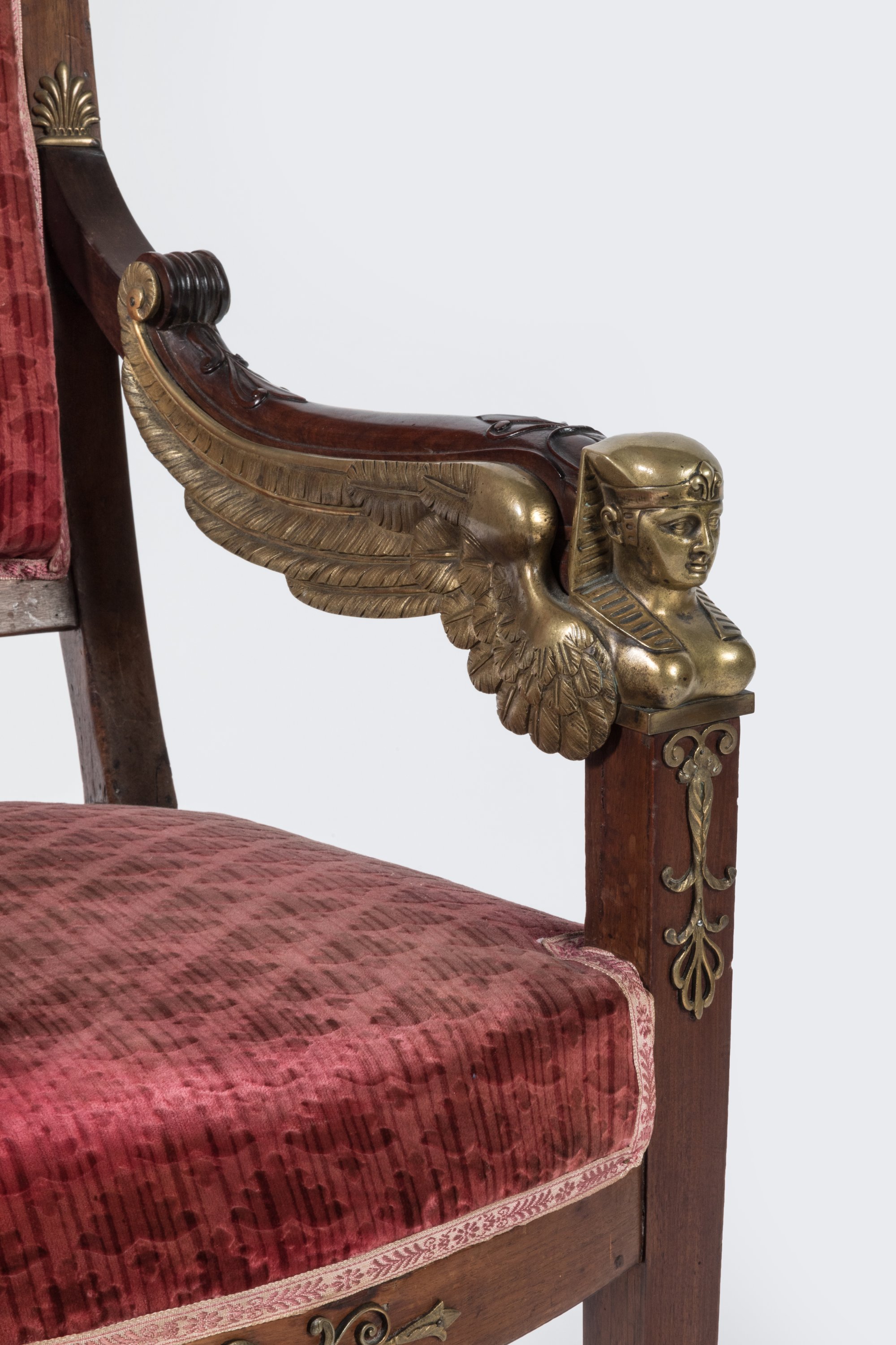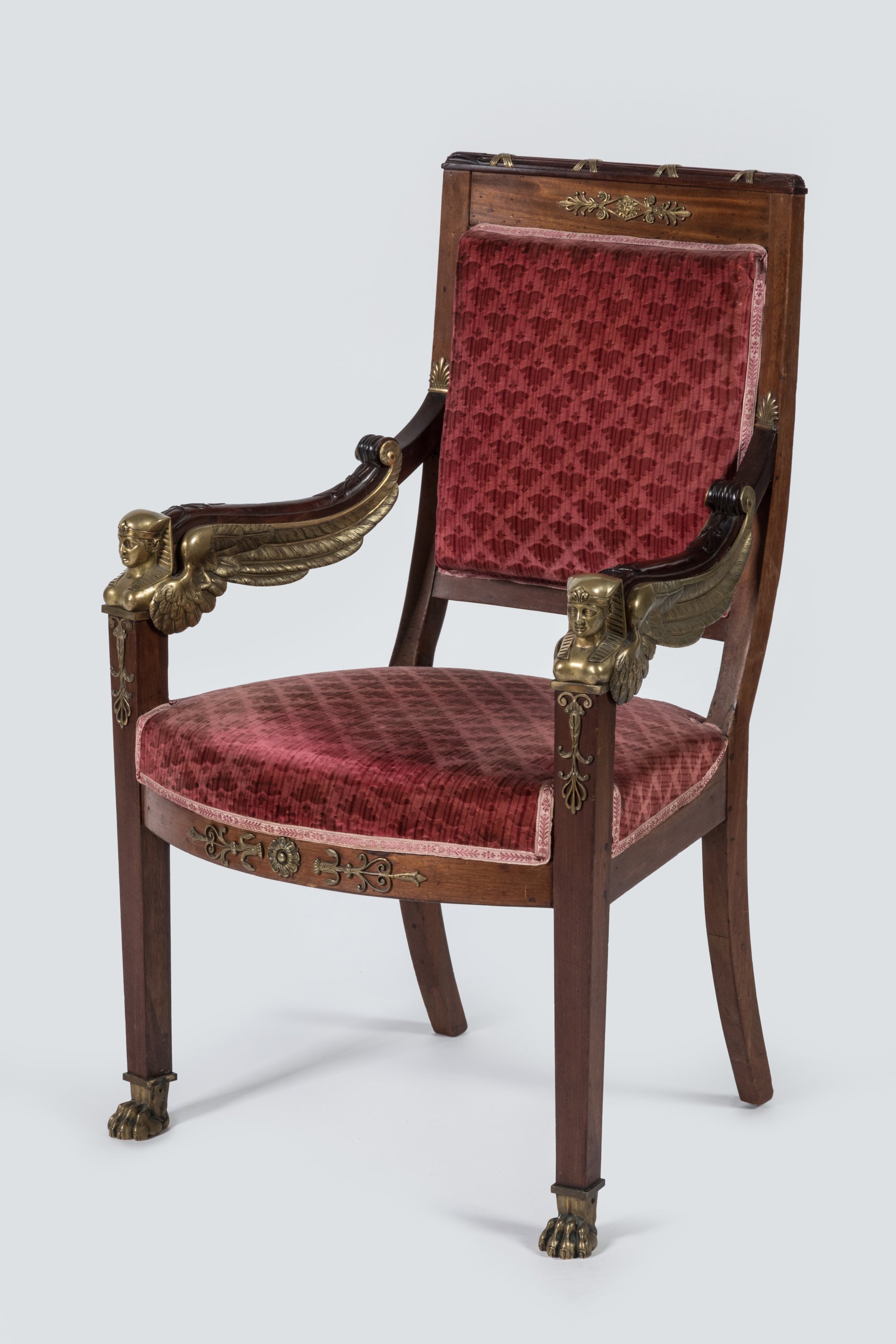 Ce fauteuil s'inspirant du style "Retour d'Egypte" n'est pas sans rappeler la production des Jacob. La tête de sphinge est proche des supports d'accotoirs d'une suite de quatre fauteuils achetée en 1806, pour la chambre à coucher de la princesse Murat à Fontainebleau (F2742 in "Egyptomania, cat. exp., Paris, Louvre, 1994, p. 281). Les grandes ailes s'inspirent quant à elles d'un riche modèle livré pour le deuxième grand salon de l'Impératrice aux Tuileries (Versailles in Arizzoli-Clémentel et Samoyault, Le mobilier de Versailles, chefs-d'oeuvre du XIXe siècle, p. 186). Ce siège est donc une inspiration des nombreuses formes rapportées lors de la Campagne d'Egypte. Les recueils de Percier et Fontaine comme de Vivant-Denon, ainsi que la publication de la "Description de l'Egypte" participent à "l'égyptomanie", dont la mode se prolonge jusqu'en 1815 et se renouvelle durant la seconde moitié du XIXe siècle.