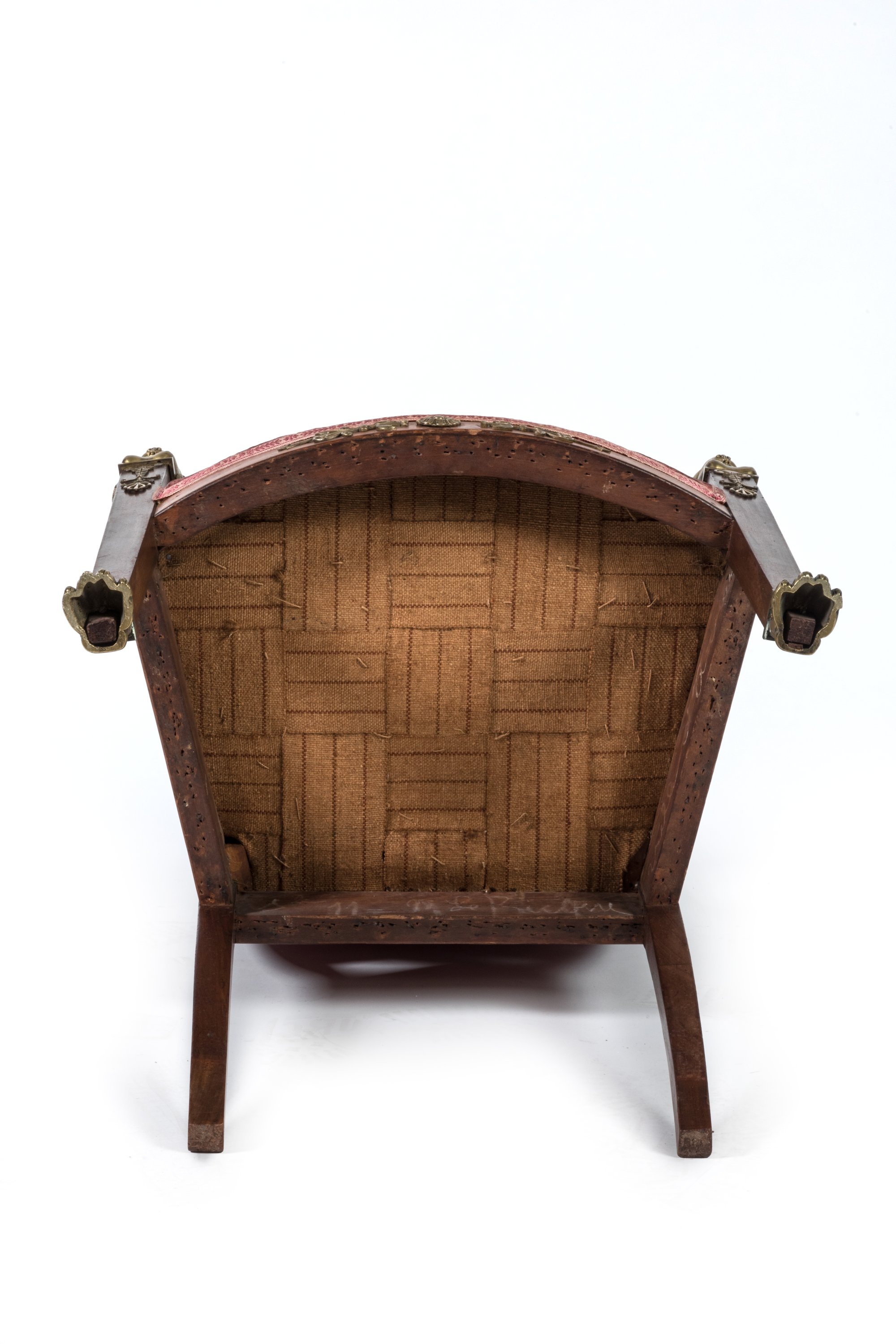 Inspired by the works of the Jacob family, late 19th C. An ormolu-mounted mahogany and mahogany veneer armchair with sphinxes. Red velvet upholstery (posterior).