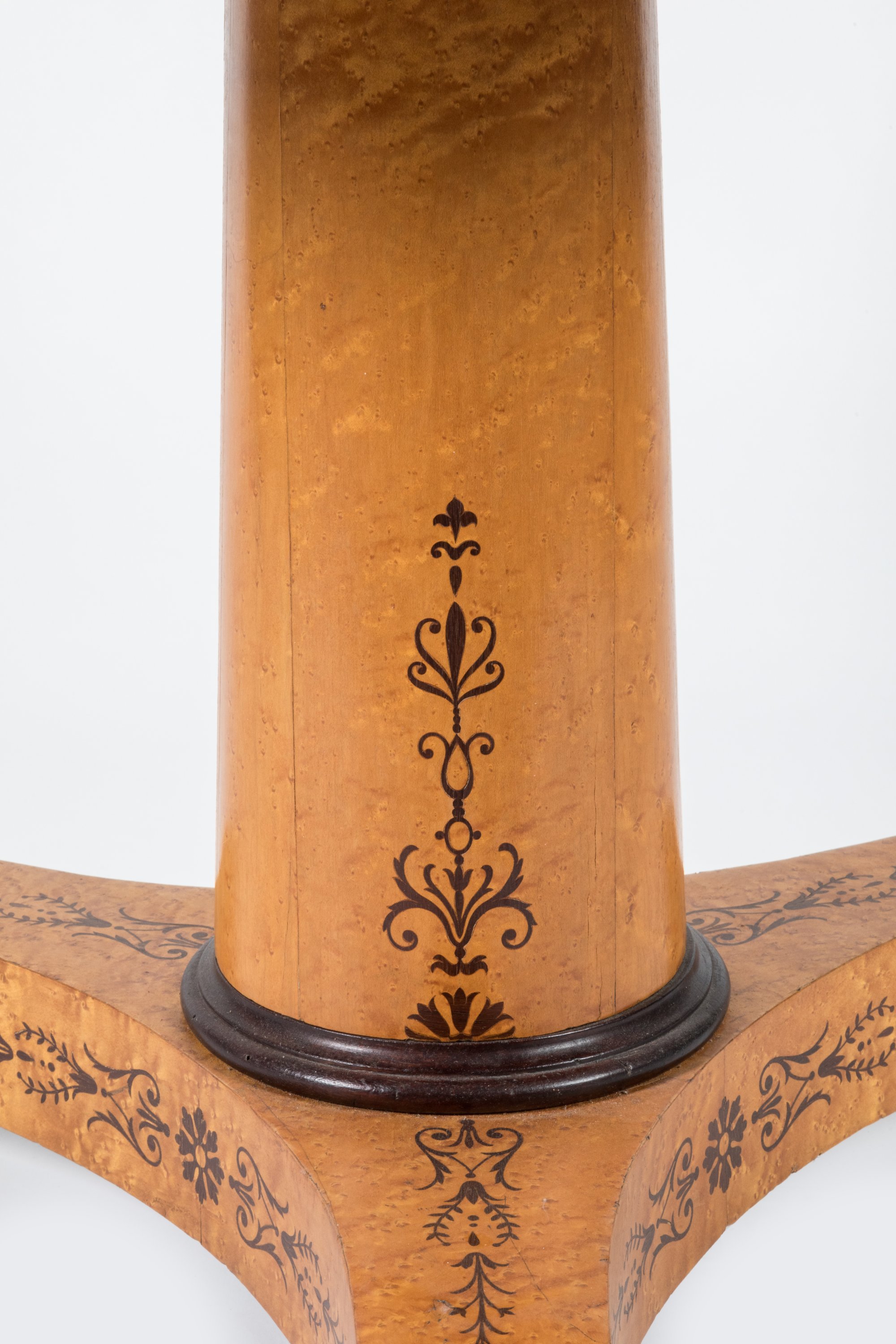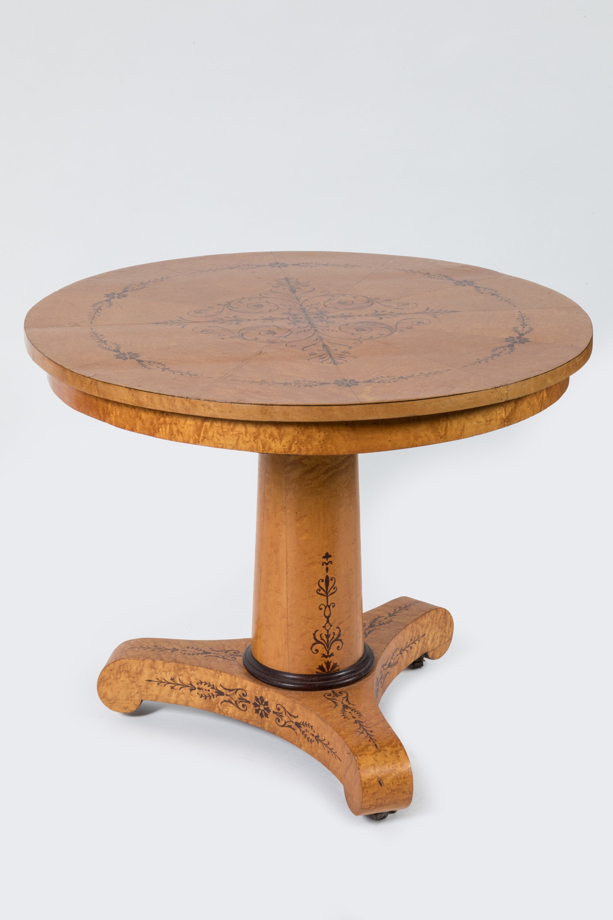 en placage d'érable moucheté et amarante, le plateau circulaire décoré d'une rosace dans un entourage de rinceaux souligné par une frise de fleurs et de lauriers. Le fût se termine par une bague et repose sur un piétement tripode sur roulettes.