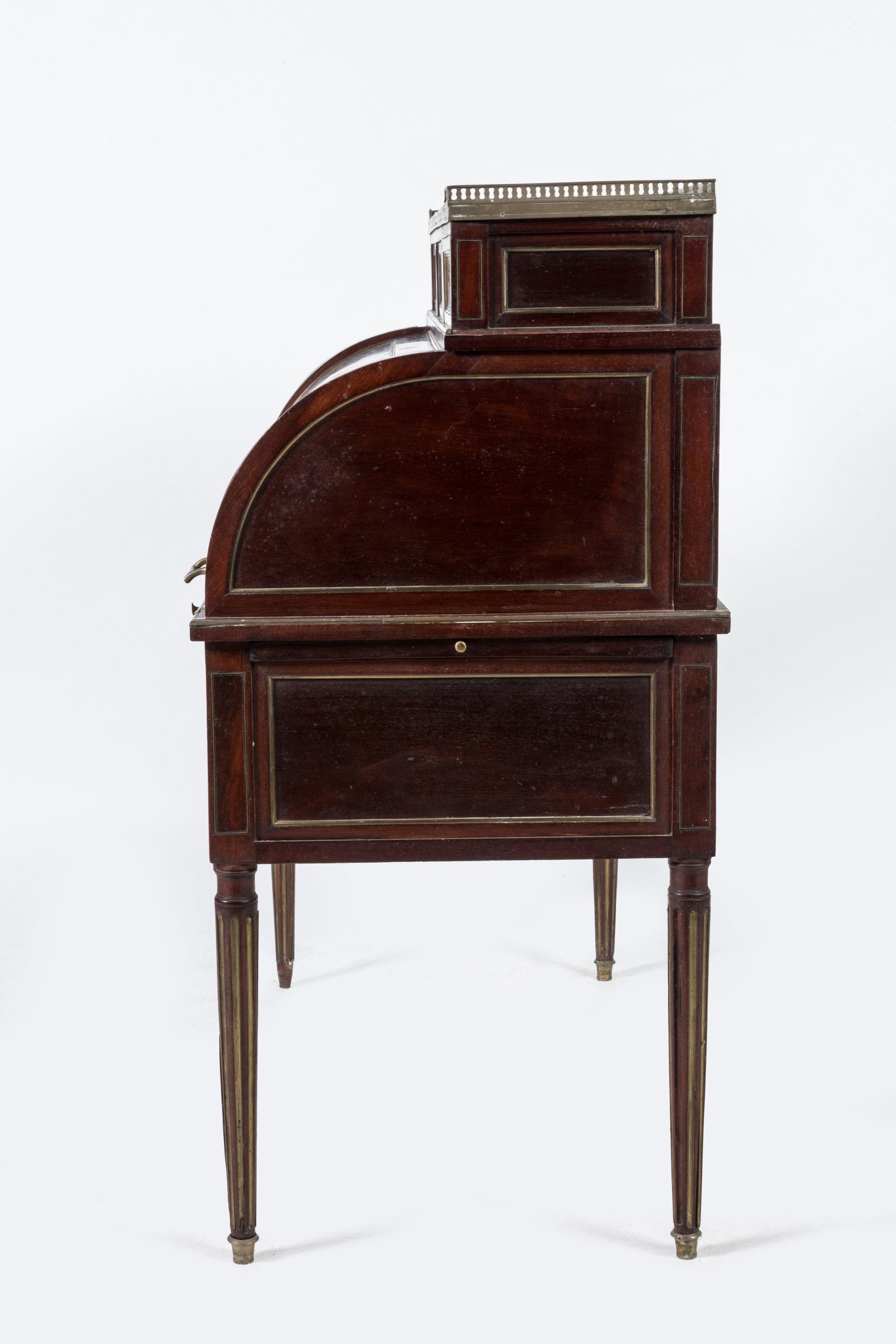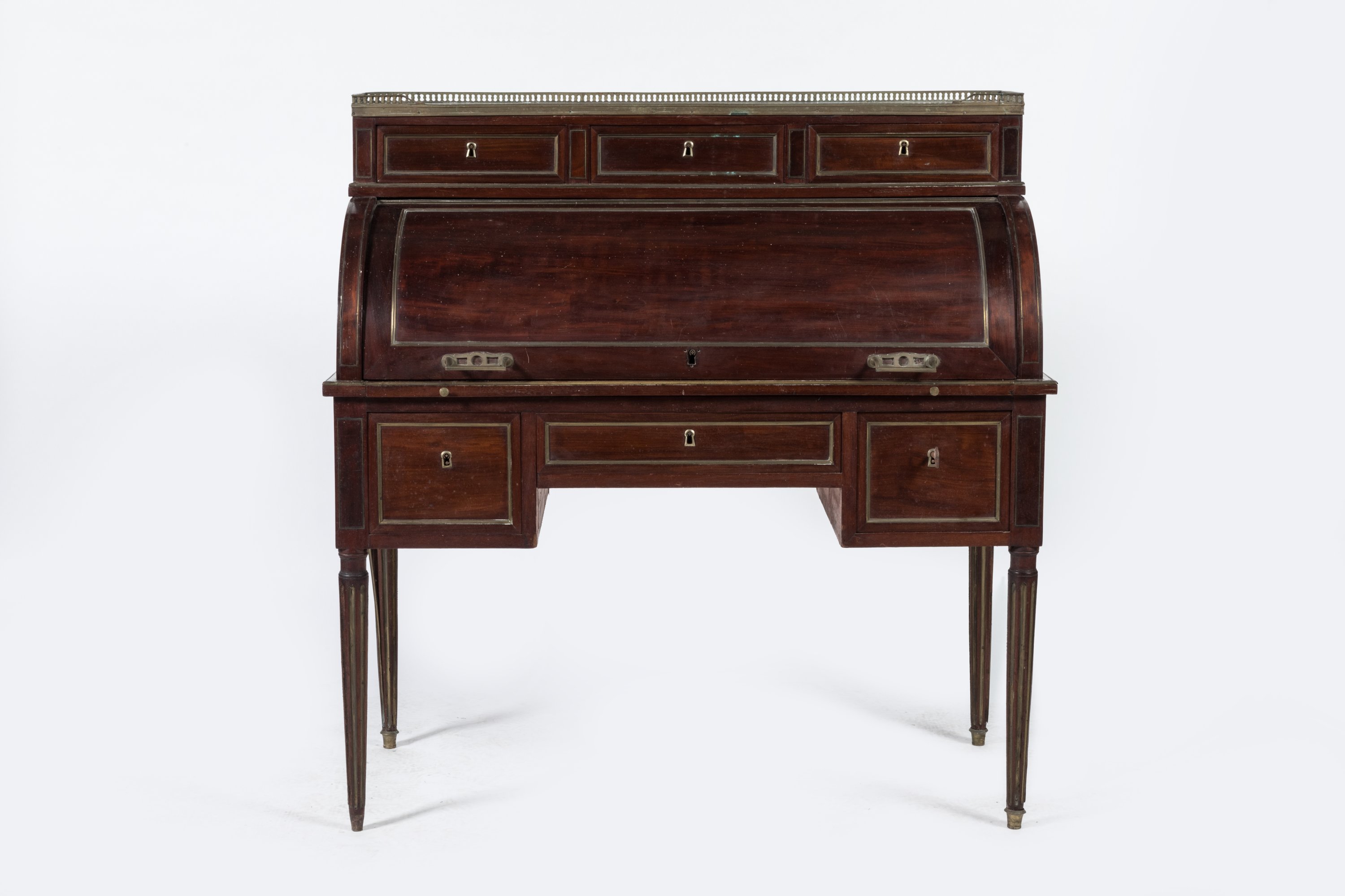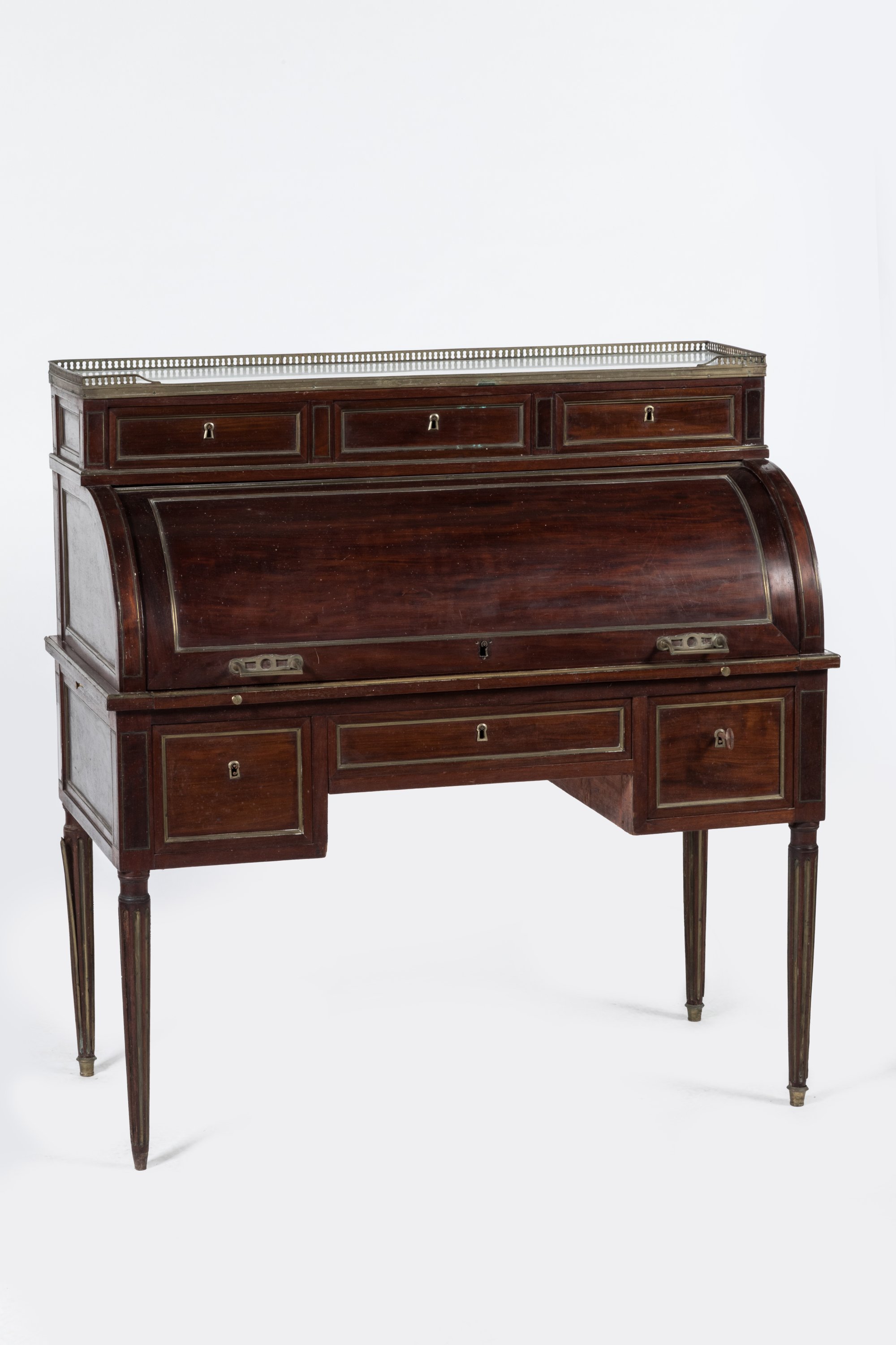 Louis XVI Period. A mahogany and mahogany veneer cylinder desk. White marble top, brass gallery.