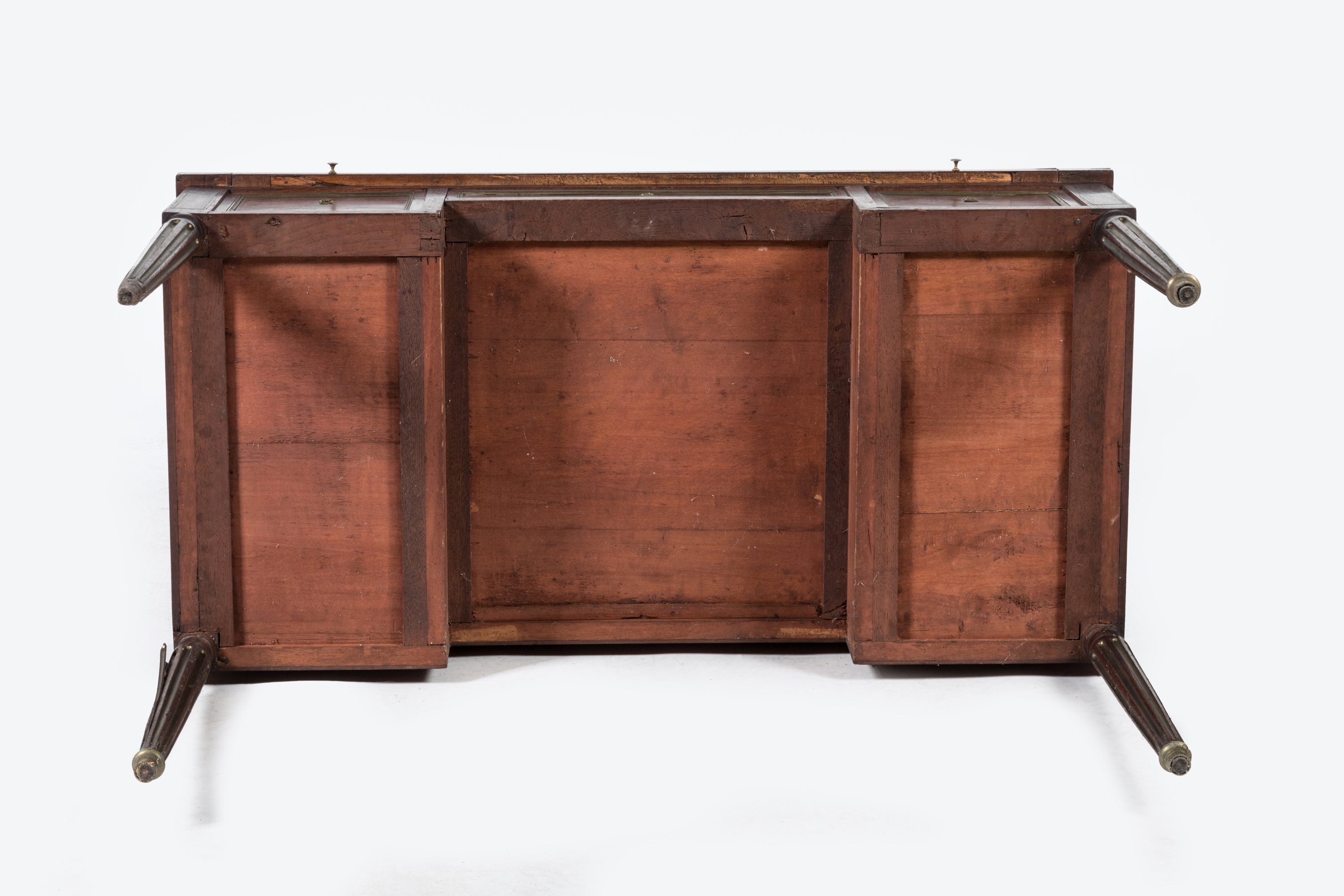 en acajou et placage d'acajou rubané toute face. Il ouvre par trois tiroirs en gradins décorés d'un filet de laiton. Un cylindre découvre à l'intérieur des niches et trois petits tiroirs ainsi qu'un plateau garni de cuir et ébène. La ceinture se compose d'un tiroir central et de tablettes latérales. Il repose sur quatre pieds cannelés rudentés. Le dessus en marbre blanc est entouré d'une lingotière en laiton ajourée.