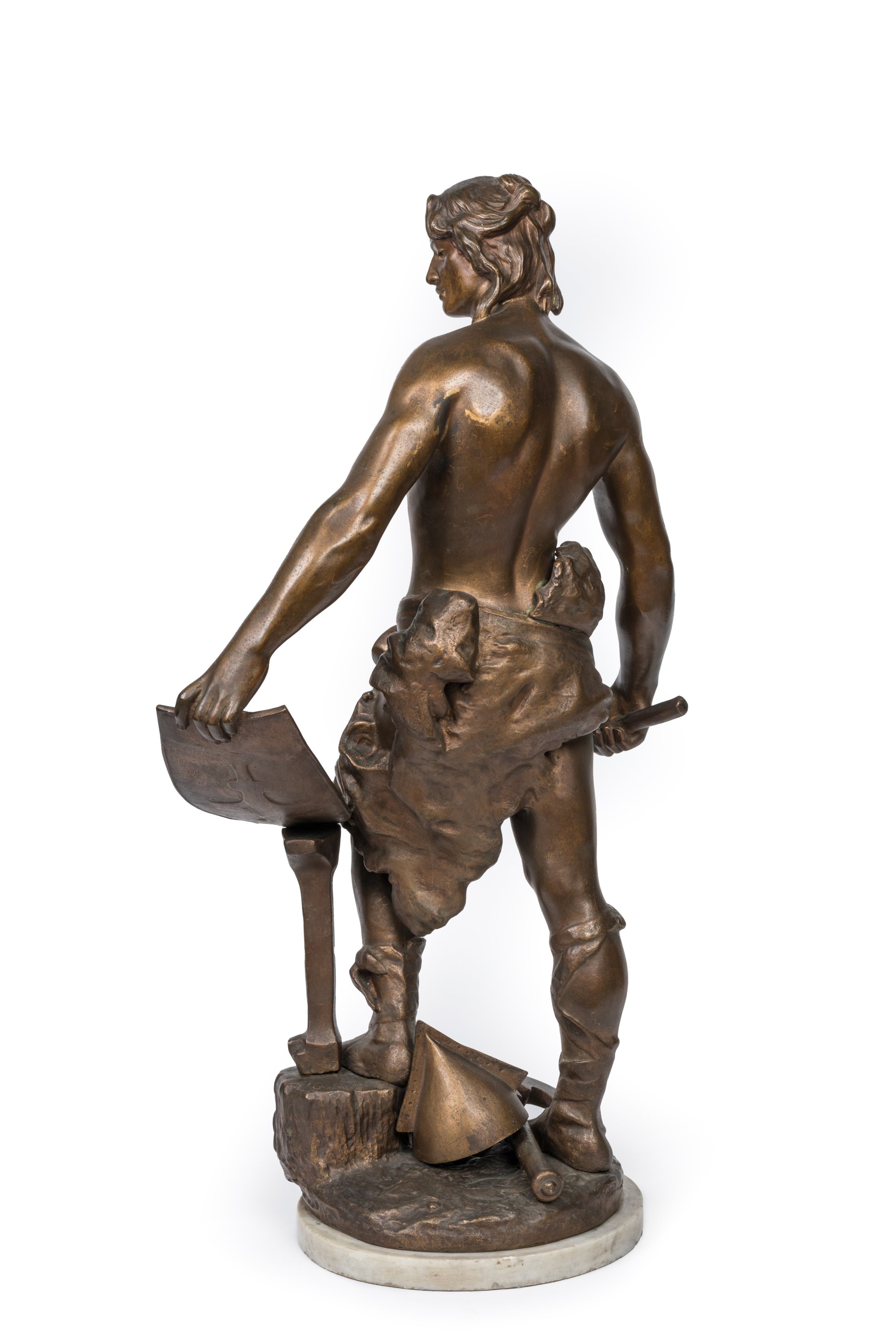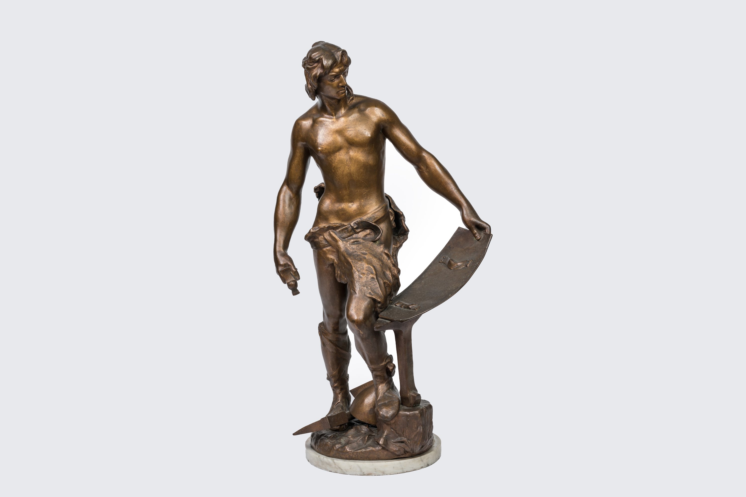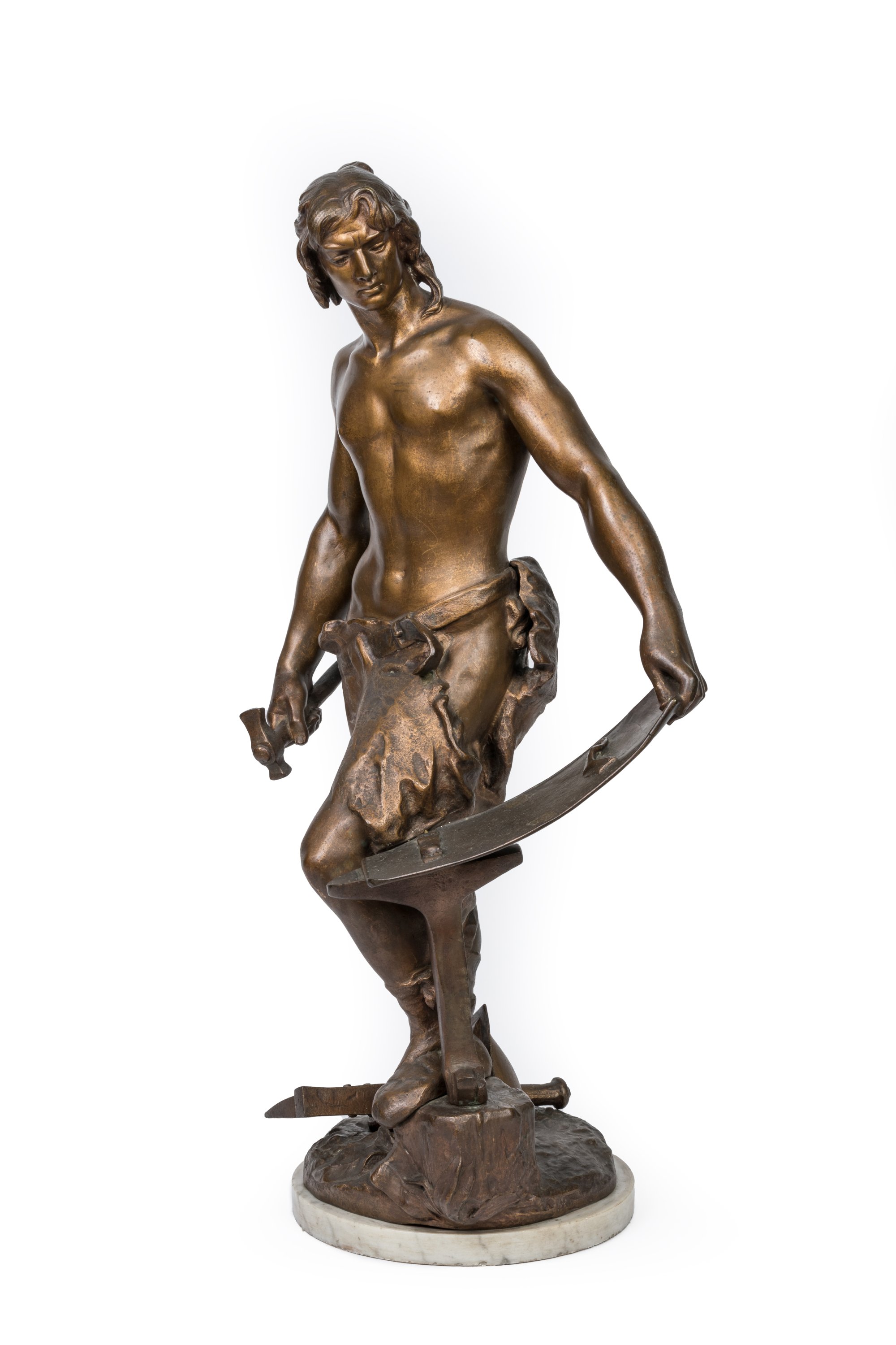 André Paul Arthur Massoule. A bronze sculpture depicting a blacksmith forging weapons. Signed. On a white marble base.