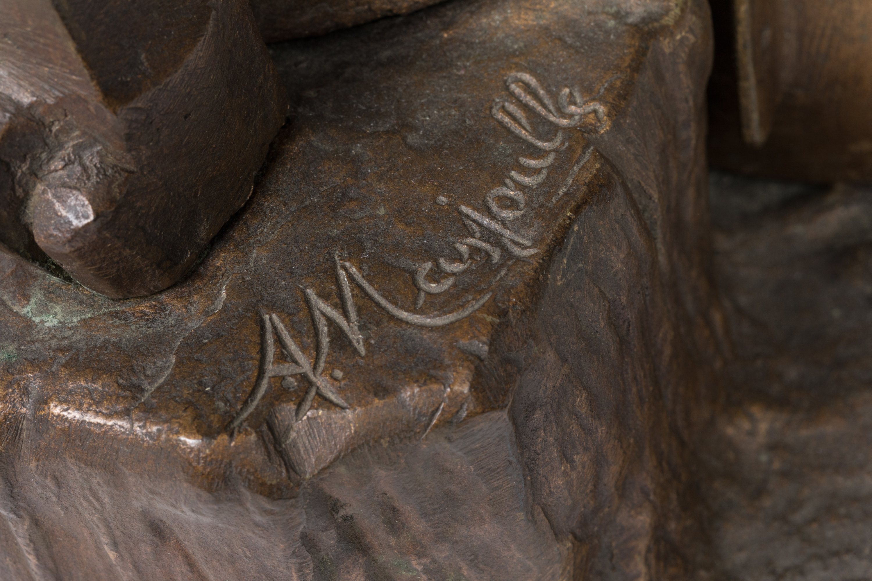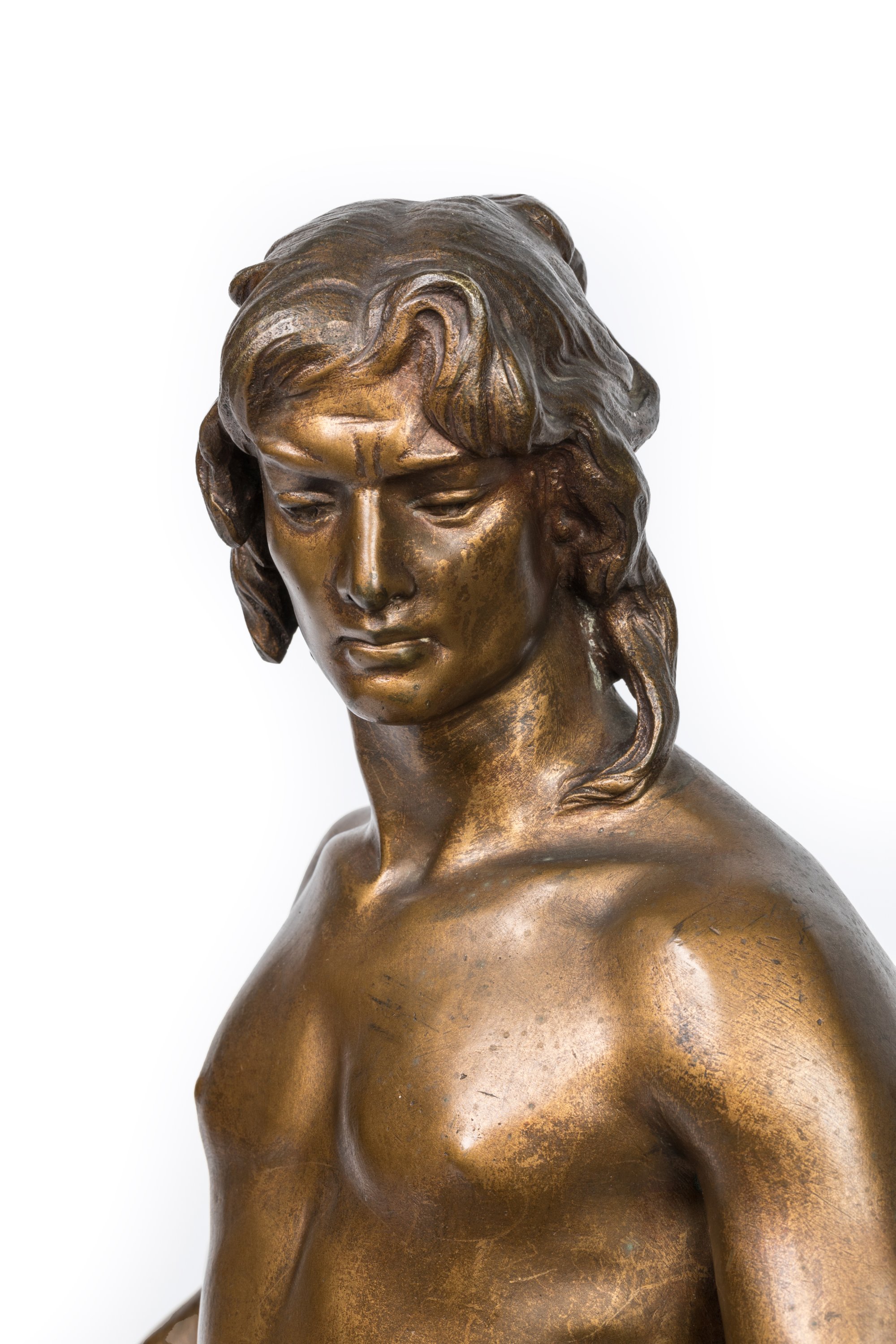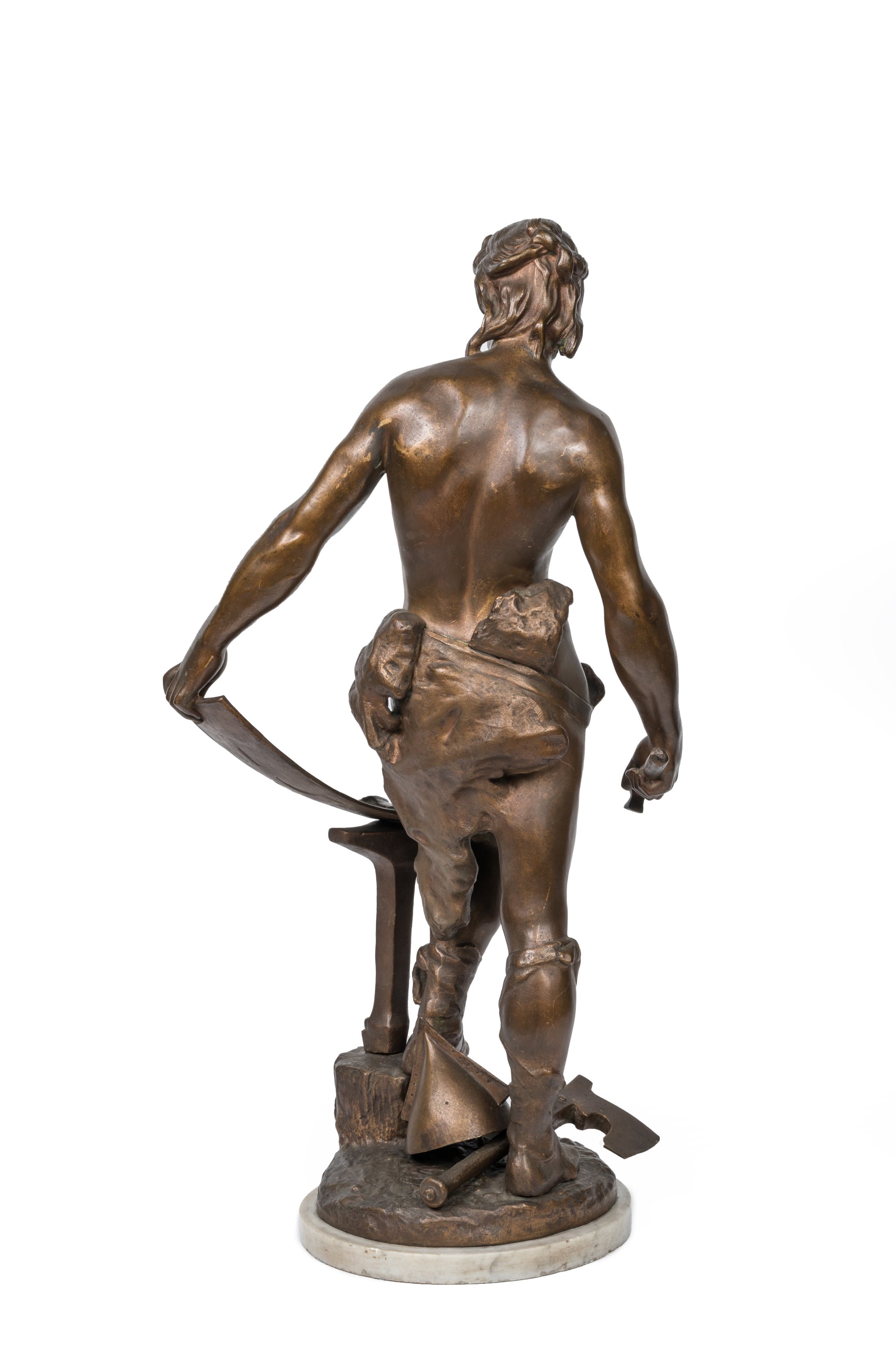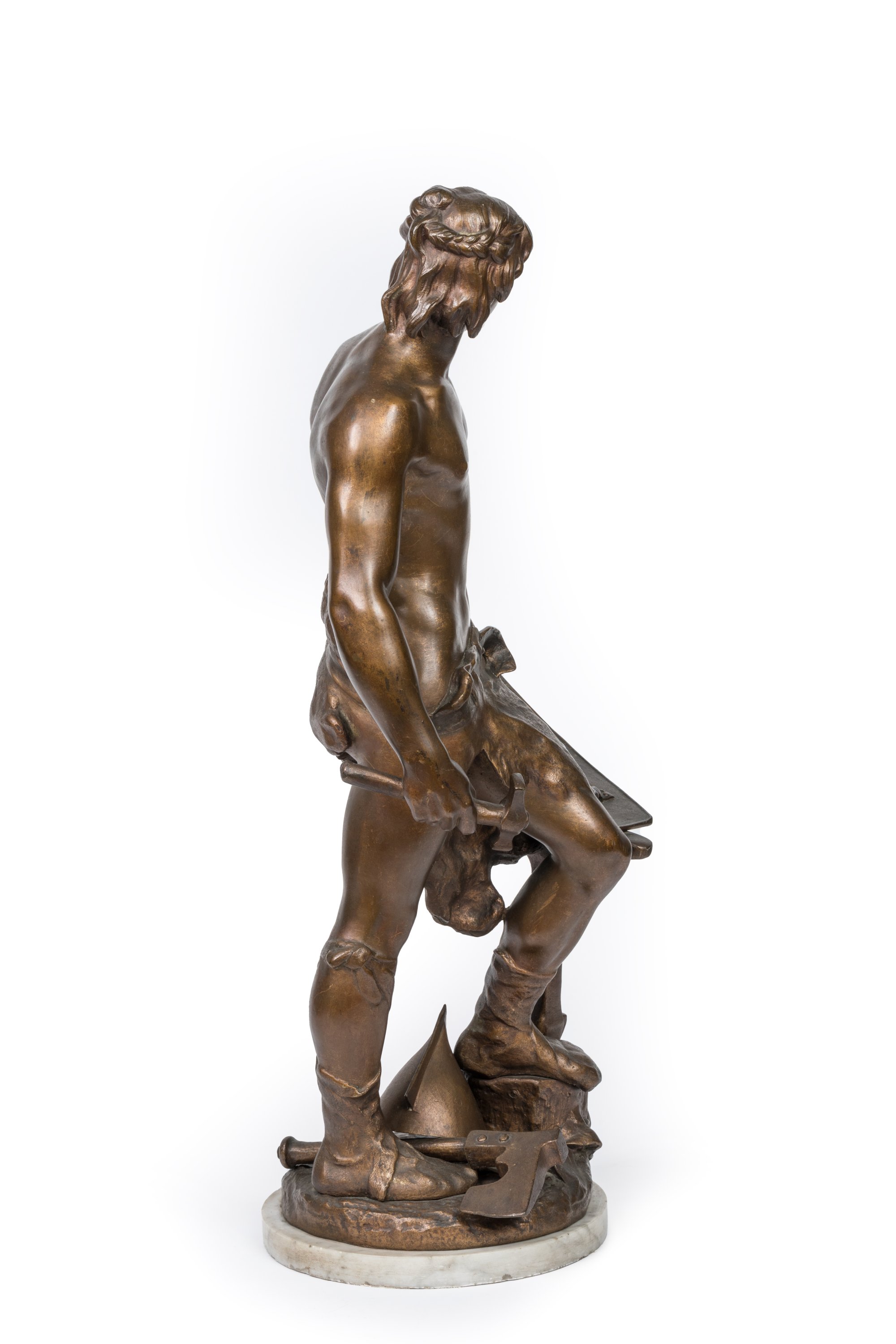 André Paul Arthur Massoule. A bronze sculpture depicting a blacksmith forging weapons. Signed. On a white marble base.