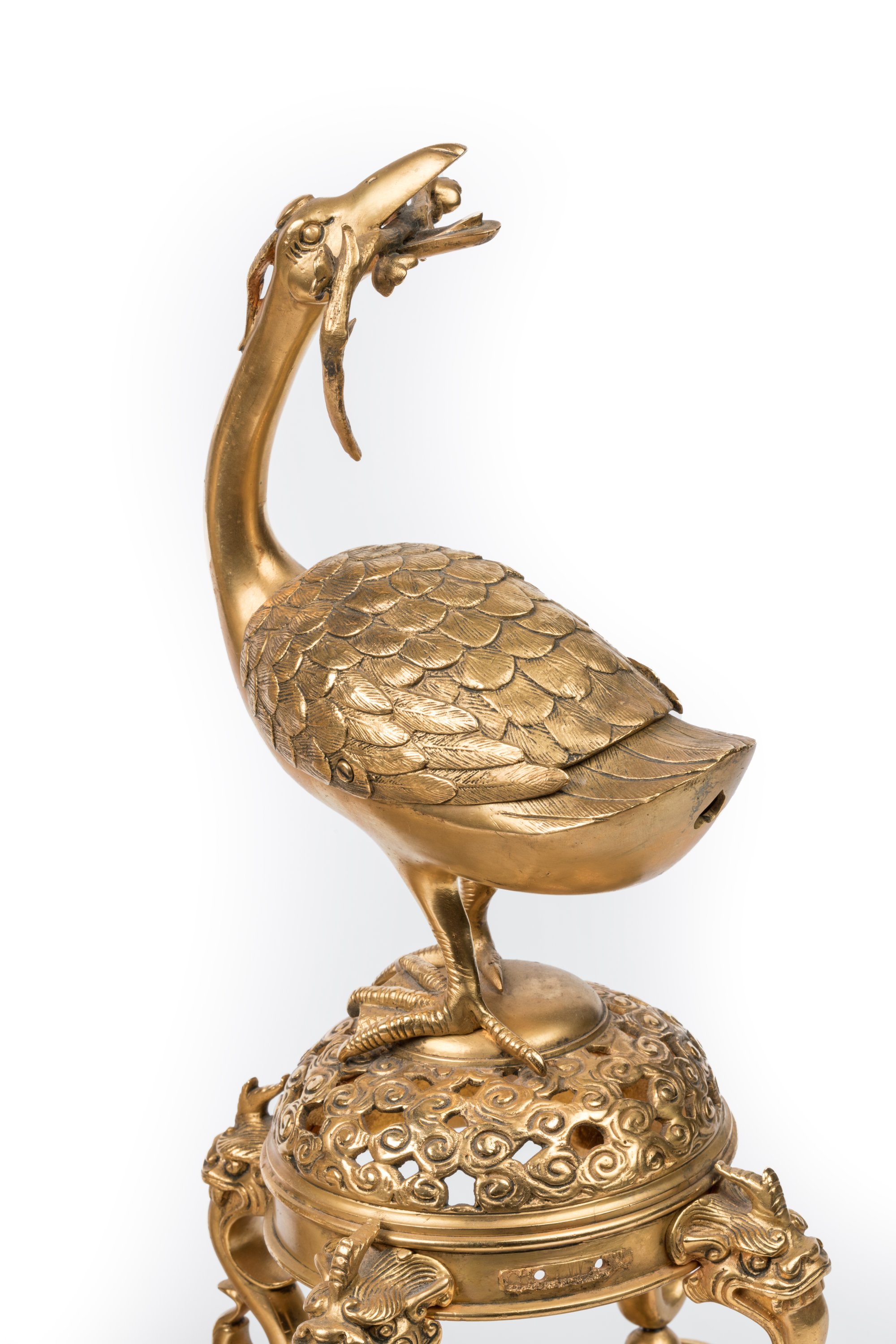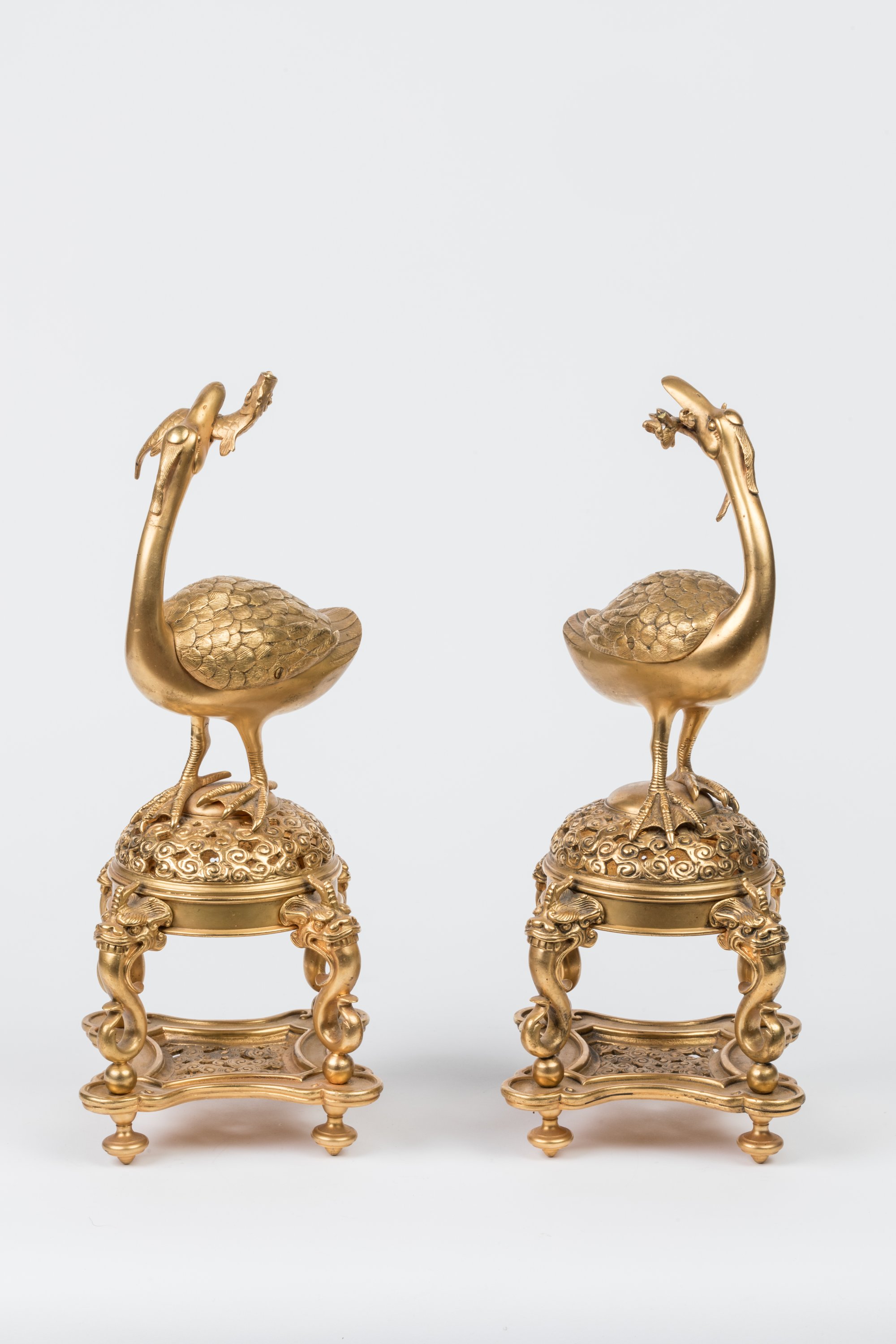 en bronze, dans le goût de la Chine. Deux oies pêchant des poissons dans leurs becs sont posées sur une base tripode ajourée. Les pieds en forme de têtes de chimères cornues.