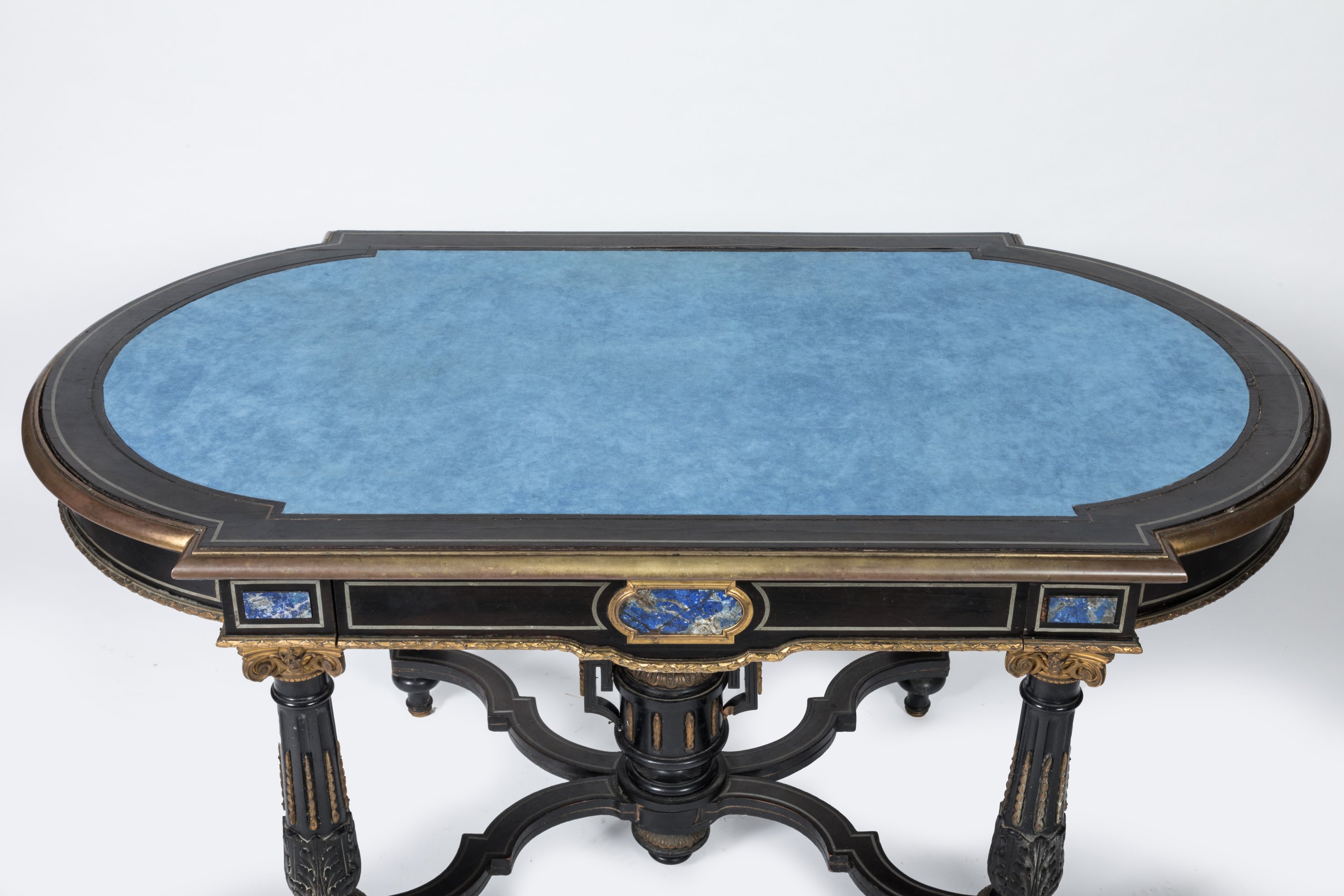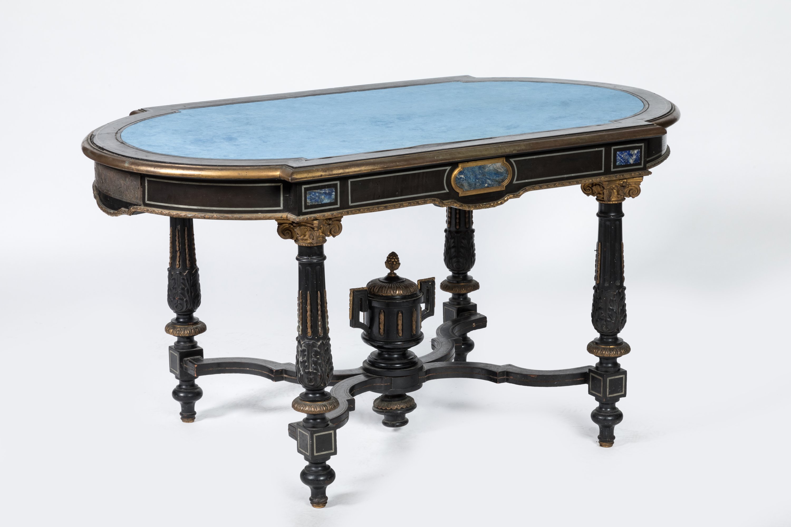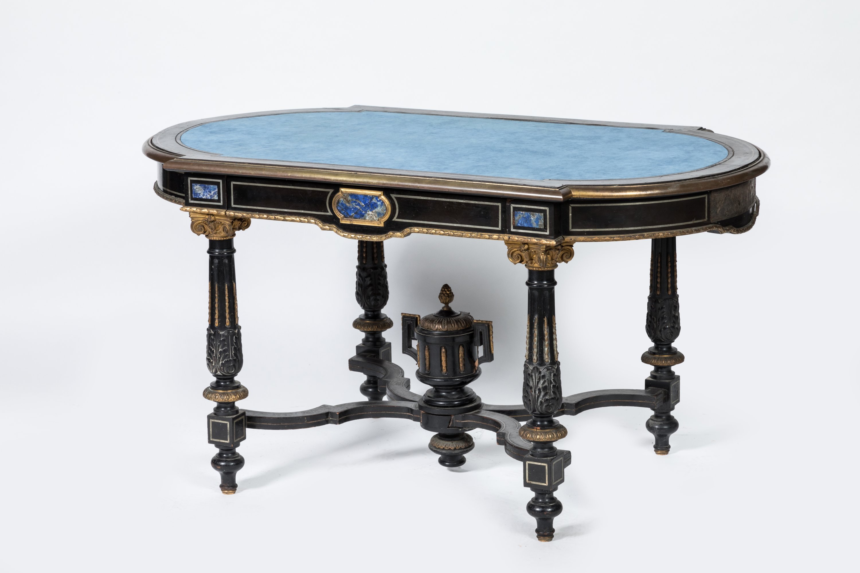 Attributed to Léon Marcotte, Napoleon III Period. A blackened veneer wood library table with pewter, lapis-lazuli, brass and bronze ornaments.