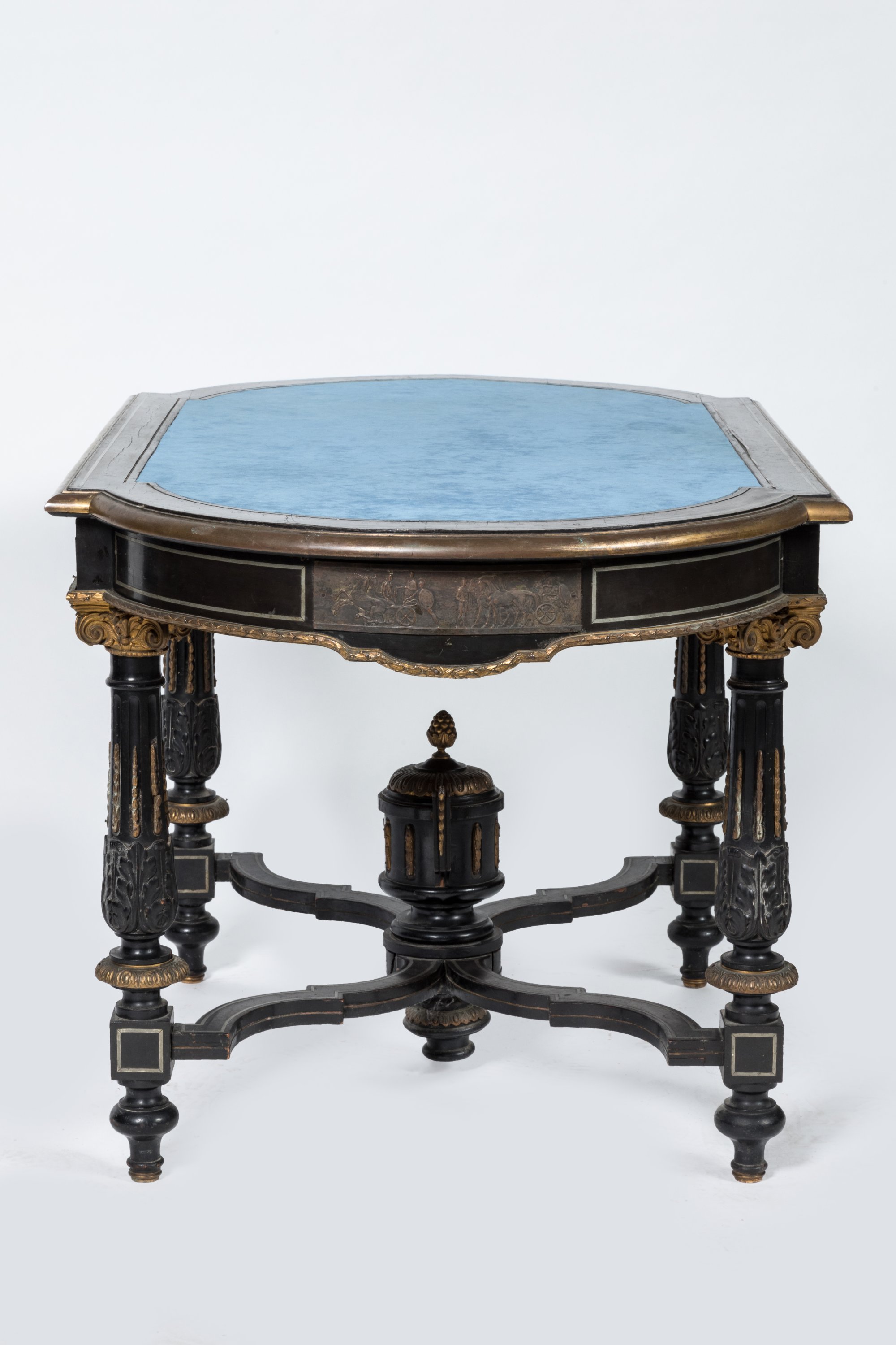 en bois et placage de bois noirci ouvrant par un tiroir en ceinture. Le plateau rectangulaire à côtés arrondis est garni d'un feutre bleu et entouré d'un filet d'étain et d'une lingotière à bec de corbin. La ceinture est décorée de filets d'étain, de lapis-lazuli, de deux plaques de laiton repoussé à décor de scènes à l'antique et d'une frise de laurier. Elle repose sur quatre fûts de colonne à chapiteaux corinthiens en bronze ciselé doré et se termine par des pieds toupies. L'entretoise en X présente un vase godronné surmonté d'une pomme de pin.