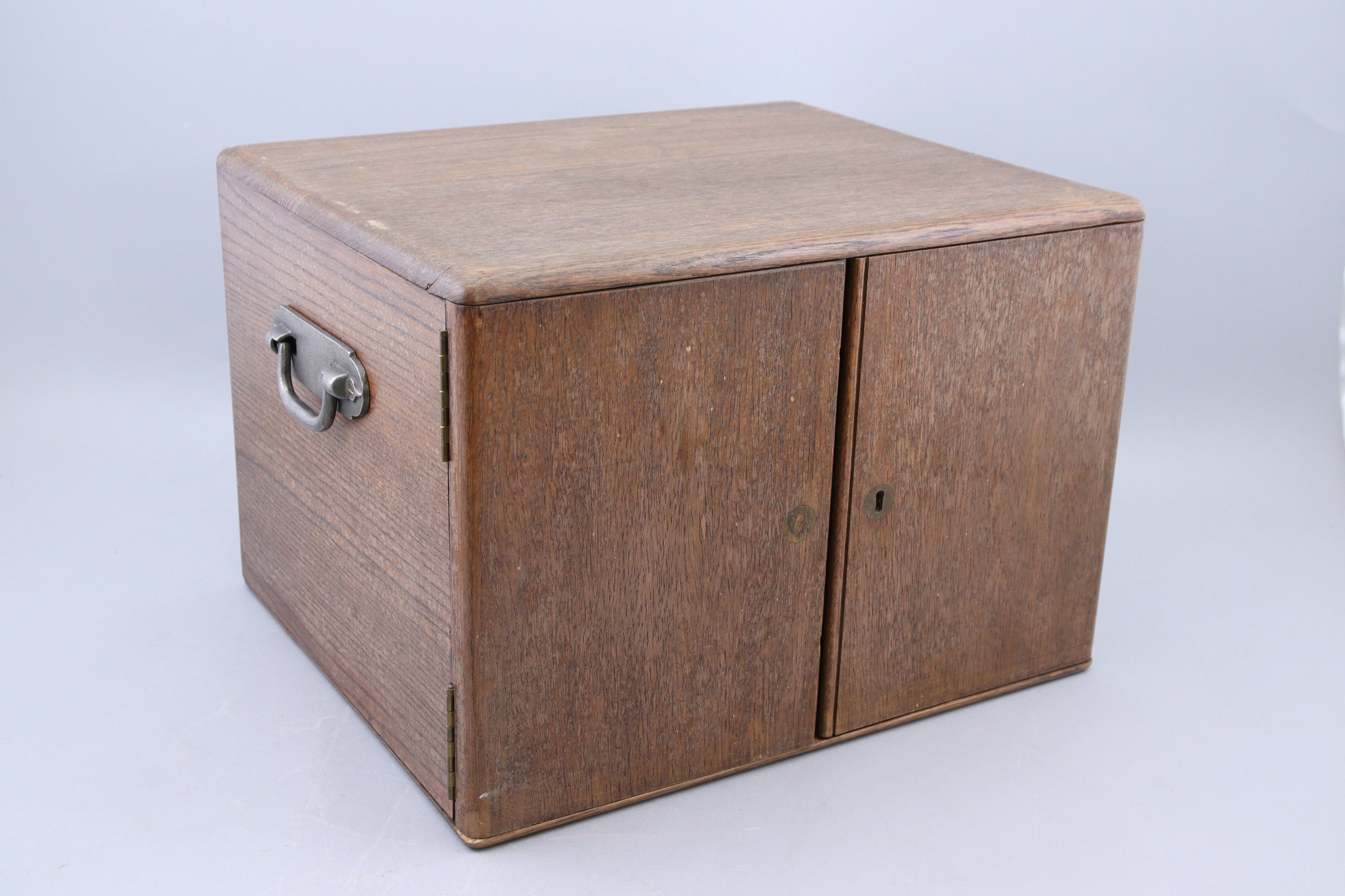 Dans un coffret en chêne à deux vantaux découvrant cinq tiroirs. Haut. 33 Larg. 48 Prof. 40 cm (manque la clé).