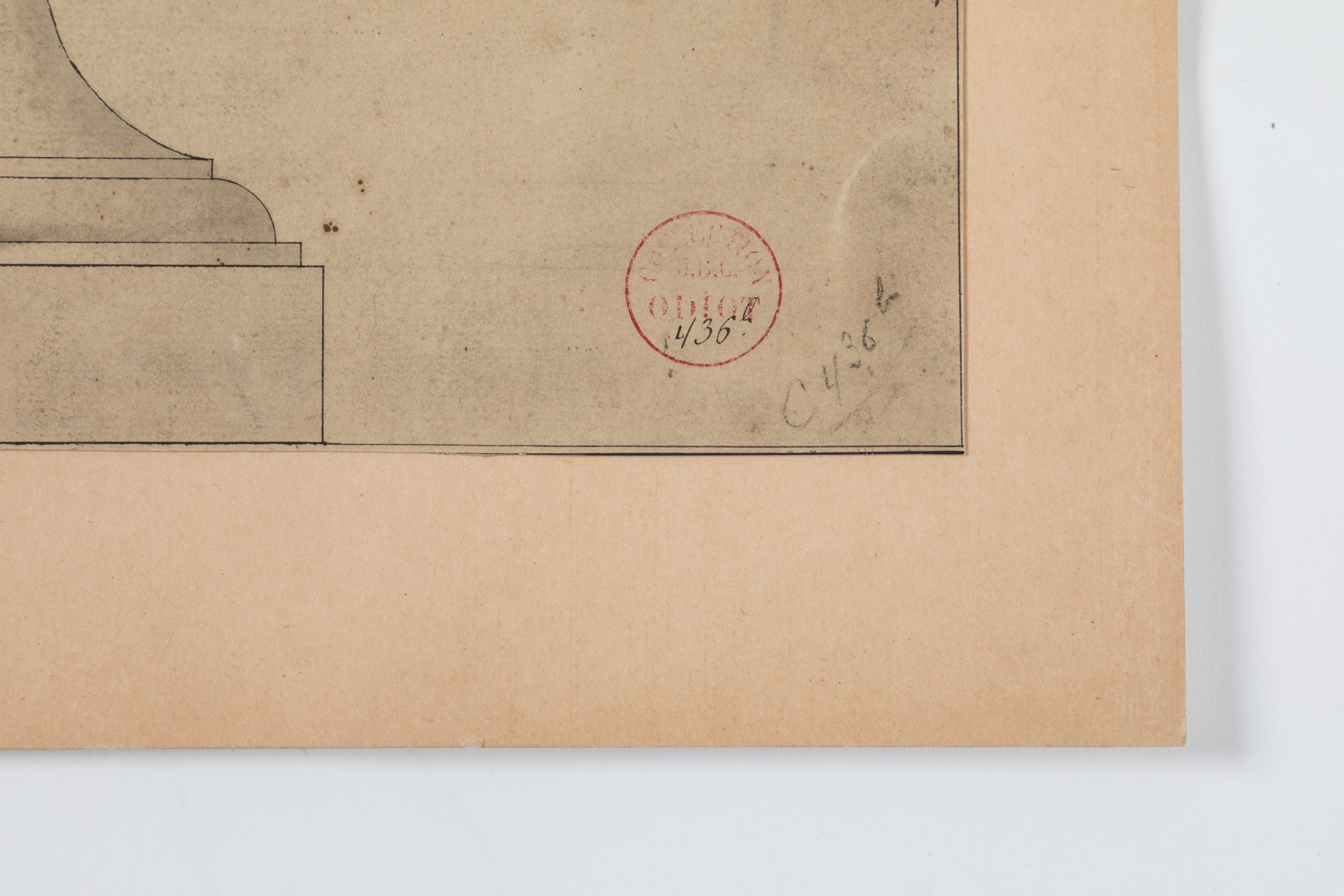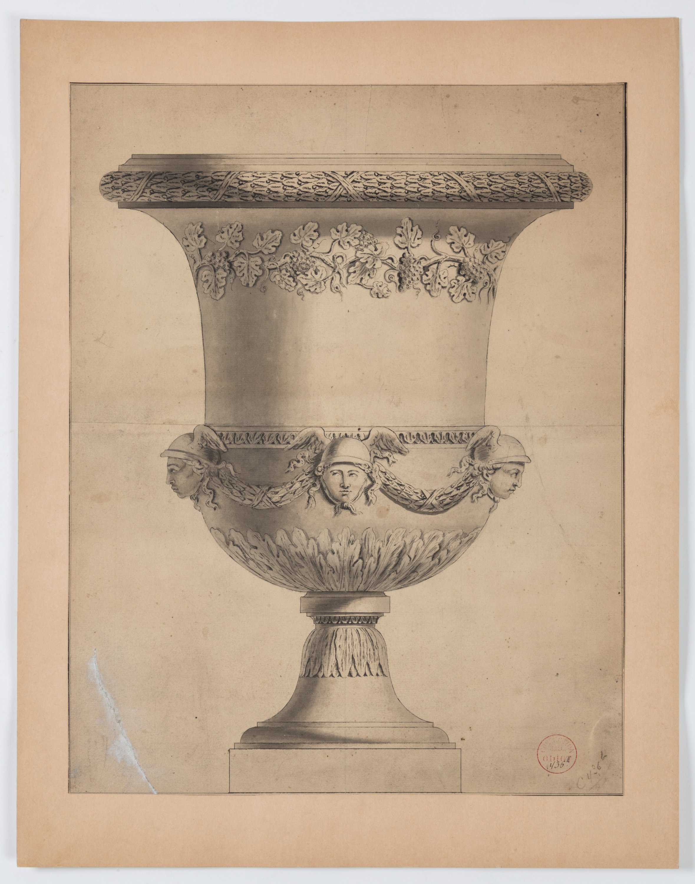 Ce dessin est référencé dans les archives Odiot sous le numéro « 436bis » : « Dessin au lavis. Grand vase.- Socle carré, moulure quart de rond unie.- Pied doucine haute, culot feuilles d’eau moulure raies de cœur et olives.- Corps à ressaut, culot feuilles d’acanthe, panse ornée de guirlandes de lauriers et de trois masques de Mercure ; [ ?] ressaut, moulure rais de cœur ; en haut frise vigne et grosse moulure tore de lauriers ».