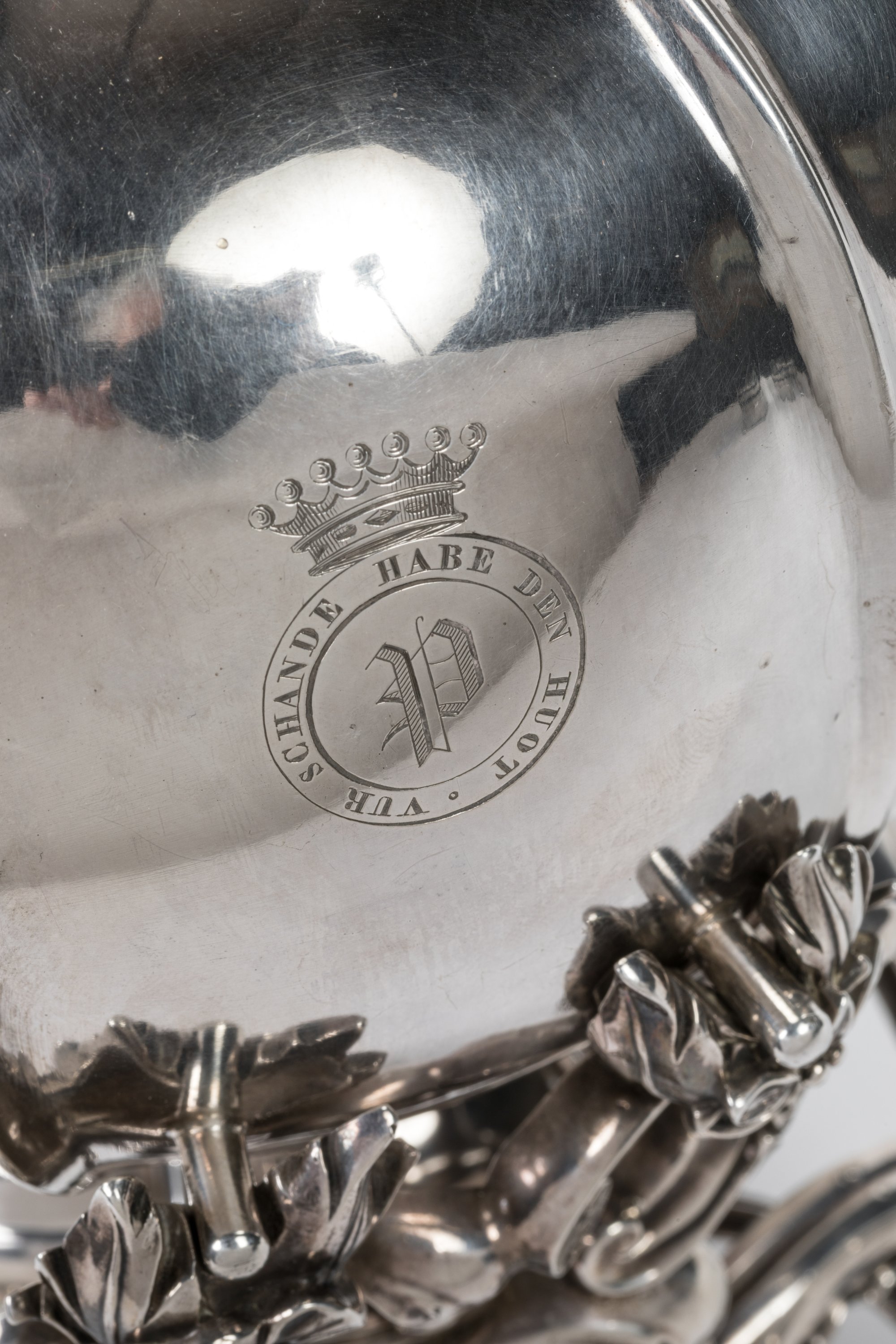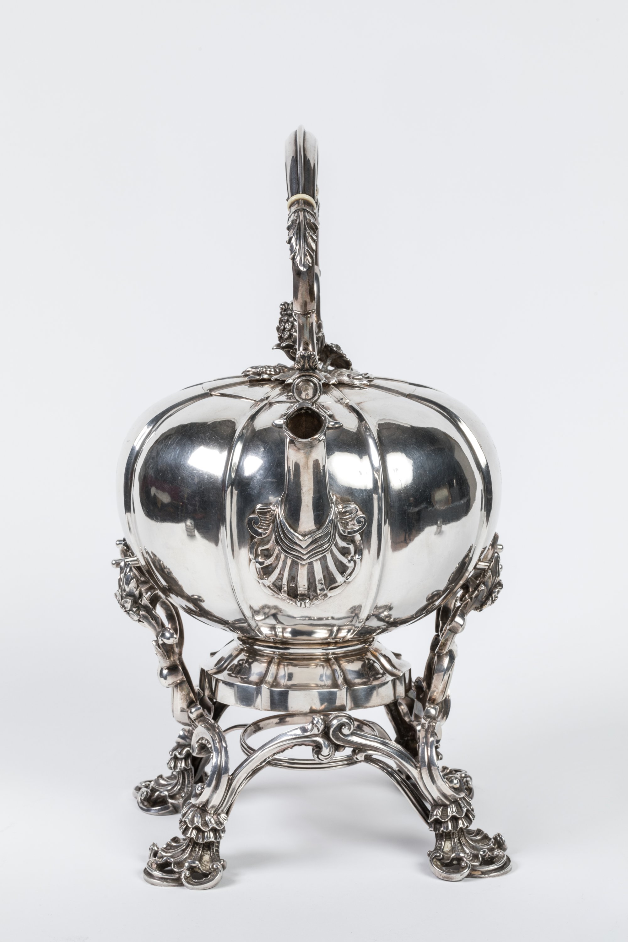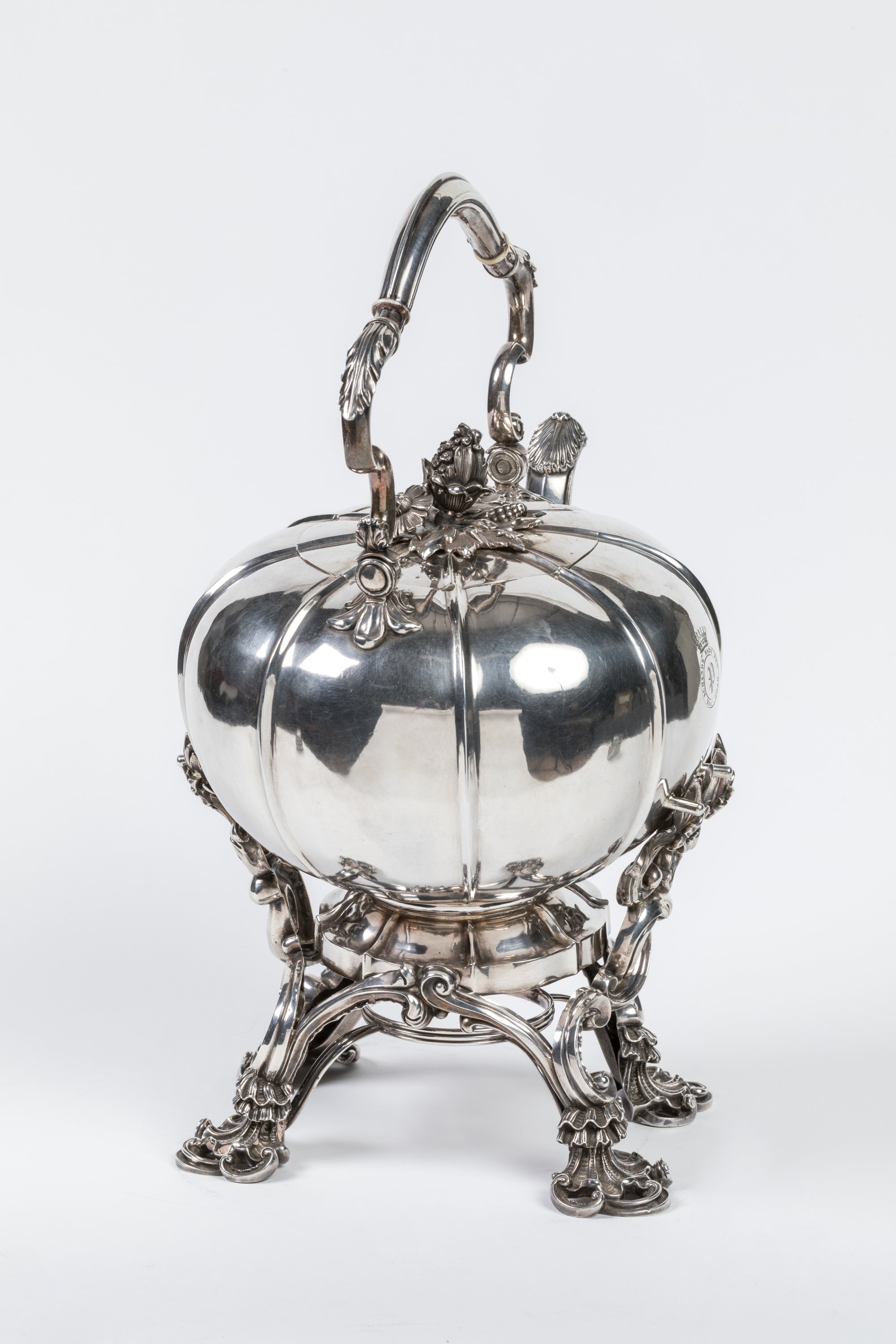 - La bouilloire et son support en argent aux armes de la famille von Pfeffel, avec sa devise "VUR SCHANDE HABE DEN HUOT" ("PRENDS GARDE A LA HONTE"). La prise en grenade éclatée, anses et piétement mouvementés, avec feuilles et coquilles stylisées.
