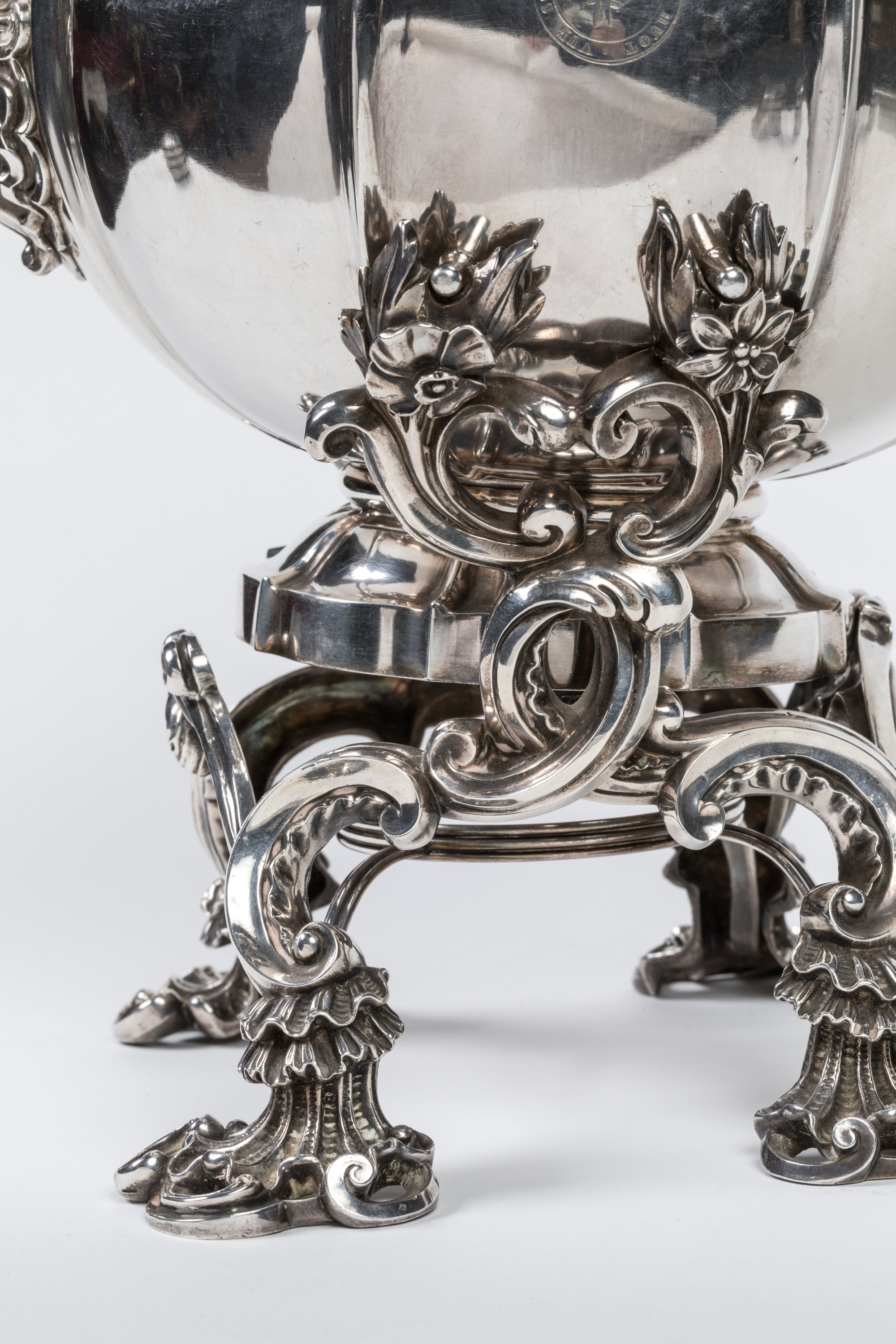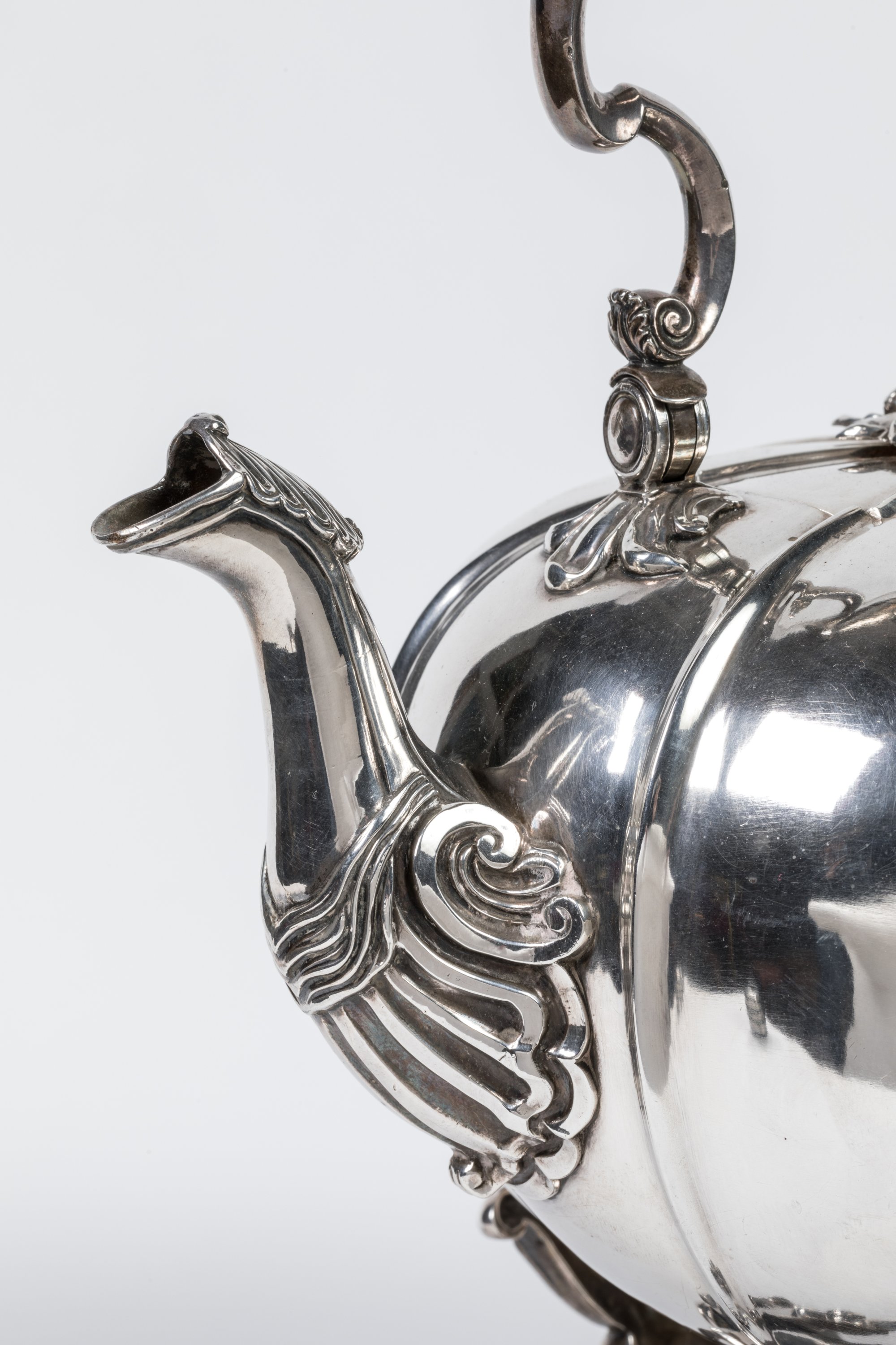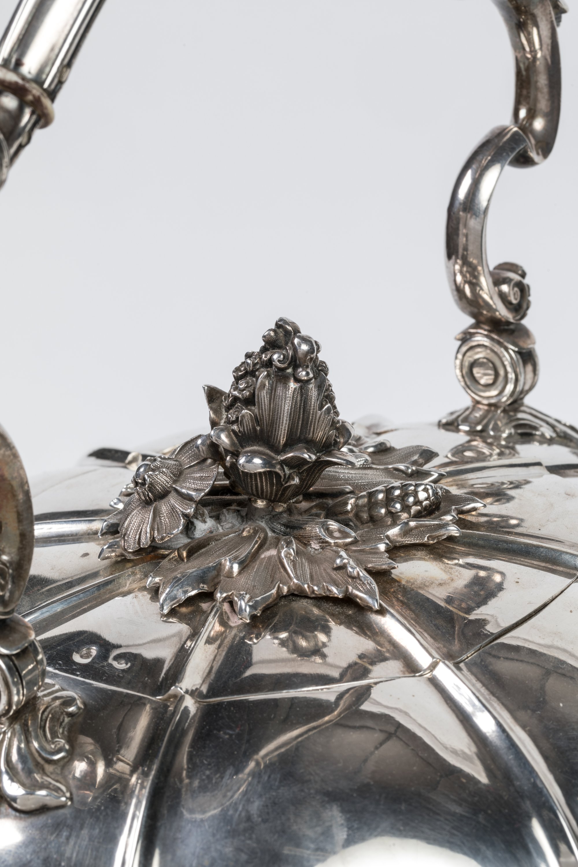 - La bouilloire et son support en argent aux armes de la famille von Pfeffel, avec sa devise "VUR SCHANDE HABE DEN HUOT" ("PRENDS GARDE A LA HONTE"). La prise en grenade éclatée, anses et piétement mouvementés, avec feuilles et coquilles stylisées.