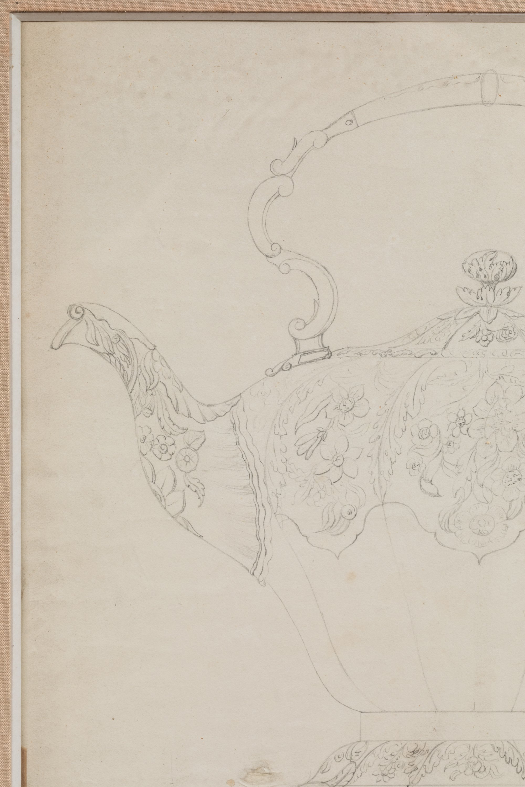 Charles Nicolas Odiot. A silver kettle bearing the von Pfeffel family motto and its preparatory drawing. From the Maison Odiot collections.