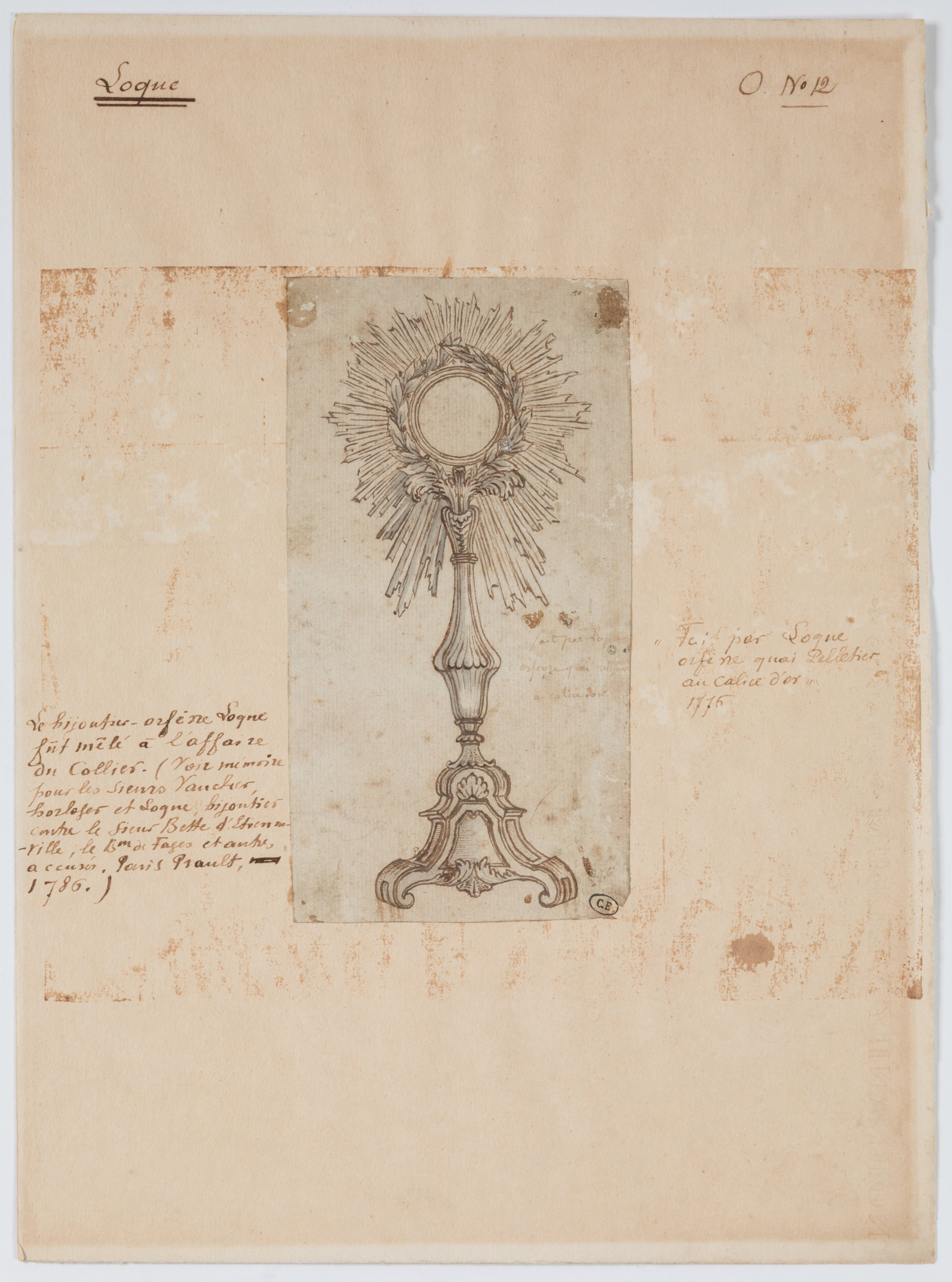 Cachet de collection de Charles Eggiman (1863-1948) en bas à droite. Annotation à l’encre : « Loque / O N°12 / Le bijoutier-orfèvre Loque fût mêlé à l’affaire du collier (voir Mémoire pour les sieurs Vaucher, horloger et Loque, bijoutier contre le sieur Bette d’Etienne-Ville, Baron de Fages et autres accusés. Paris Prault, - 1786) / Fait par Loque orfèvre quai Pelletier au calice d’or / 1776 ».