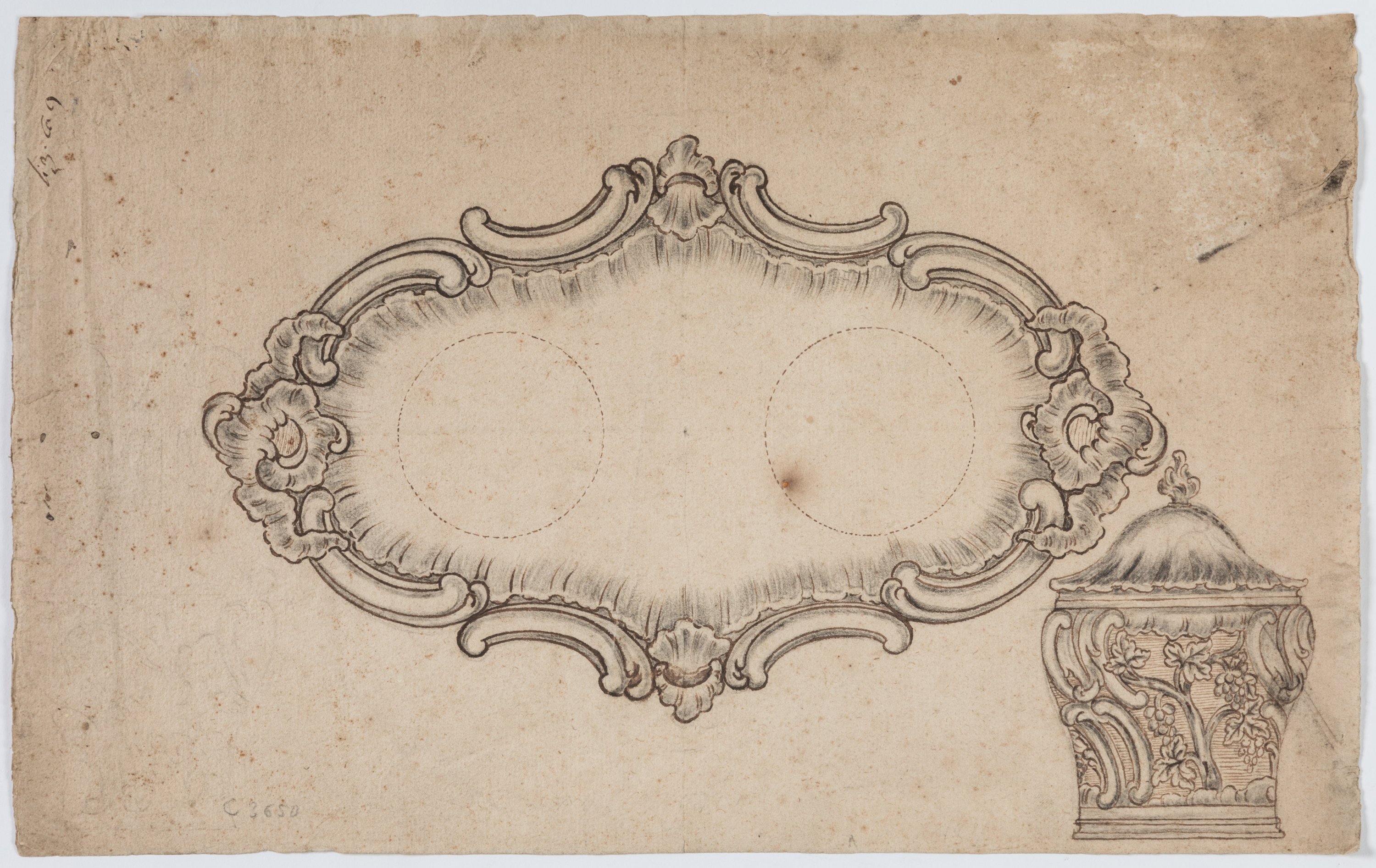 Signé (?) à l’encre en haut à gauche, numéroté au crayon en bas à gauche « C.3650 ». Monogrammé (?) et daté « 18/12/25 » au revers à l’encre, titré, annoté au crayon « pièce d’orfèvrerie du 17ème siècle sucrier et son plateau belle ornementation rocaille ». Signature du collectionneur Charles Eggiman.