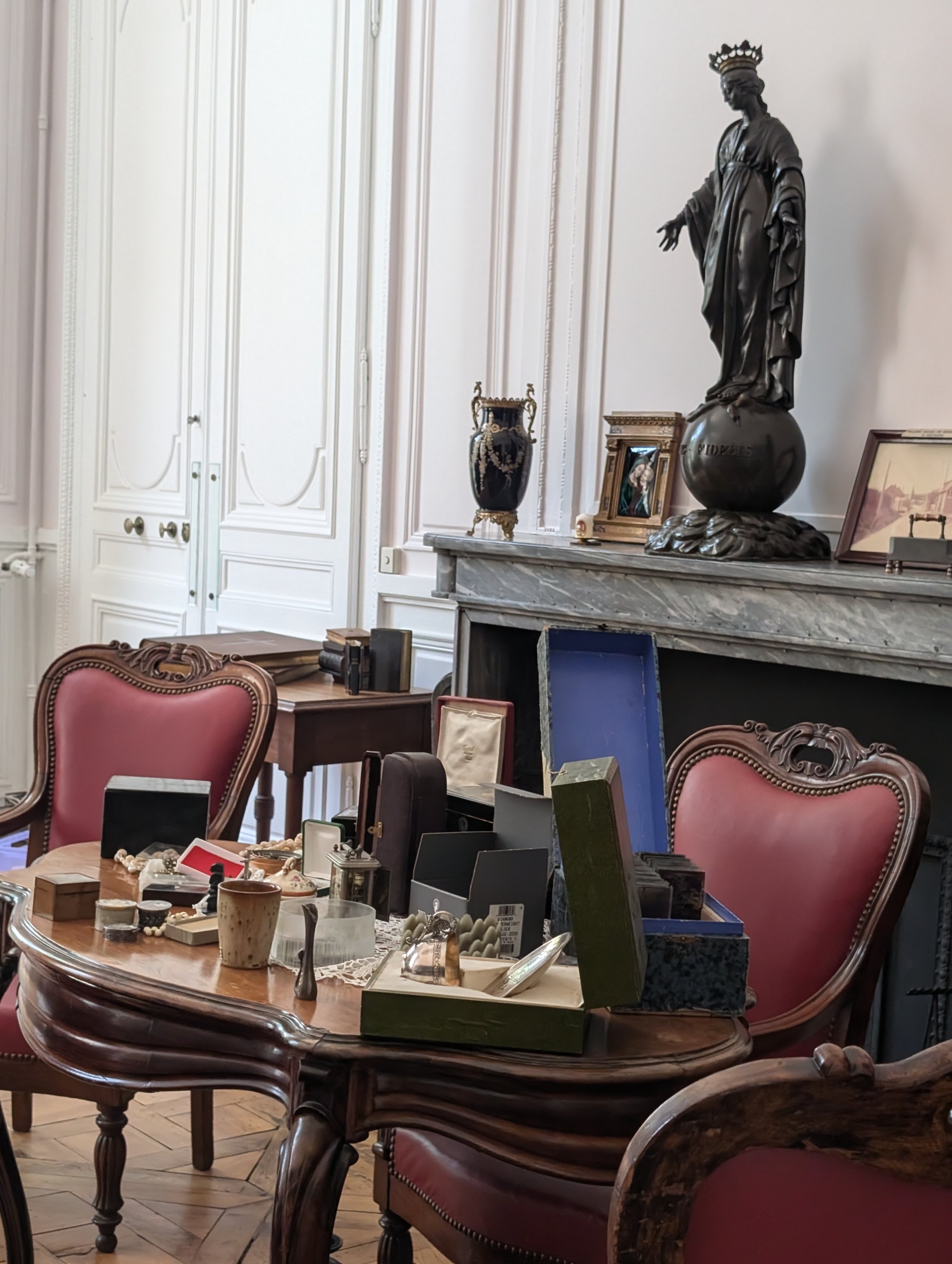 Contenu des greniers de la maison mère de la congrégation des soeurs du Bon Secours : vases d'autel, crucifix, lampes à pétrole, cadres, machine à tuyauter les coiffes, etc.