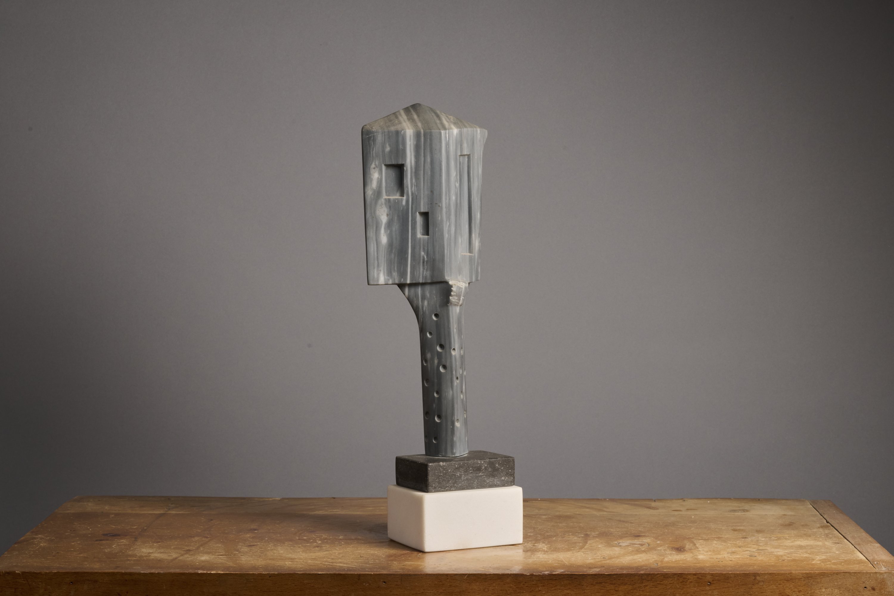Socle de marbre gris posé sur une base en pierre blanche de Belgique.