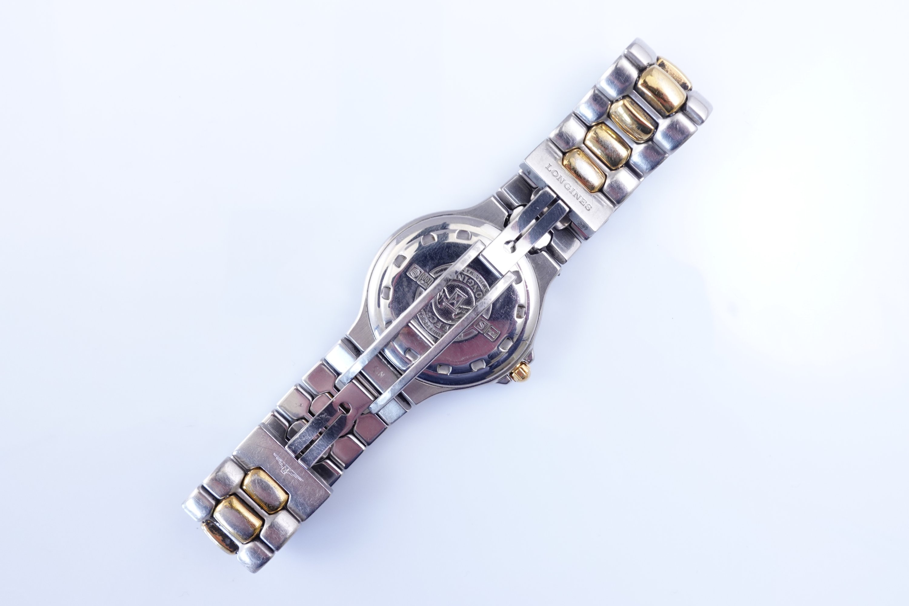 Boîtier en acier inoxydable et doré, cadran émaillé blanc avec index appliqués pour les heures et chemin de fer pour les minutes, lunette rayonnante, quantième à trois heures. Mouvement à quartz.