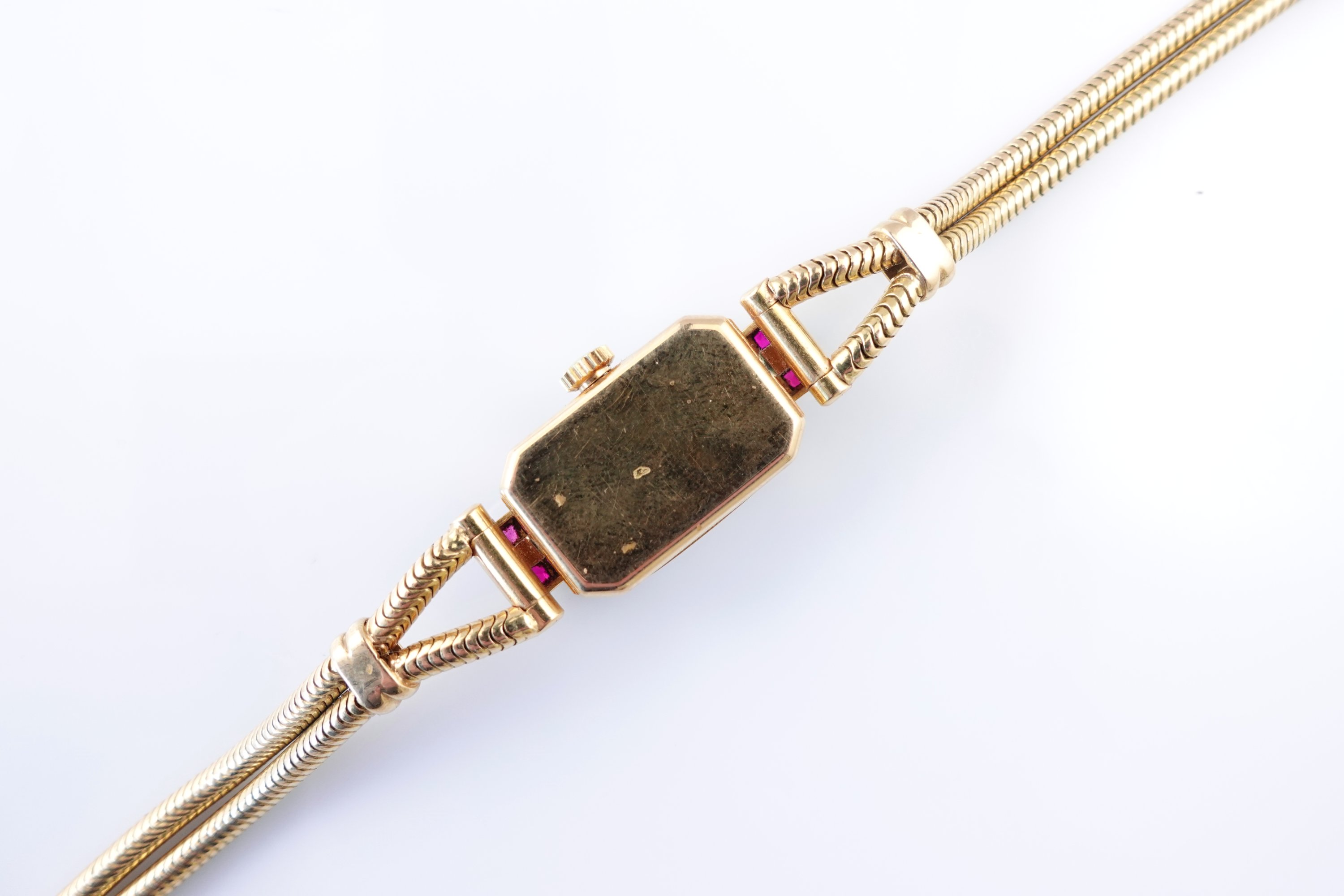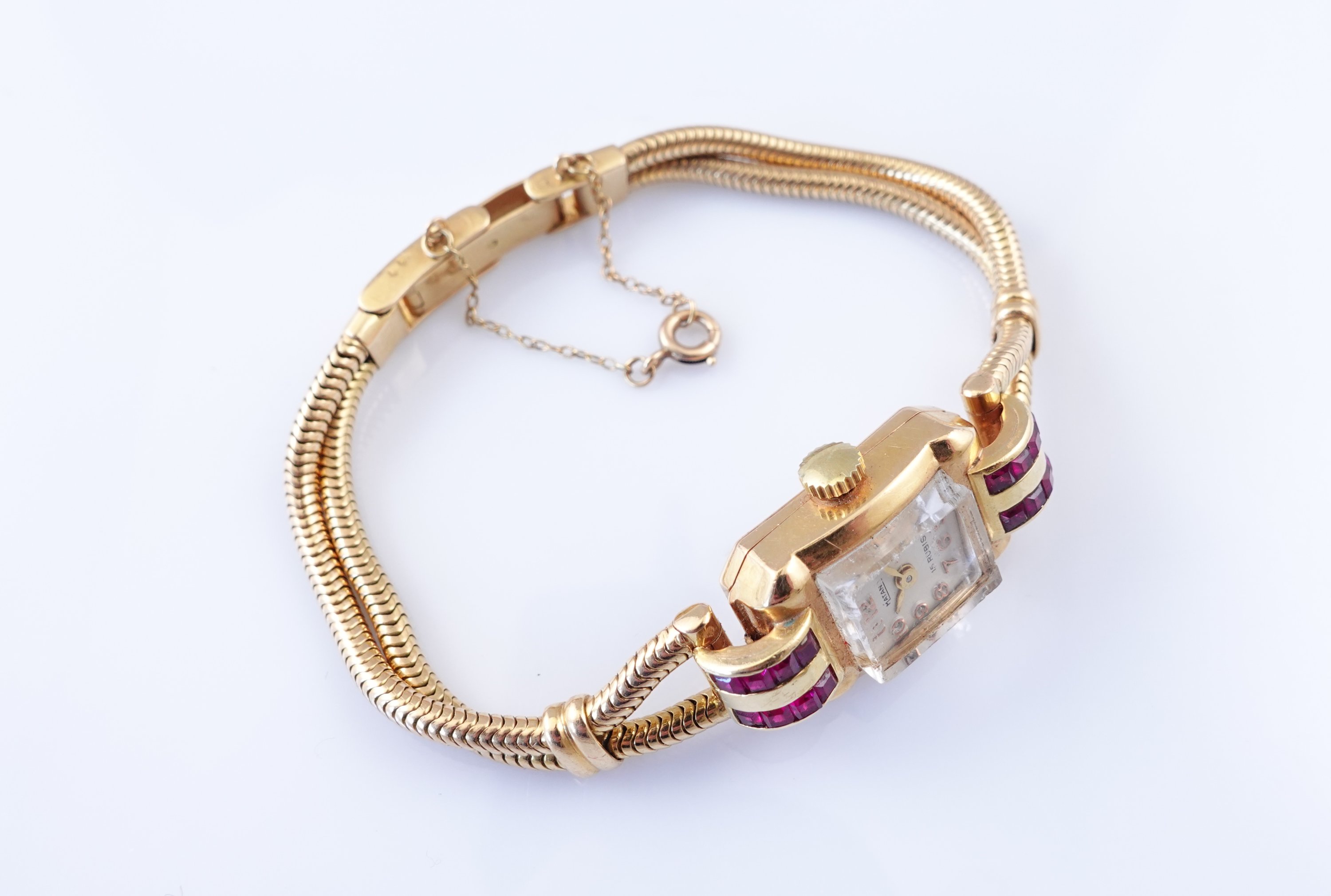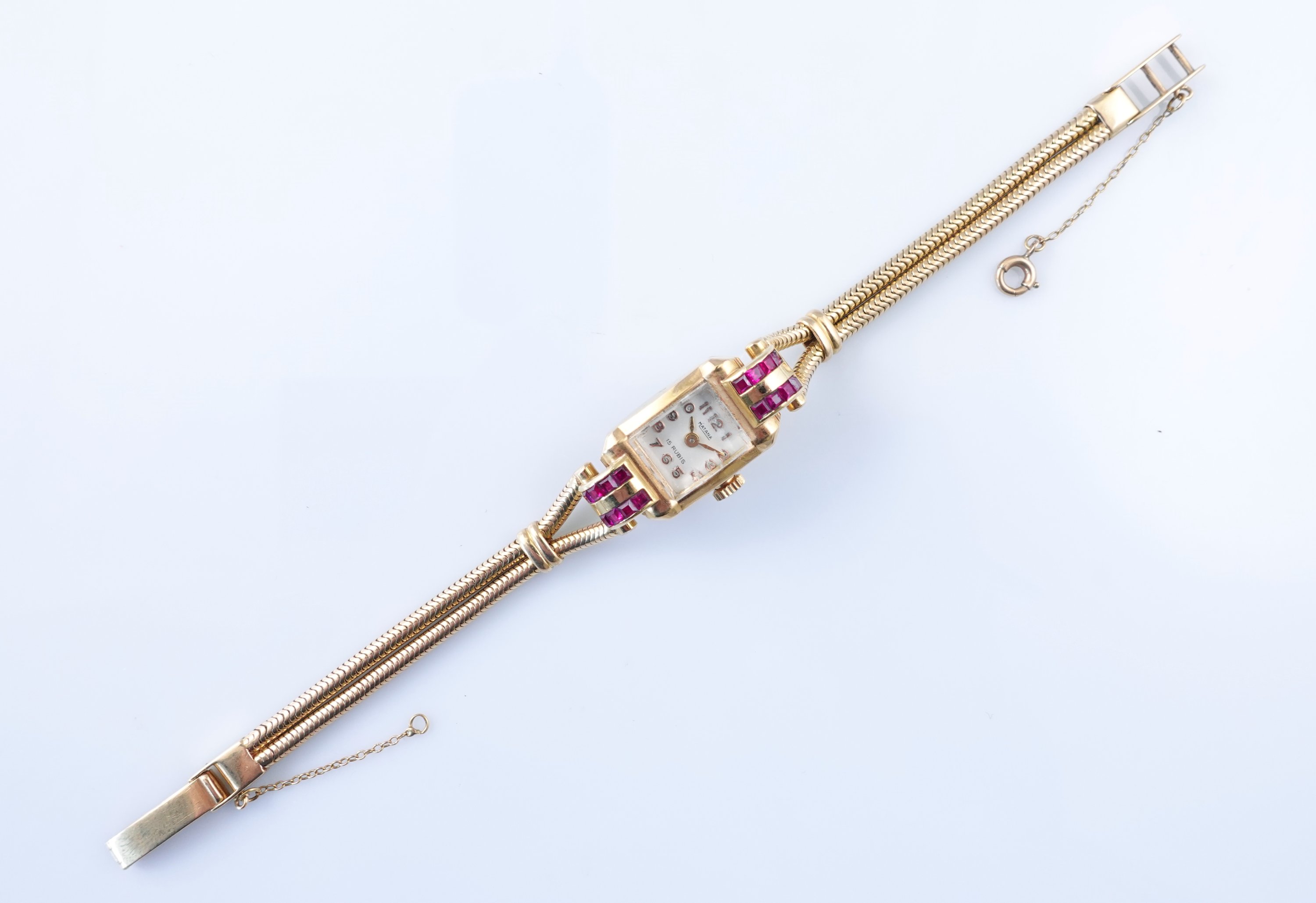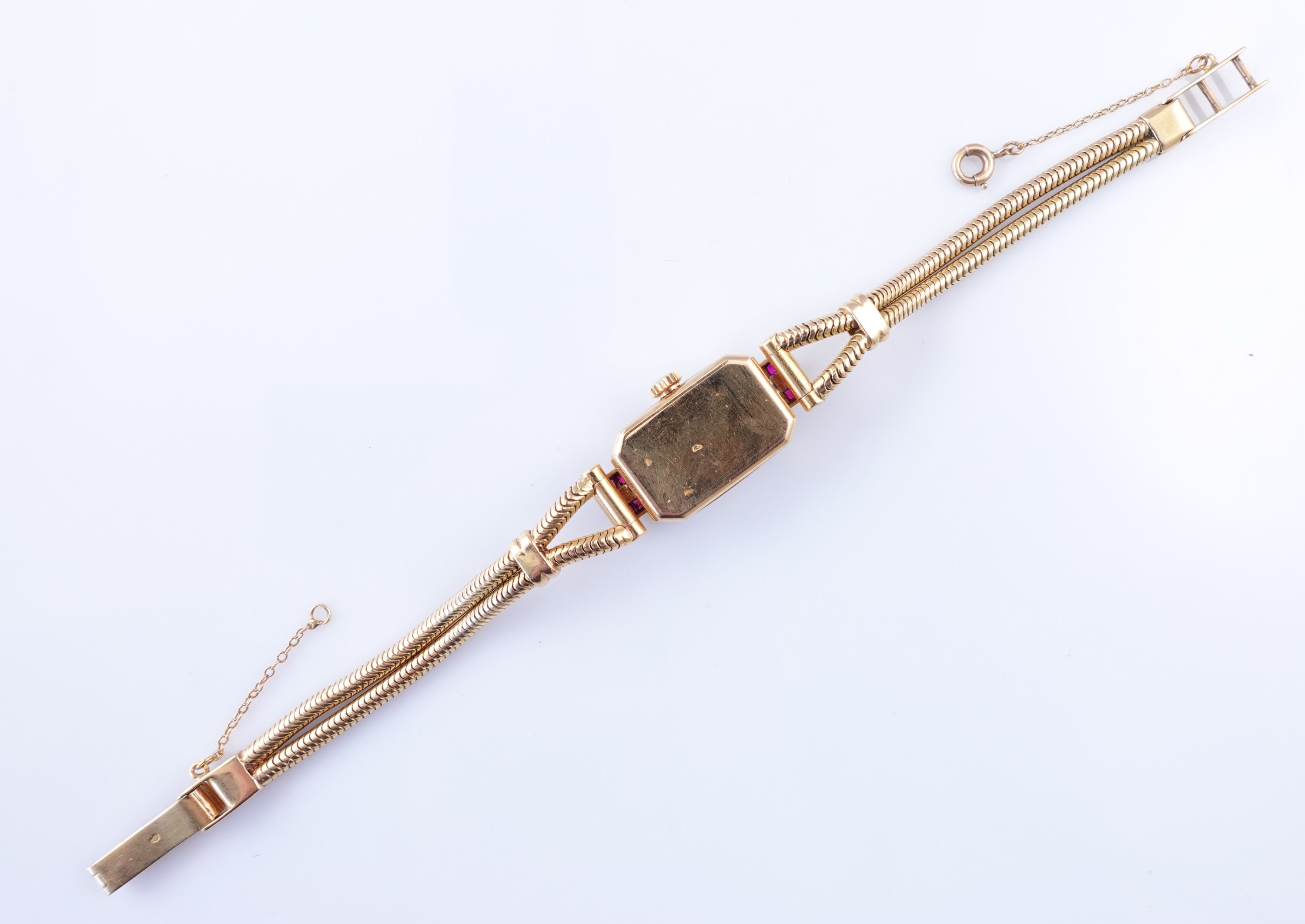 en or jaune 750 millièmes, les cornes ornées de rubis en taille carrée, cadran émaillé blanc signé "Matana 15 rubis" indiquant les heures en chiffres arabes. Bracelet en or à mailles serpent, boucle double déployante et chaînette de sécurité. Mouvement mécanique à remontage manuel.