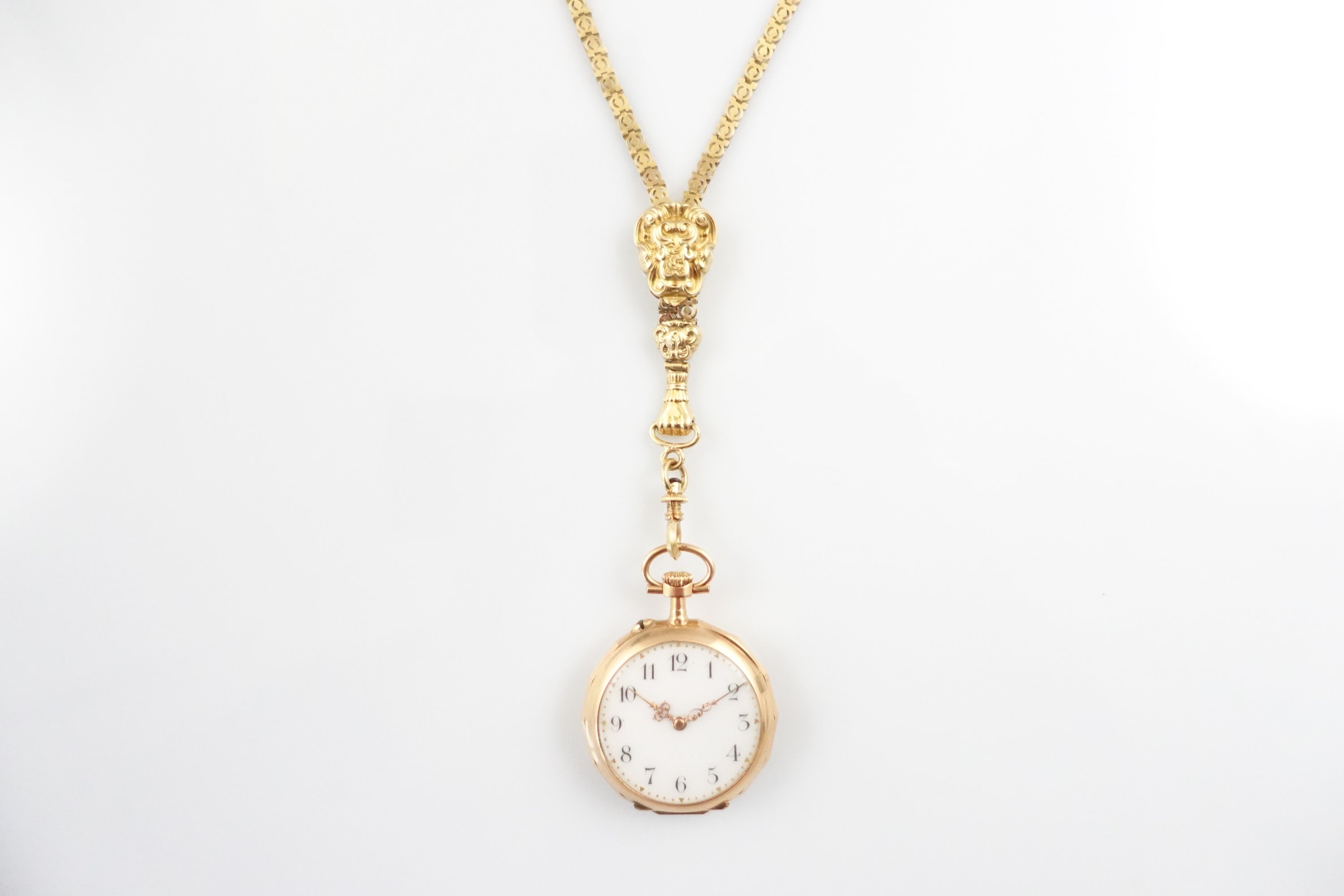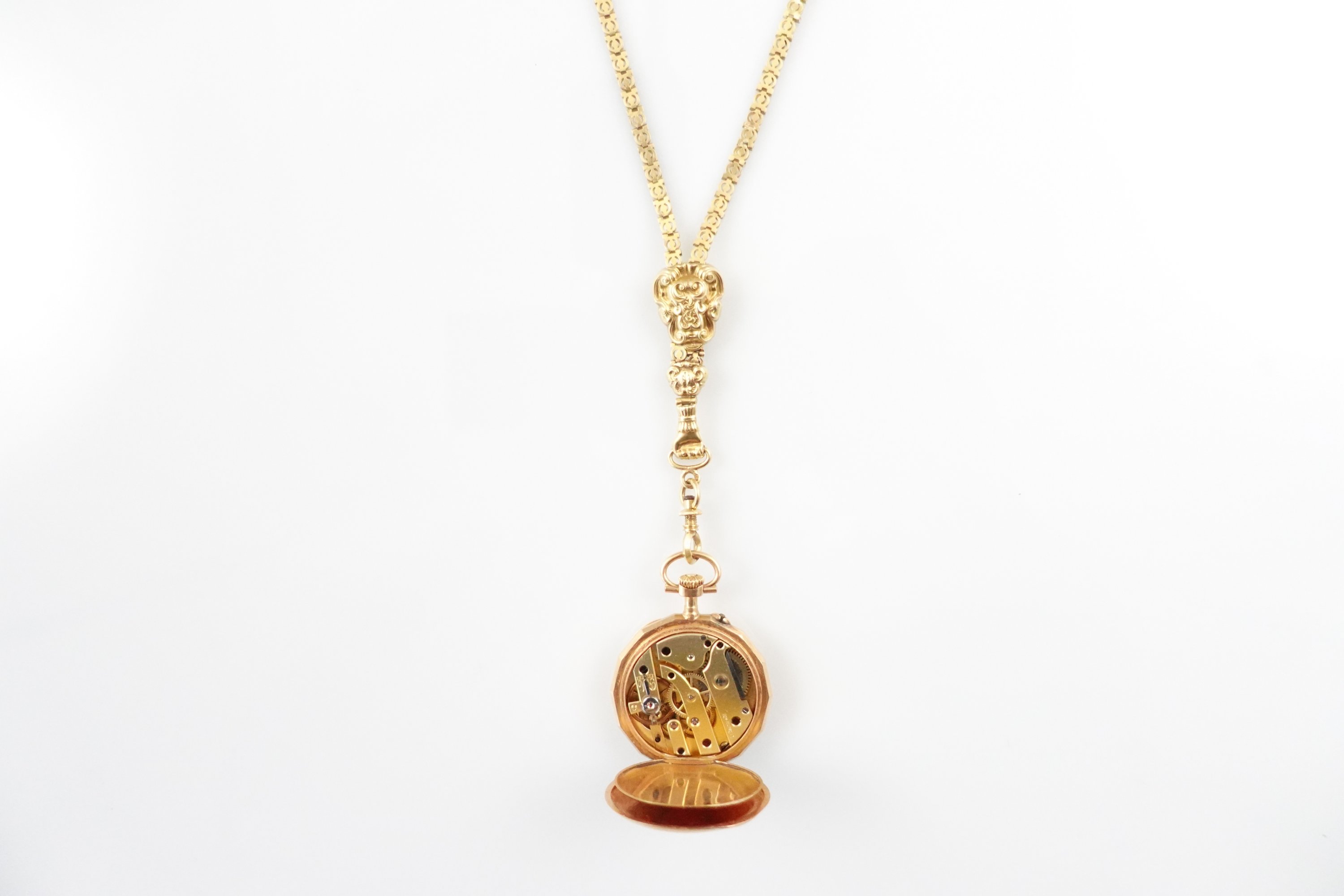 - La montre à boîtier facetté présente un cadran émaillé avec les heures en chiffres arabes. Remontoir à midi. Cache-poussière intérieur en or. Numérotée "22240". Diam. 30 mm.