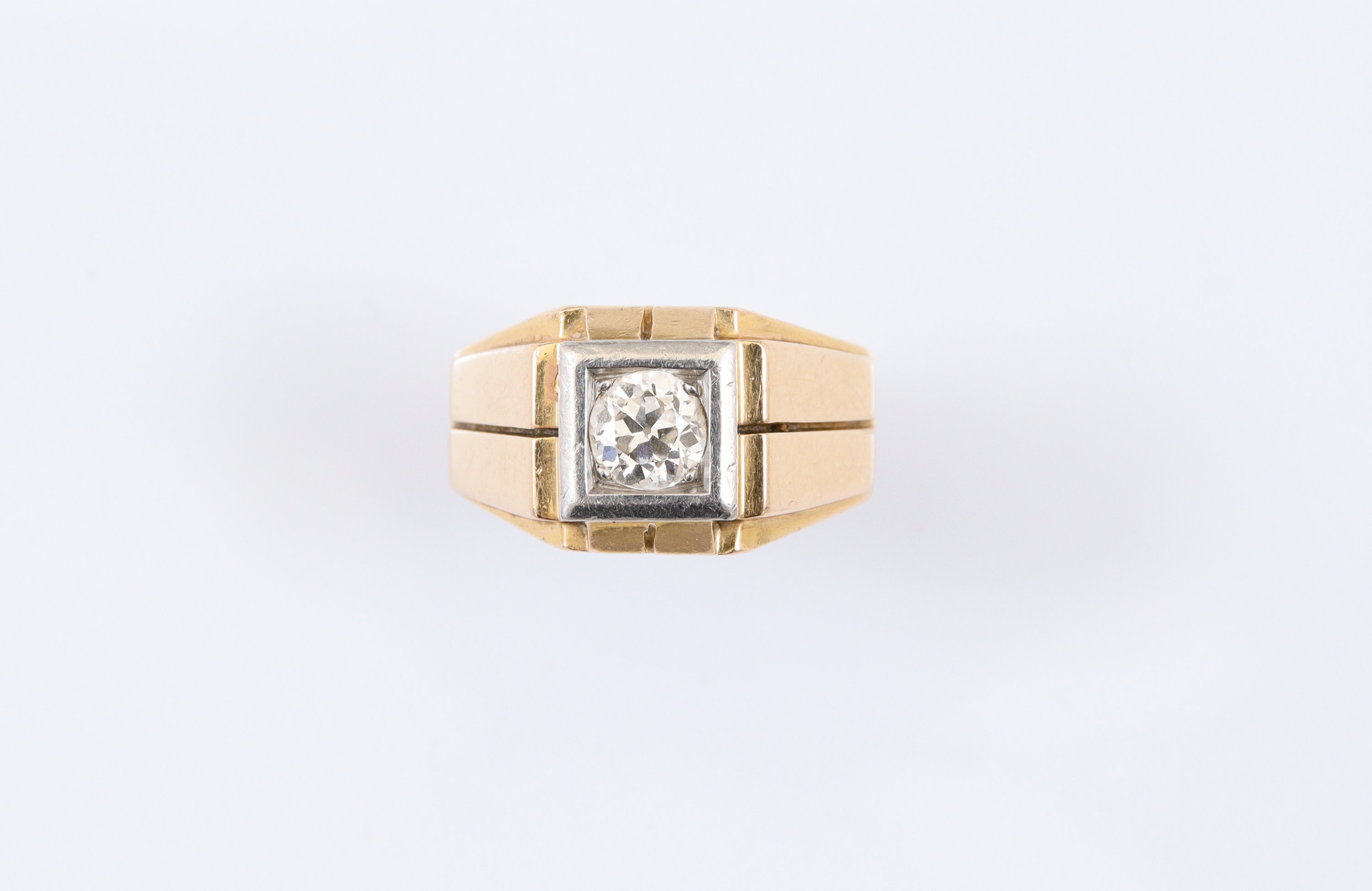 en or jaune 750 millièmes et platine au chaton de forme géométrique orné d'un diamant de taille ancienne d'environ 0,7 ct.
