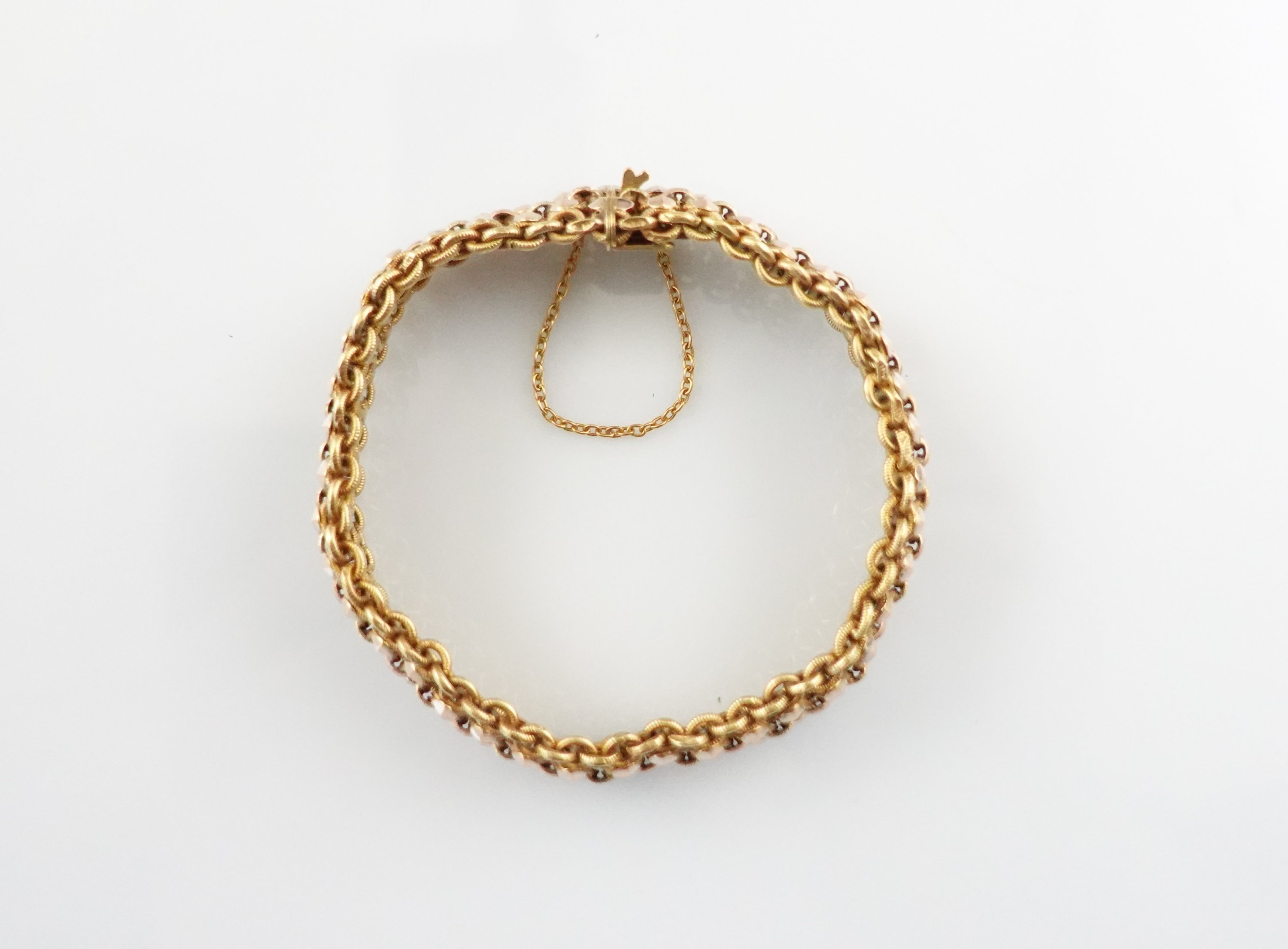 en or 750 millièmes plusieurs tons à mailles articulées. Chaînette de sécurité.