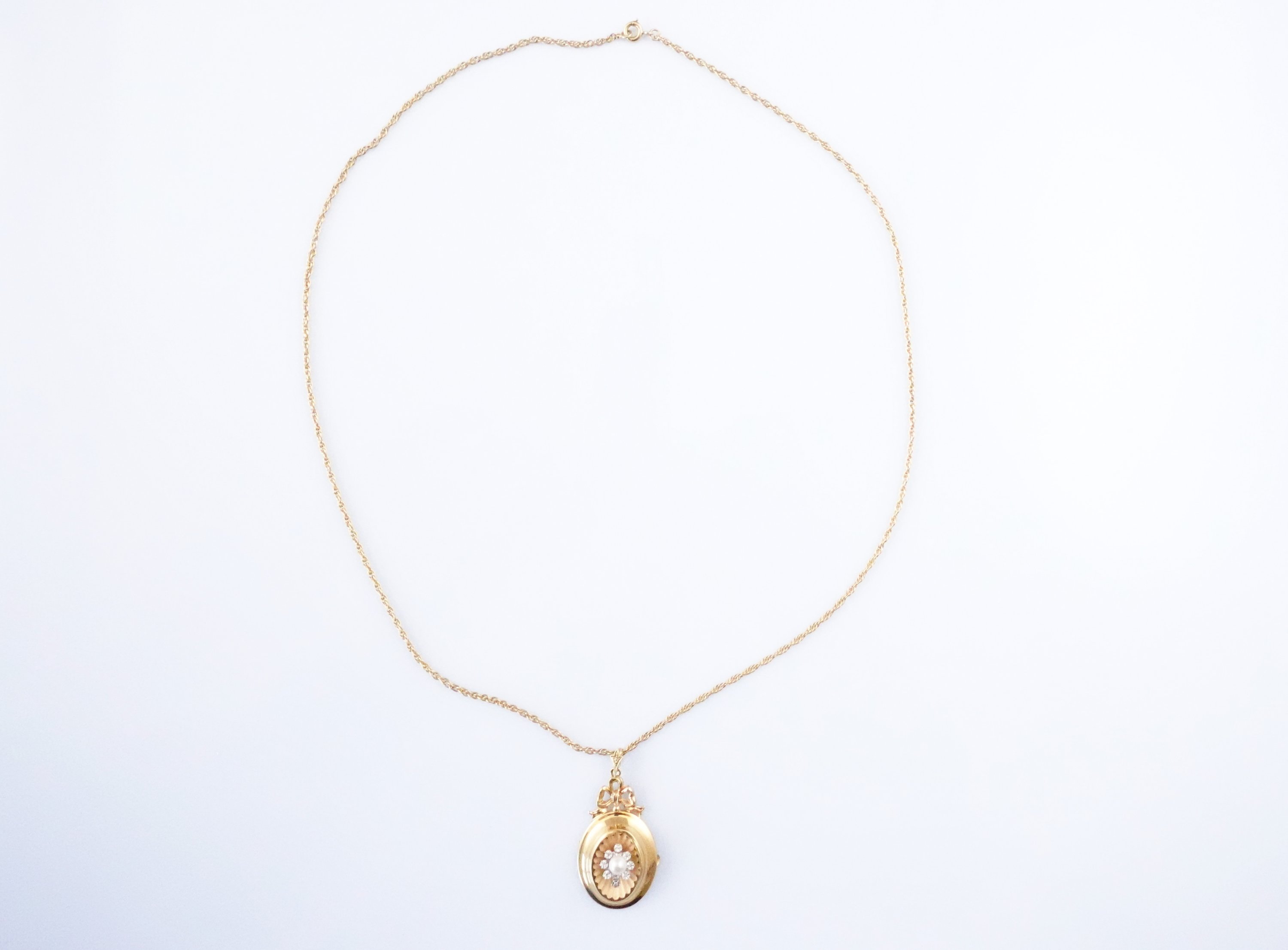 en or jaune 750 millièmes orné d'une perle dans un entourage de huit brillants, rentenu par une chaine en or jaune 750 millièmes à mailles torsadées.