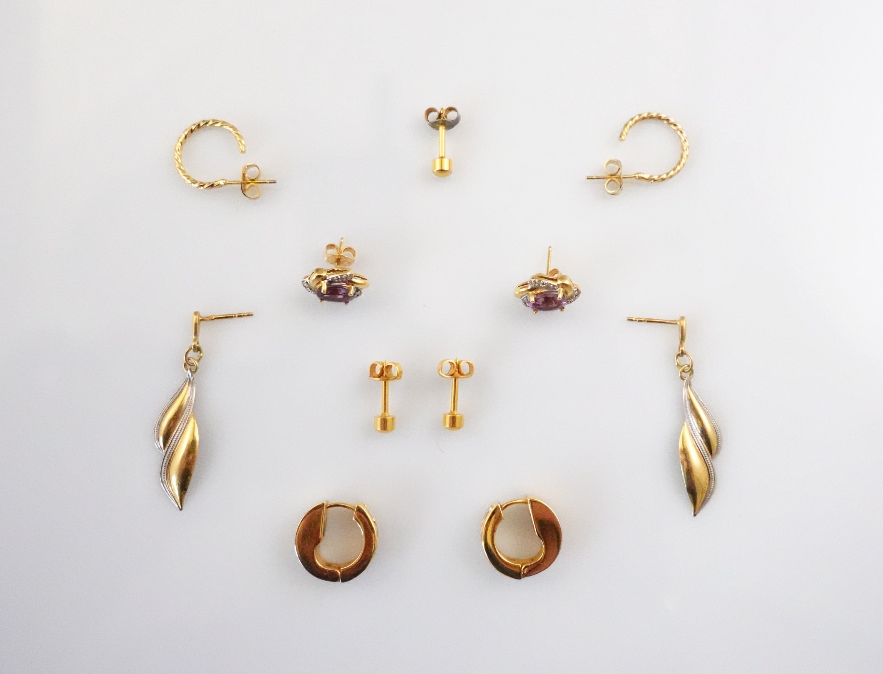 en or jaune 750 millièmes, dont une paire ornée de pierres mauves, une autre de pierres blanches.