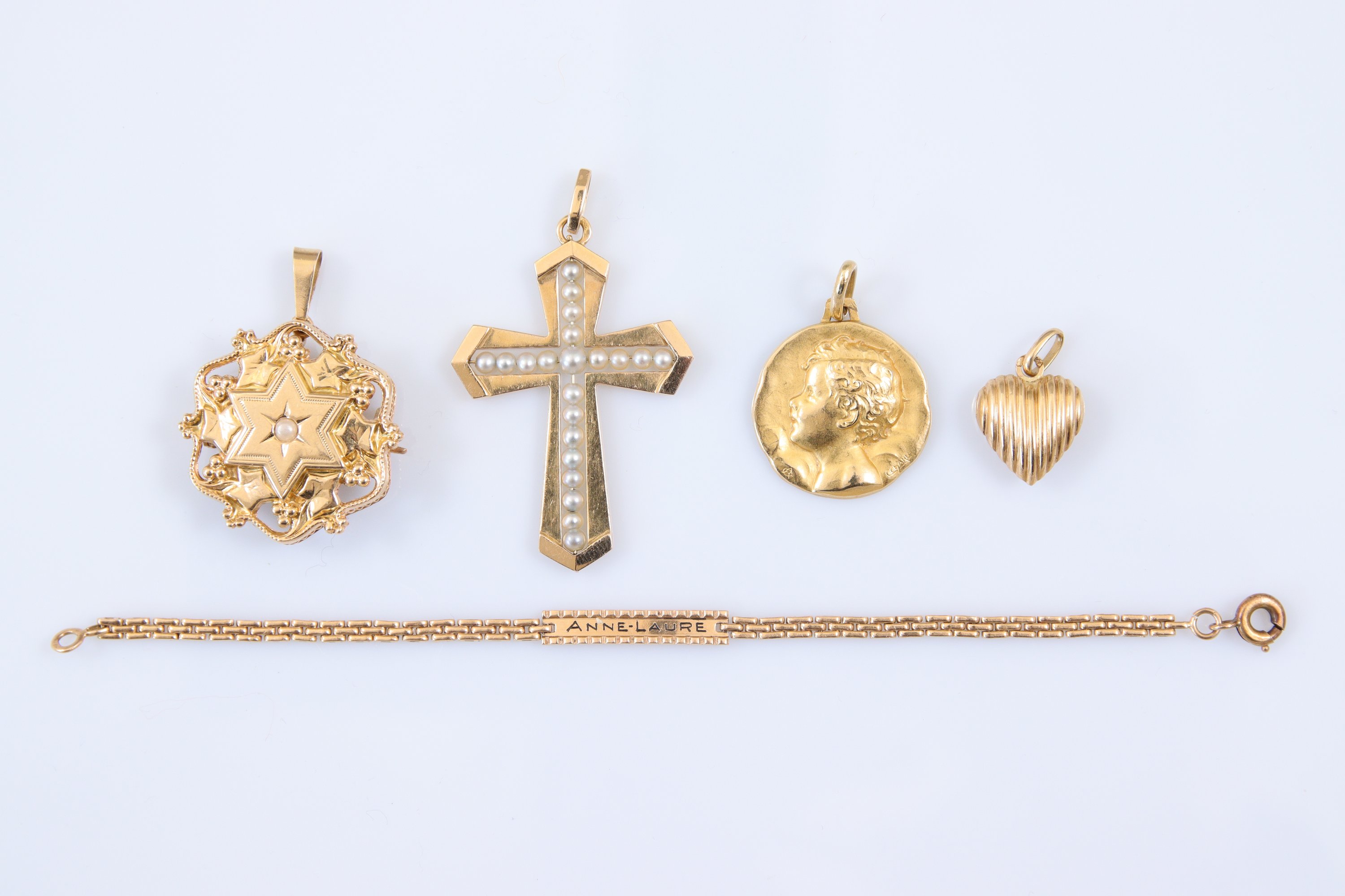 Une gourmette, une broche et trois pendentifs