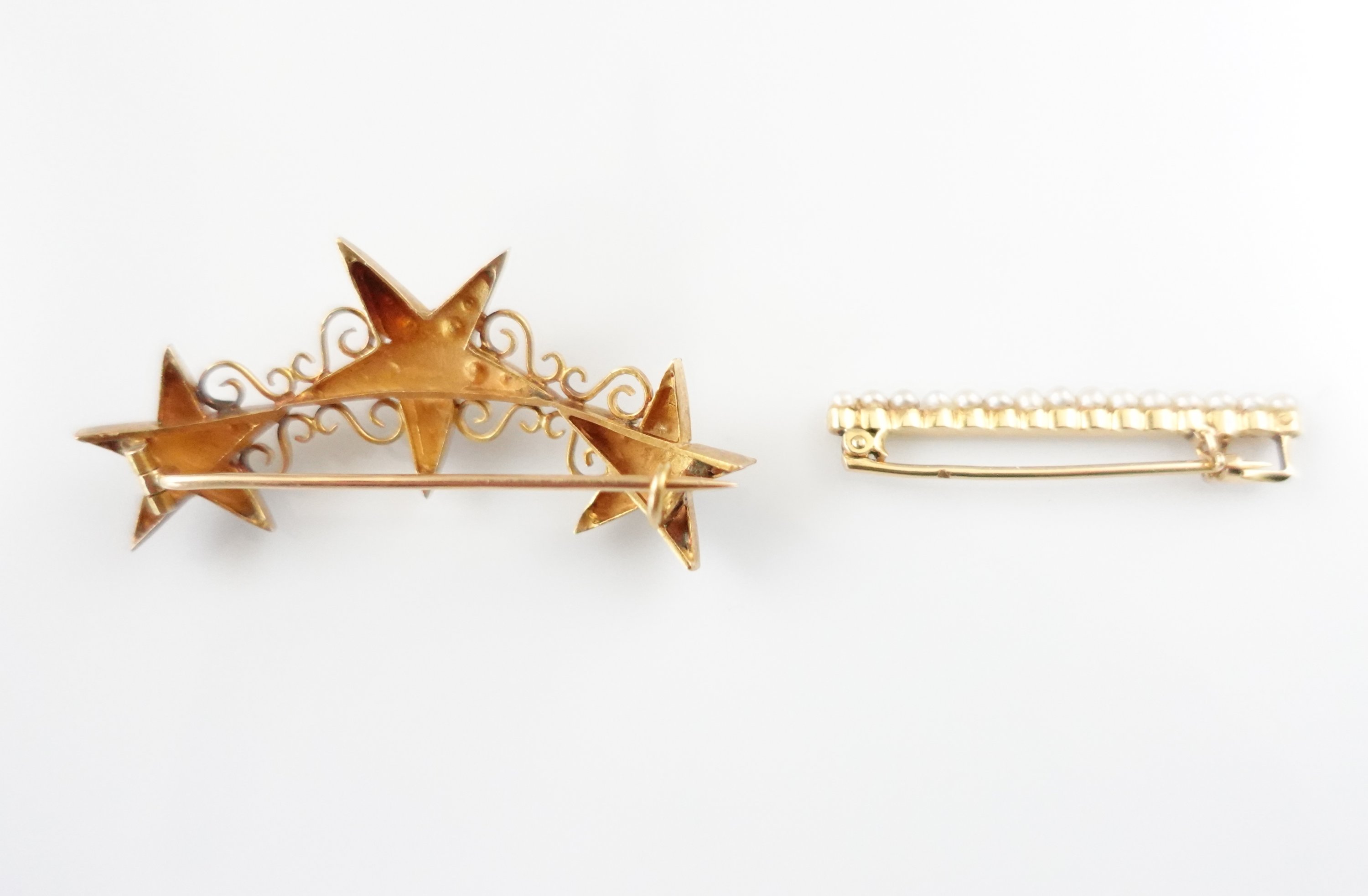- La première à trois étoiles serties de brillants et en leur centre de perles, dans un entourage de rinceaux (manques). Long. 5 cm. Poids brut : 7,4 g.