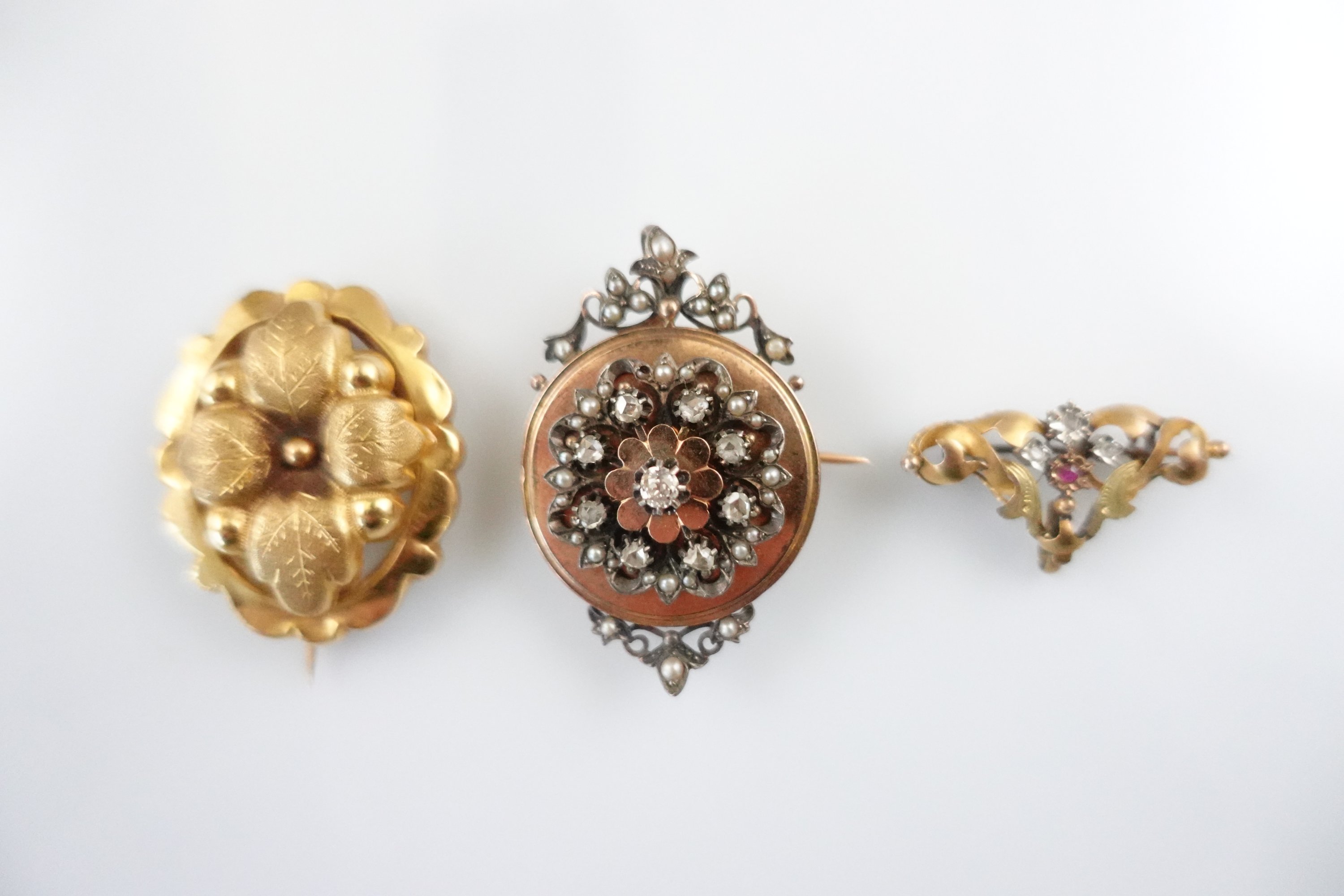 - Une broche-pendentif en or 750 millièmes et argent de forme ronde, sertie d'une pierre blanche entourée de huit autres pierres incolores et petites perles. La béllère dans un entourage de rinceaux. Epingle en or. Diam. 27 mm. Poids brut : 8,2 g.