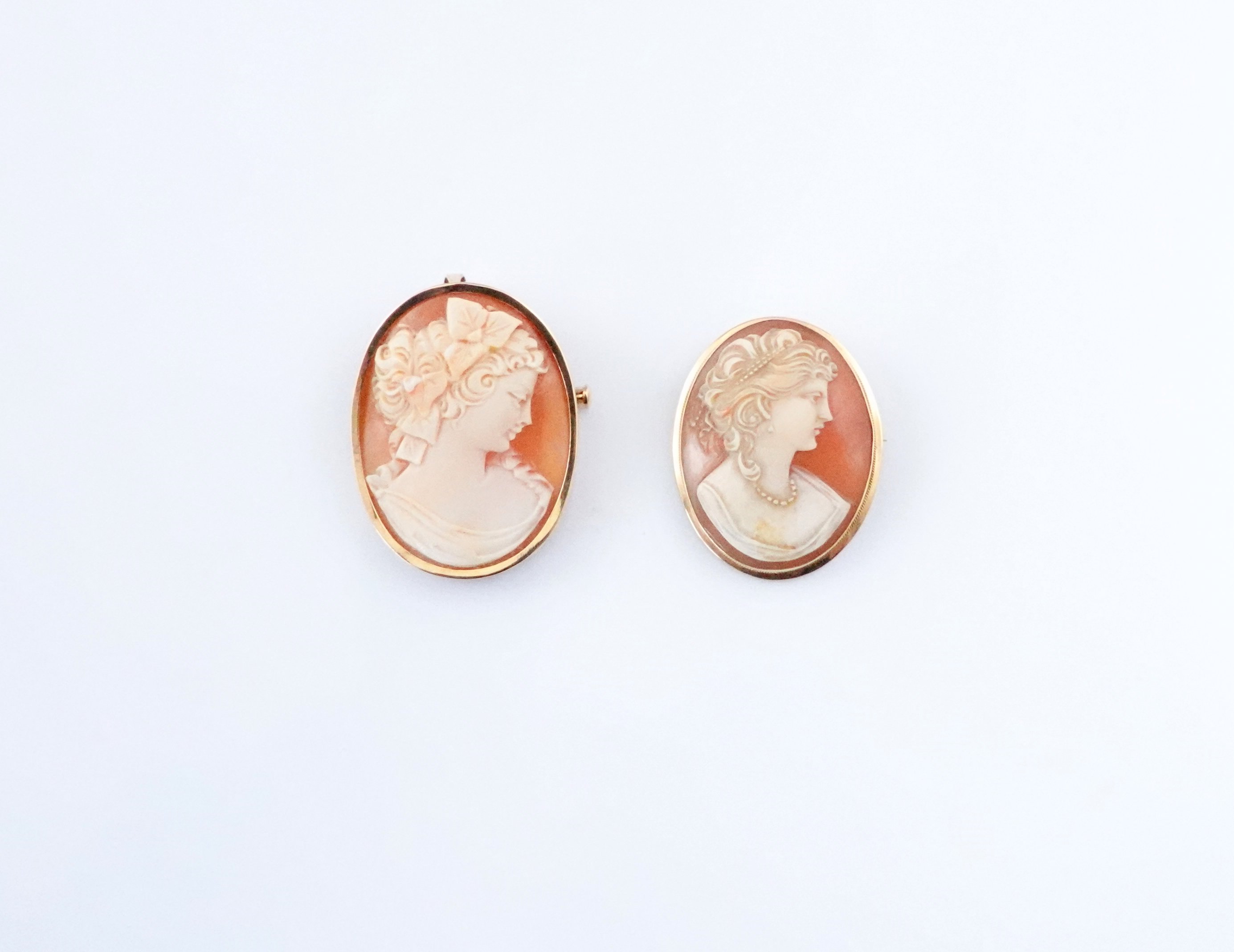 à monture en or jaune 750 millièmes sertie de camées sur coquillage figurant des profils de femmes. L'une pouvant former pendentif.