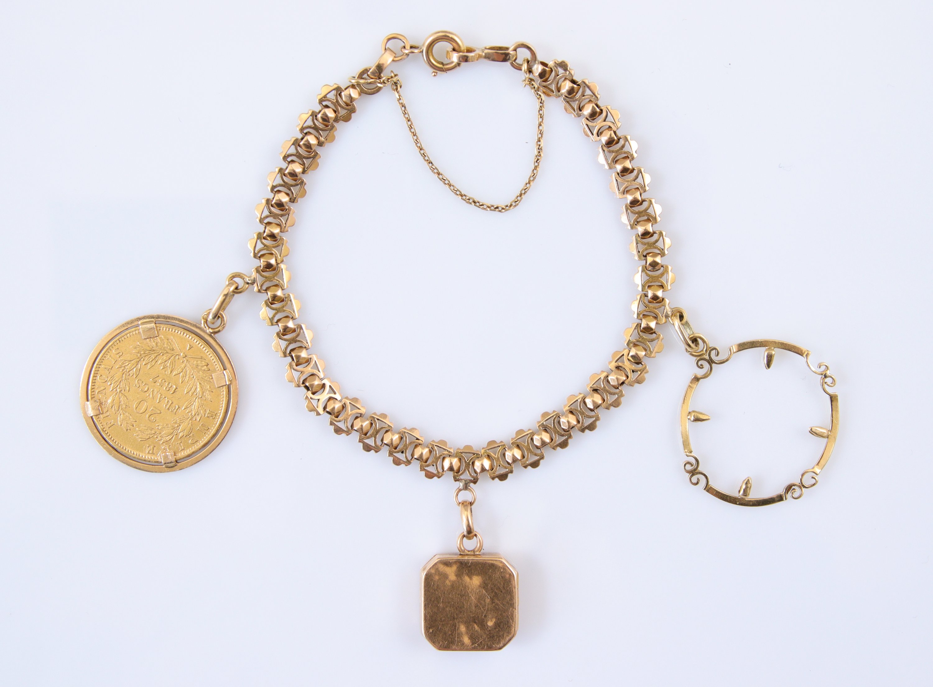 en or jaune 750 millièmes serti d'une pièce de 20 francs or Napoléon tête nue de 1857, d'une breloque porte-photo et d'un autre emplacement pour une pièce.