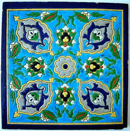 BORDEAUX. 2 carreaux. Fleurs et décor Iznik polychrome, marque J. VIEILLARD et Cie BORDEAUX D.61, 205 x 205 mm ; Guerrier pointant du doigt, bleu, Jules Vieillard, Marque JV BORDEAUX IVO, 201 x 201 mm.